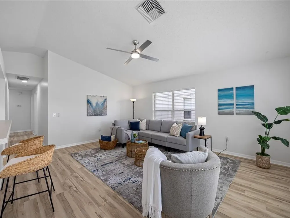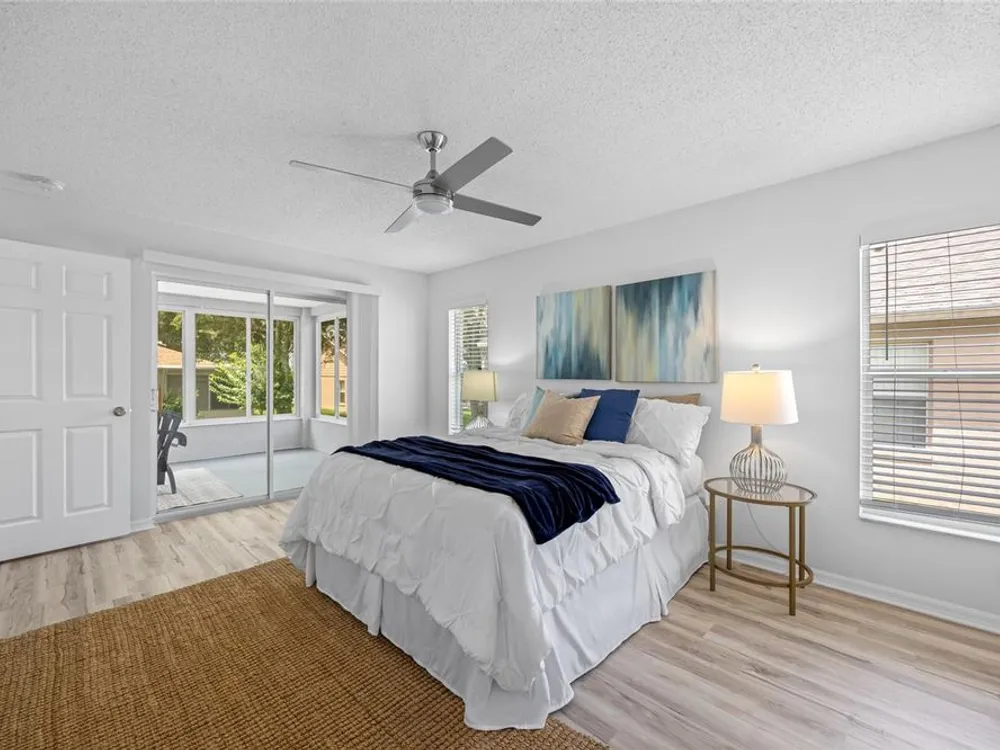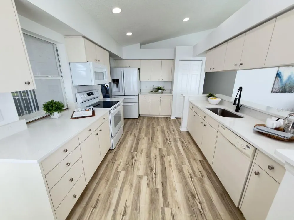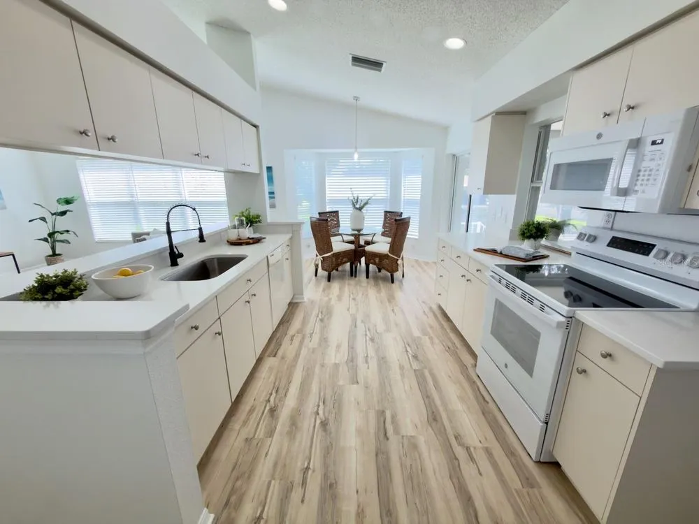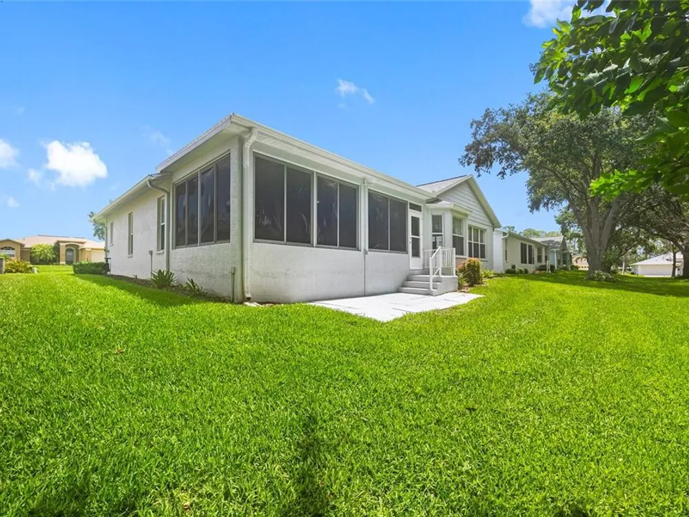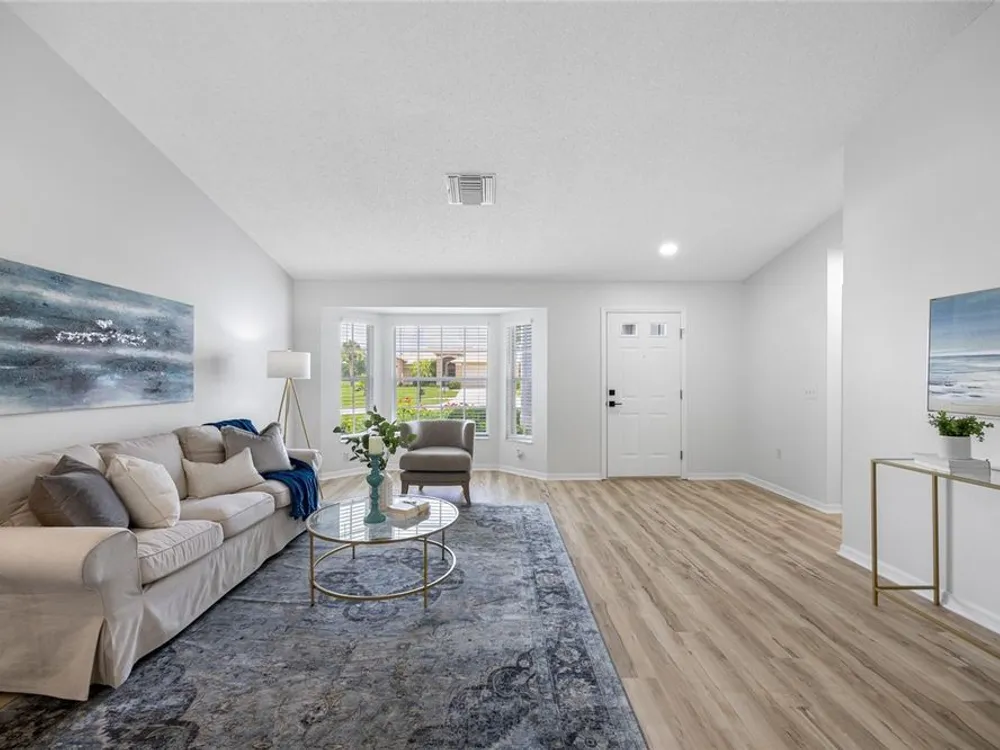 Welcome to your beautiful home in the highly desirable 55+ golf community of Heritage Pines. This spacious 3-bedroom, 2-bathroom residence with a 2-car garage has been thoughtfully refreshed and is ready for its new owners. Recent improvements include a brand-new roof, luxury vinyl plank flooring, fresh interior paint, and stylish new lighting and ceiling fans throughout, creating a modern and move-in ready feel. The home features soaring ceilings and a split-bedroom layout for comfort and privacy. The primary suite boasts dual walk-in closets and an en-suite bath with a dual-sink vanity and walk-in shower. Two guest bedrooms, each with new carpeting, share a full bath on the opposite side of the home. At the heart of the home, the kitchen offers brand new quartz countertops, newer appliances, a breakfast bar, closet pantry, and a sunny dinette area that flows seamlessly into the family room. A highlight of this property is the large, fully enclosed Florida room, complete with HVAC vents, giving this home 2,111 square feet of total cooled living space. Accessible from the dining room, dinette, and primary suite, this versatile space is perfect for entertaining or simply relaxing. Additional features include an indoor laundry room with washer and dryer included. Heritage Pines is a gated, amenity-rich, pet-friendly community offering an 18-hole championship golf course, clubhouse with restaurant and bar, fitness center, heated pool and spa, and courts for tennis, pickleball, bocce, and much more. The HOA fees cover cable, internet, lawn care, and irrigation, ensuring a low-maintenance lifestyle. Don’t miss the opportunity to make this home yours. Be sure to explore the 3D virtual tour and schedule your private showing today!