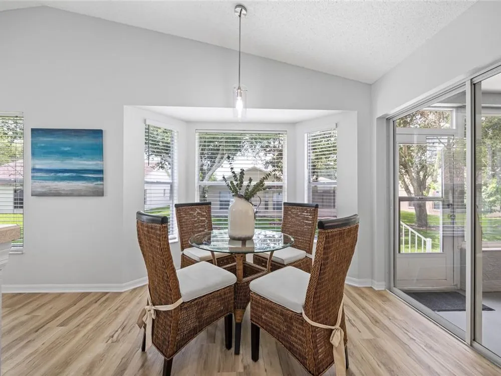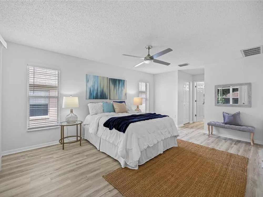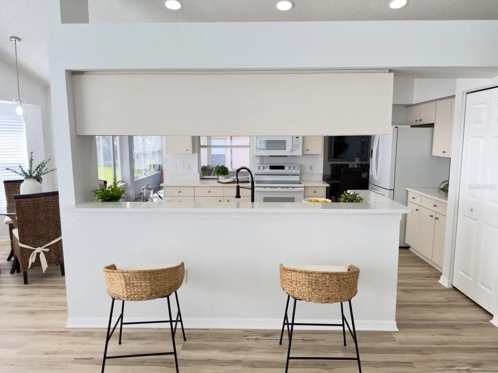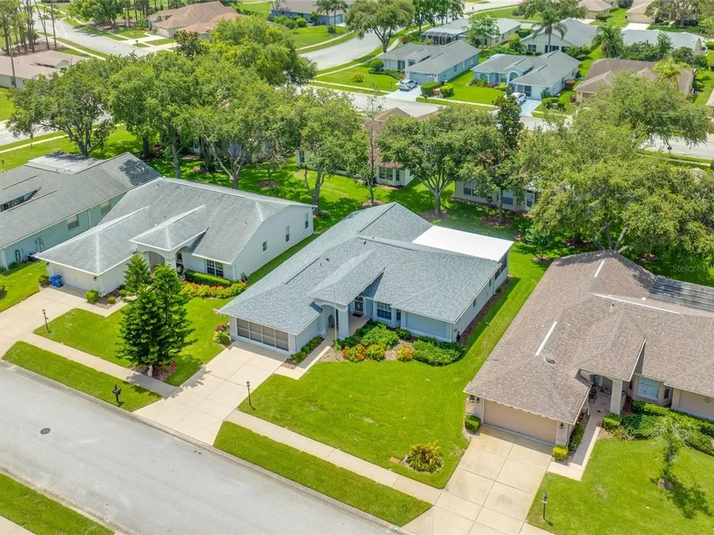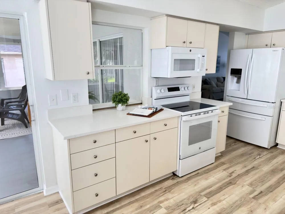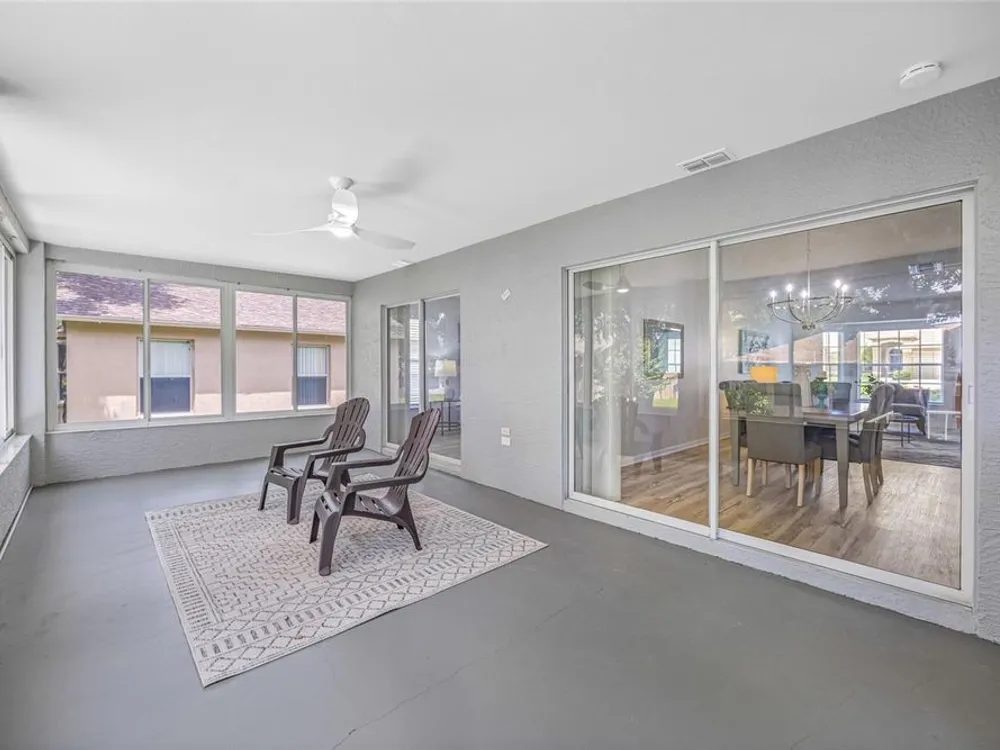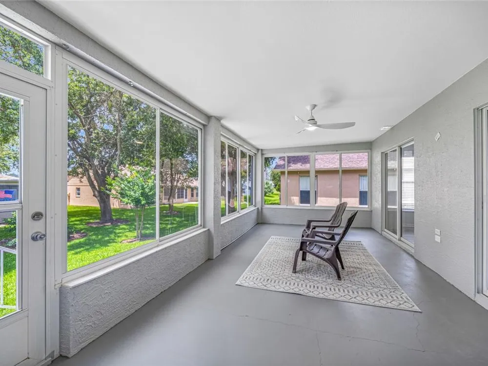 Welcome to your beautiful home in the highly desirable 55+ golf community of Heritage Pines. This spacious 3-bedroom, 2-bathroom residence with a 2-car garage has been thoughtfully refreshed and is ready for its new owners. Recent improvements include a brand-new roof, luxury vinyl plank flooring, fresh interior paint, and stylish new lighting and ceiling fans throughout, creating a modern and move-in ready feel. The home features soaring ceilings and a split-bedroom layout for comfort and privacy. The primary suite boasts dual walk-in closets and an en-suite bath with a dual-sink vanity and walk-in shower. Two guest bedrooms, each with new carpeting, share a full bath on the opposite side of the home. At the heart of the home, the kitchen offers brand new quartz countertops, newer appliances, a breakfast bar, closet pantry, and a sunny dinette area that flows seamlessly into the family room. A highlight of this property is the large, fully enclosed Florida room, complete with HVAC vents, giving this home 2,111 square feet of total cooled living space. Accessible from the dining room, dinette, and primary suite, this versatile space is perfect for entertaining or simply relaxing. Additional features include an indoor laundry room with washer and dryer included. Heritage Pines is a gated, amenity-rich, pet-friendly community offering an 18-hole championship golf course, clubhouse with restaurant and bar, fitness center, heated pool and spa, and courts for tennis, pickleball, bocce, and much more. The HOA fees cover cable, internet, lawn care, and irrigation, ensuring a low-maintenance lifestyle. Don’t miss the opportunity to make this home yours. Be sure to explore the 3D virtual tour and schedule your private showing today!