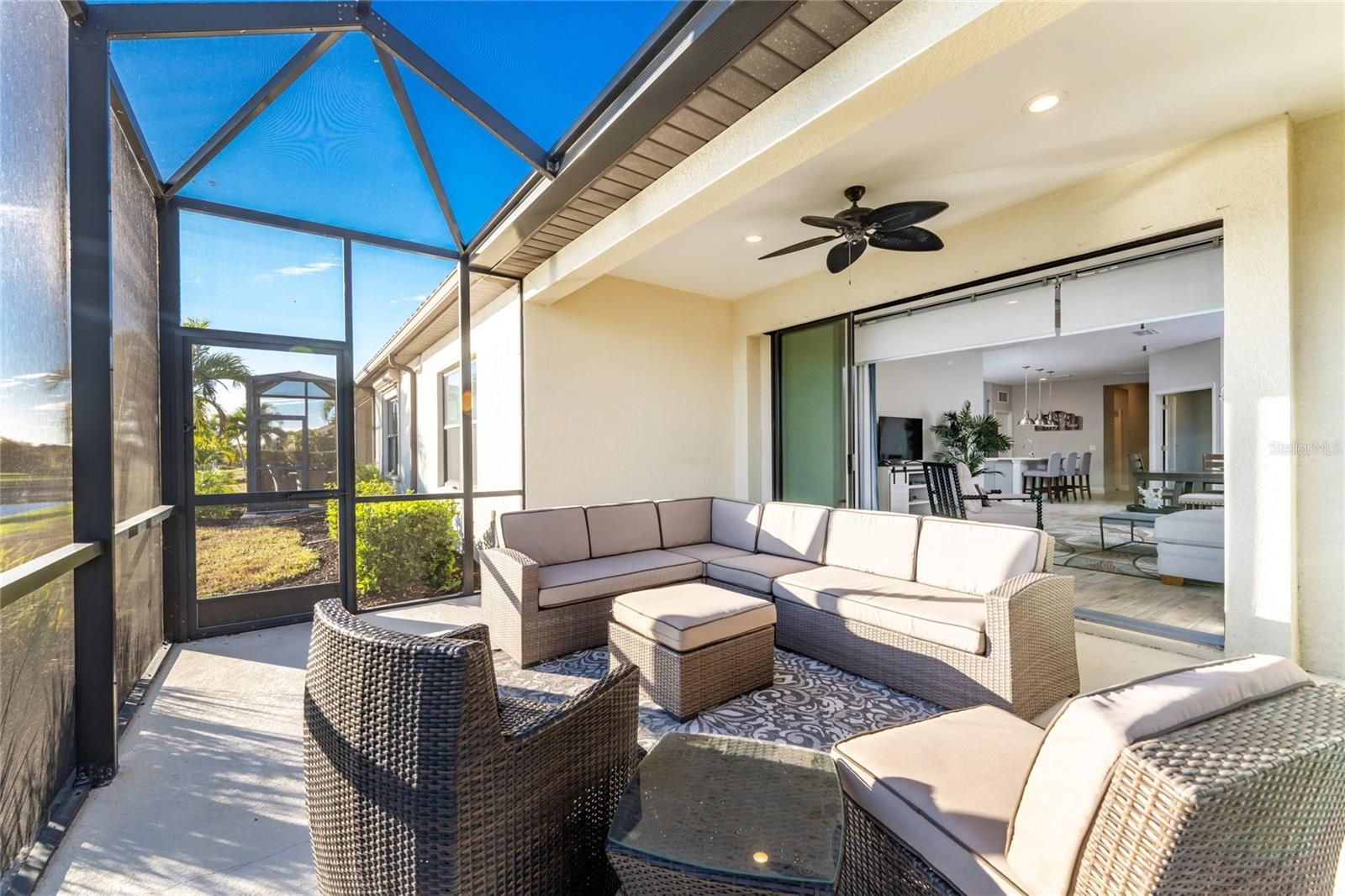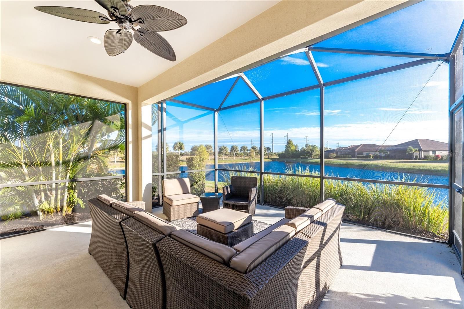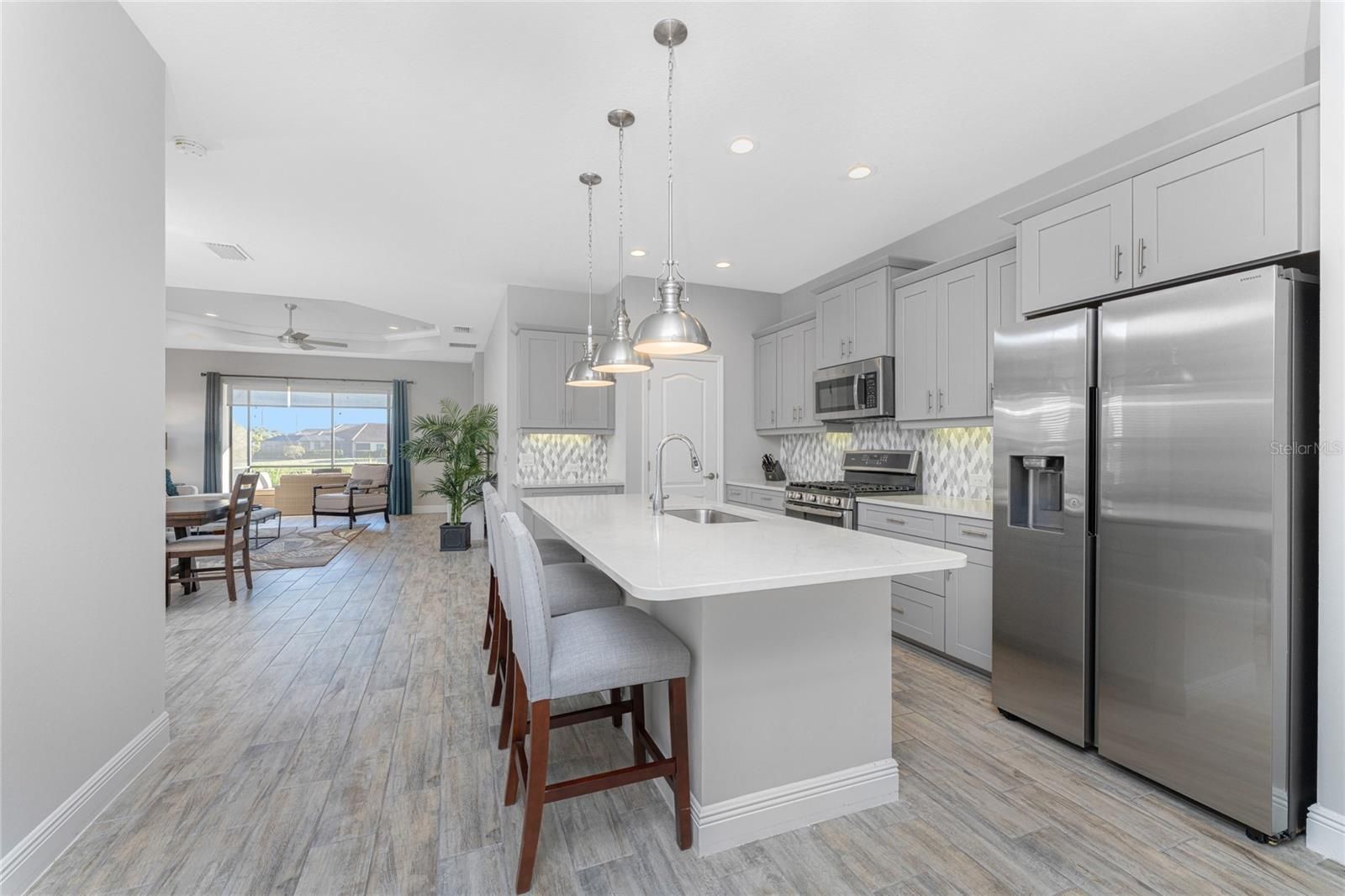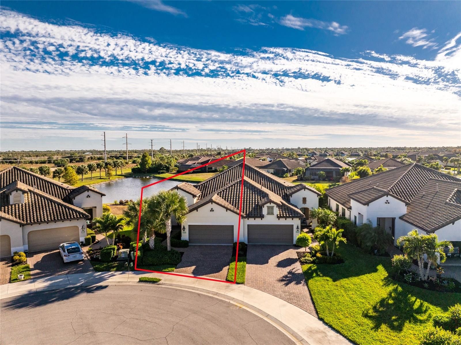 Welcome to Boca Royale—where elegance, comfort, and resort-style living come together. This move-in-ready Sandcastle floor plan offers the perfect balance of spaciousness and privacy with three bedrooms, two baths, and a versatile den. Thoughtfully designed, the open-concept layout is ideal for both everyday living and entertaining. The gourmet kitchen is a chef’s dream, featuring light quartz countertops, pale gray shaker-style cabinetry, stainless steel appliances—including a natural gas range—and a generous center island perfect for gathering. The kitchen flows seamlessly into the dining area and great room, where sliding glass doors open to an extended covered and screened lanai overlooking tranquil water views. The great room is highlighted by a coffered ceiling with crown molding, while recessed lighting enhances the home’s clean, modern aesthetic throughout. Retreat to the spacious primary suite, also offering serene water views, an oversized walk-in closet, and a spa-like ensuite bath with dual vanities topped in polished marble and a glass-enclosed walk-in tile shower. Guests will enjoy comfortable accommodations in the second and third bedrooms, while the den provides a flexible space ideal for a home office or study. The upgraded second bath features marble countertops and a glass-enclosed shower. Additional features include tiled flooring in the main living areas, ceiling fans, pendant lighting, and recessed lighting throughout. Perfectly situated on a quiet cul-de-sac with pond views, this beautifully decorated home is both inviting and refined. Residents of Boca Royale enjoy exceptional amenities, including pickleball, tennis, golf, a fitness center, and an active social calendar. Gather at the clubhouse for dining and drinks, or unwind at the resort-style pool complete with cabanas, a heated pool, and spa. Just minutes away, Manasota Key offers three public beaches with crystal-clear Gulf waters, along with world-class fishing and boating close to home. Come experience the very best of Florida’s Gulf Coast lifestyle—make Boca Royale your new home!