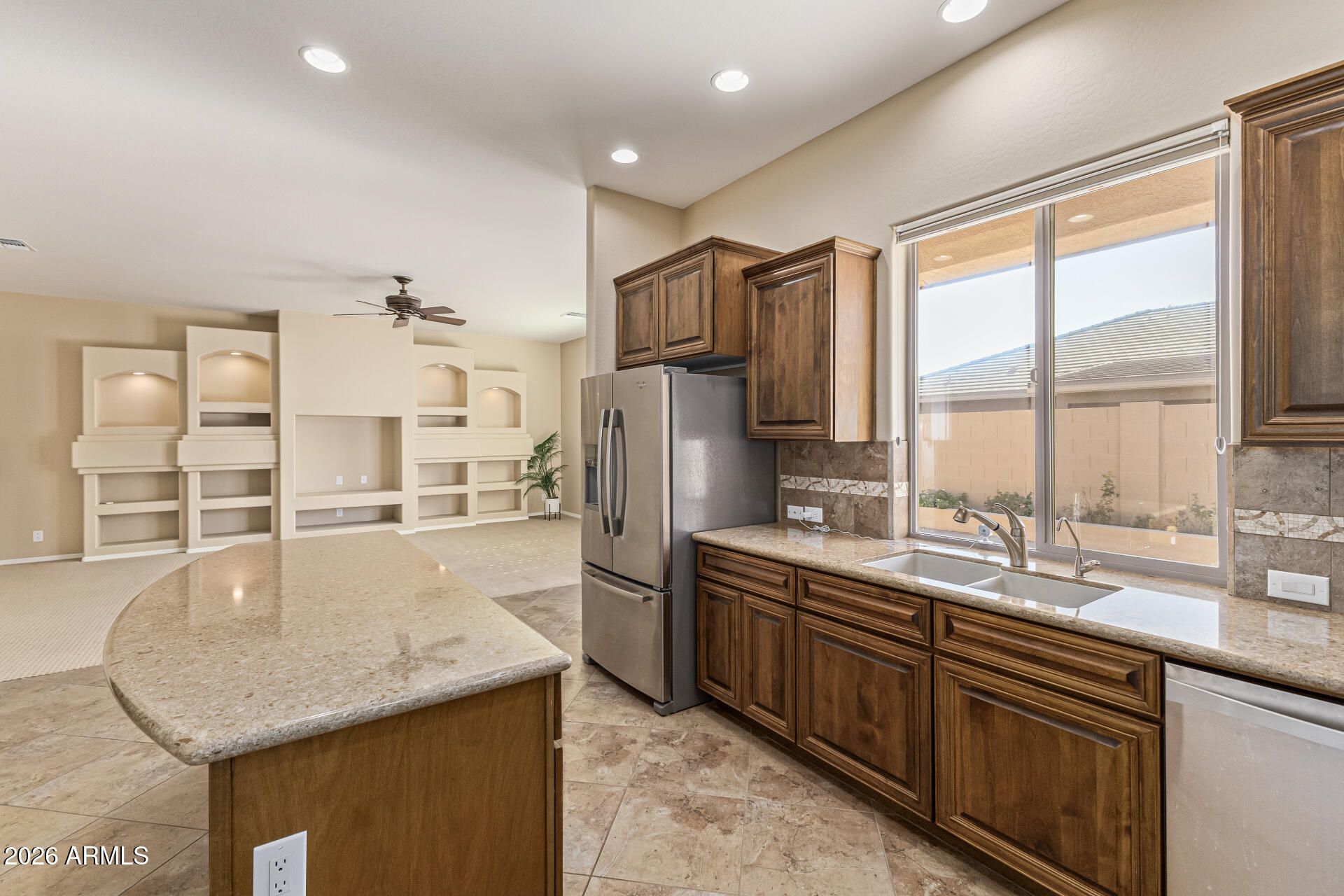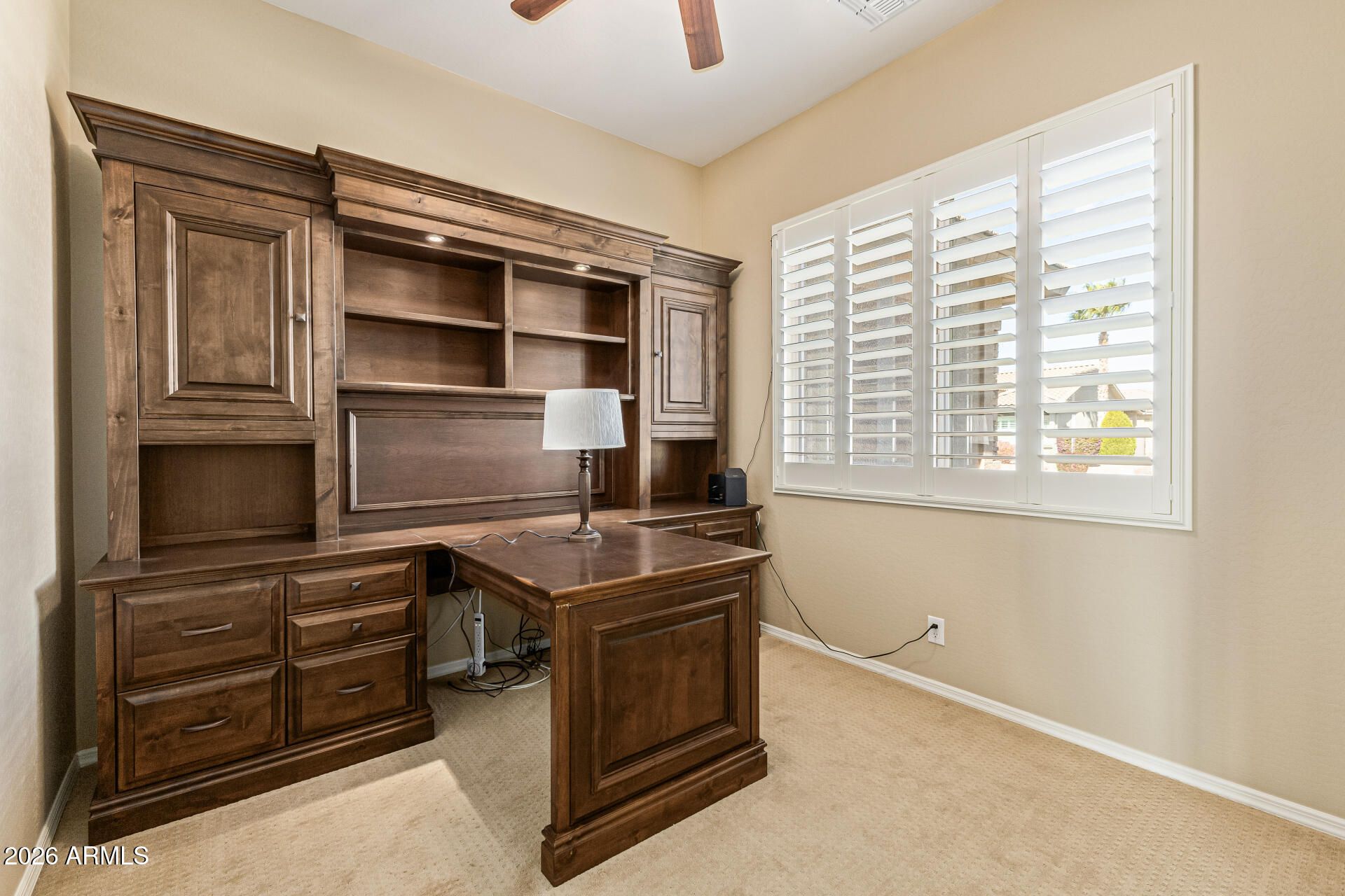 Move-in ready! Pride of ownership shines for this beautifully upgraded 2-bedroom + den residence in the adult Community of Sunland Springs! The heart of the home is the harmonious open floor plan enhanced by media niches, tons of natural light, and fresh paint throughout. Well-appointed kitchen features recessed lighting, ample cabinetry adorned with crown moulding, stainless steel appliances, a pantry, tile backsplash, a center island, and granite counters. In the large primary retreat, you will have plush carpet, plantation shutters, an ensuite, and a walk-in closet. Double doors open to the dedicated den or office. A washer and dryer convey for add everyday convenience. Relax and enjoy the peaceful surroundings from the covered south facing back patio.