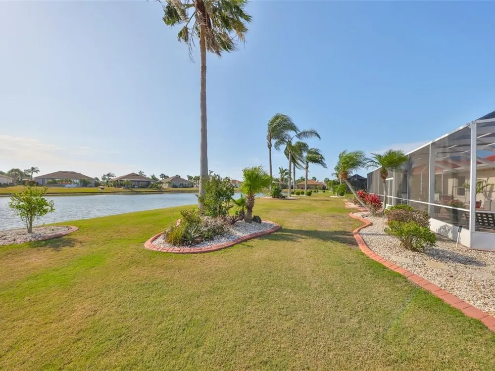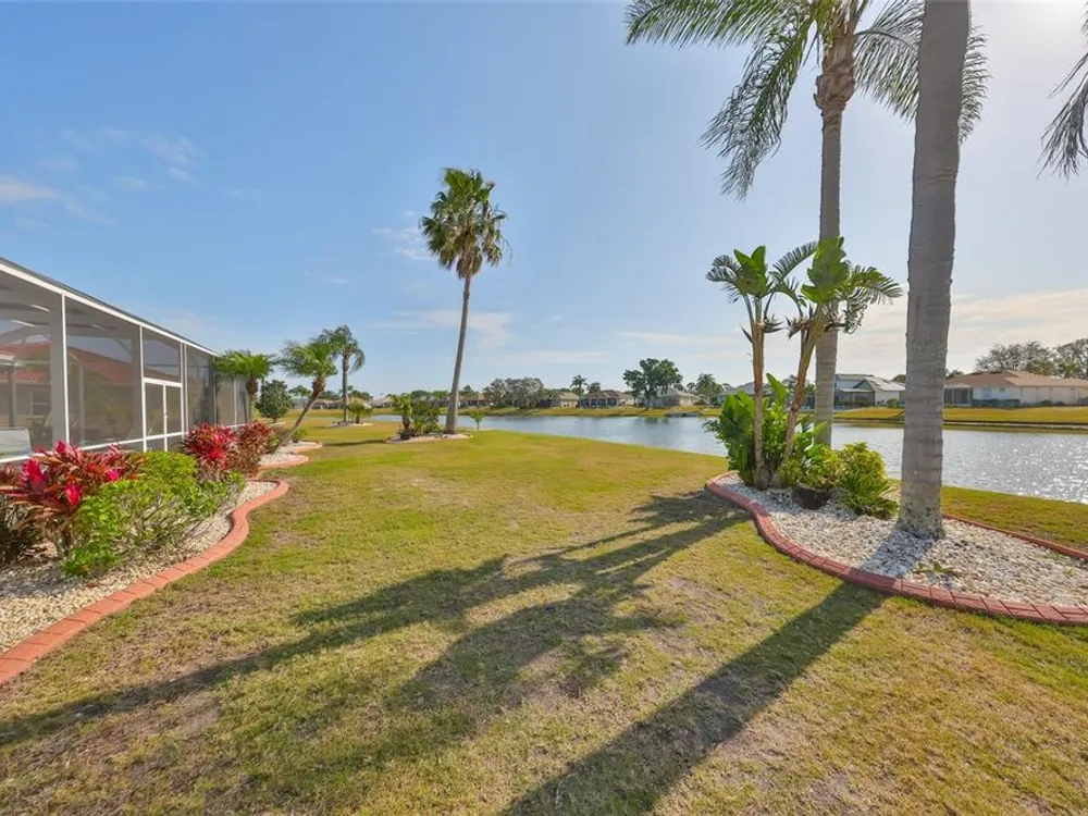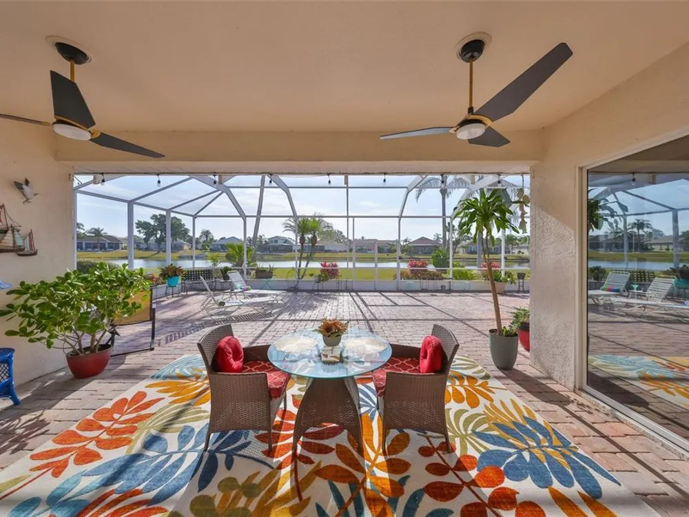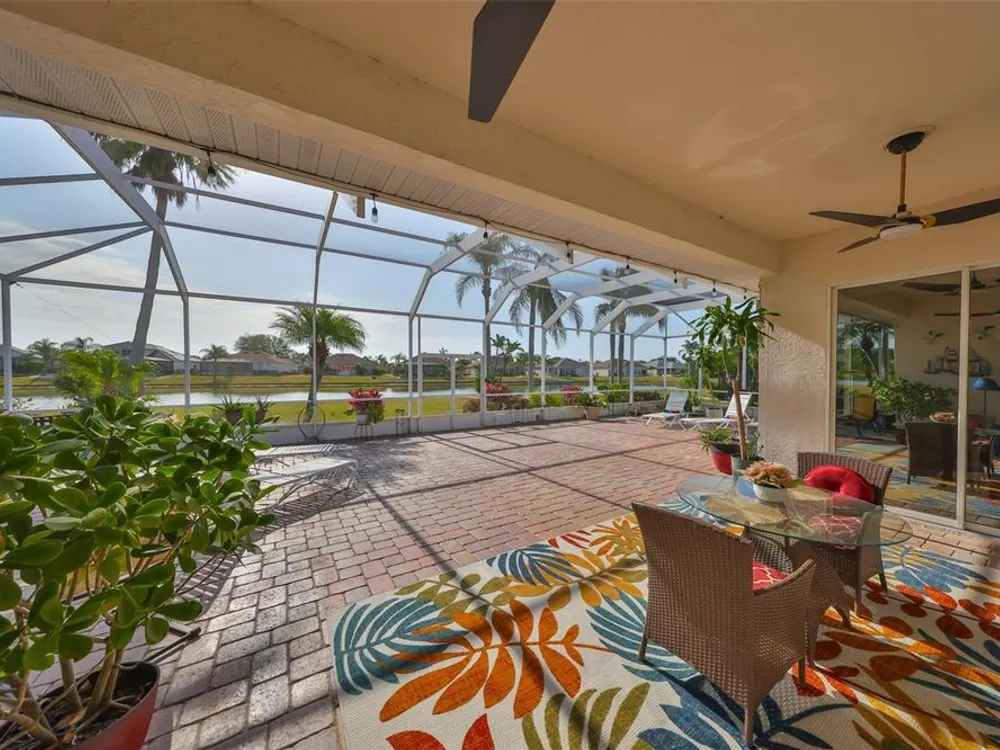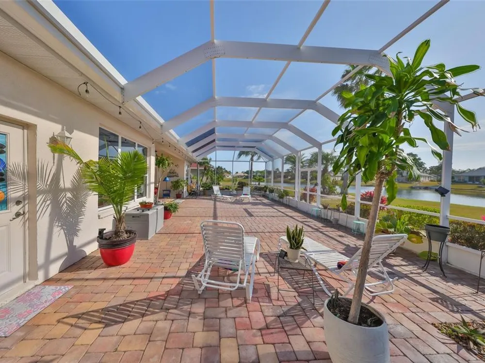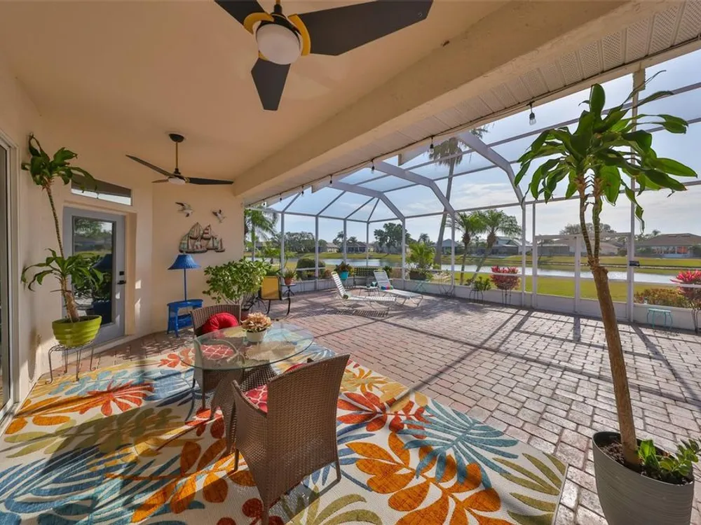 Welcome to Your Tranquil Lakeside Retreat! Discover the perfect blend of style, comfort, and modern amenities in this beautifully maintained Carrington floor plan, nestled in the prestigious Estates at Lake View on the desirable south side of Sun City Center (SCC). Enjoy exceptional curb appeal and outdoor Living as you step onto the oversized screened front porch and enter a home that exudes warmth and charm. High ceilings, elegant crown molding, upgraded lighting and fans, and classic plantation shutters set the stage for gracious living. The expansive living room features stylish gray plank tile that transitions seamlessly into vibrant Italian custom tiles, creating an inviting atmosphere throughout. The magnificent outdoor living space is the true showstopper! Enjoy year-round relaxation or entertain guests on the huge covered and screened lanai, offering serene water views and ample room for gatherings with friends and family. Whether you’re savoring your morning coffee or unwinding at sunset, this private oasis is sure to become your favorite retreat. The spacious kitchen is a chef’s delight, boasting abundant cabinetry with sliding shelves, solid surface countertops, stainless steel appliances, a large pantry, and a central island for effortless meal prep. The kitchen opens to a bright breakfast nook, perfect for casual dining. The luxurious extended primary bedroom suite is a true sanctuary, featuring direct access to the lanai, two generous walk-in closets, and a spa-like bathroom with dual vanities, a walk-in shower, a relaxing garden tub, and a beautiful custom stained-glass window. Two extra bedrooms, each with ample closet space, are designed for privacy. The third bedroom includes built-in desks and custom cabinetry, making it ideal for a home office or craft room. The guest bathroom, adorned with a custom stained-glass panel door, opens onto the rear lanai and can serve as a convenient pool bath. Additional home features include interior laundry room with extra storage, two-car garage with utility sink, water softener, and DIY workspace, new roof for peace of mind. Resort-Style Living where you will enjoy the vibrant 55+ golf cart community lifestyle, with access to exceptional amenities: indoor and outdoor pools, spas, fitness center, library, community hall, arts and crafts, sports courts, and golf. Conveniently located near airports, beaches, shopping, and big-city entertainment, this home offers endless opportunities for recreation and leisure This is more than just a home—it’s a lifestyle. Don’t miss your chance to own this beauty! Schedule your private showing today.