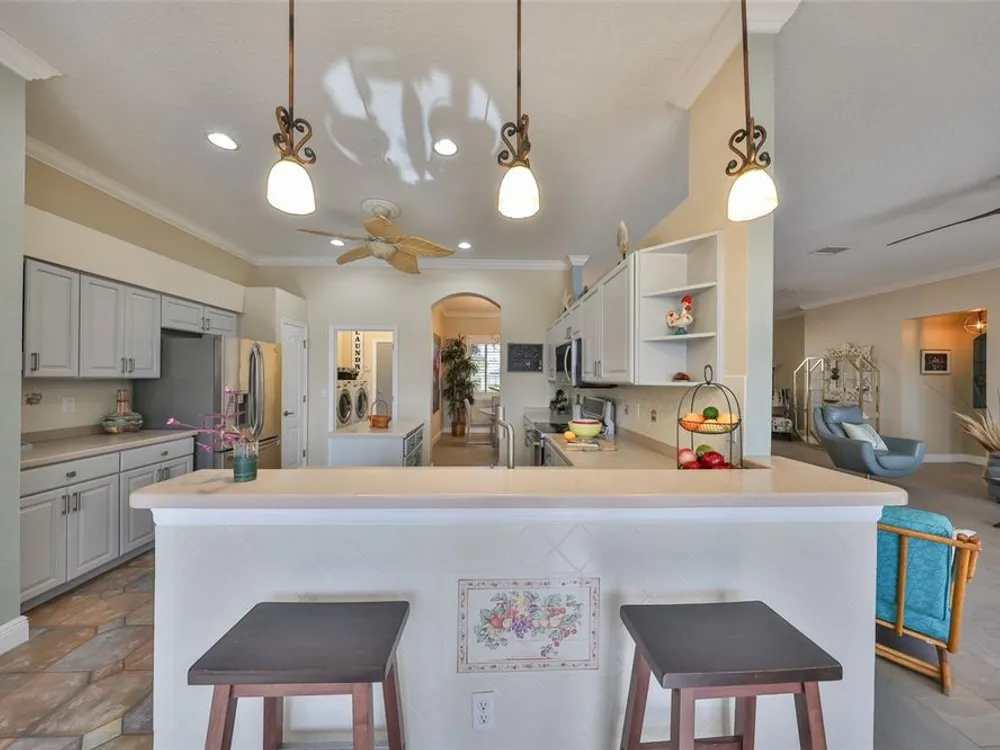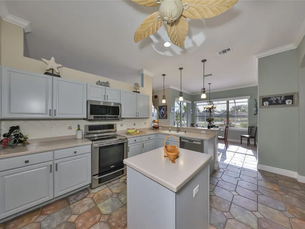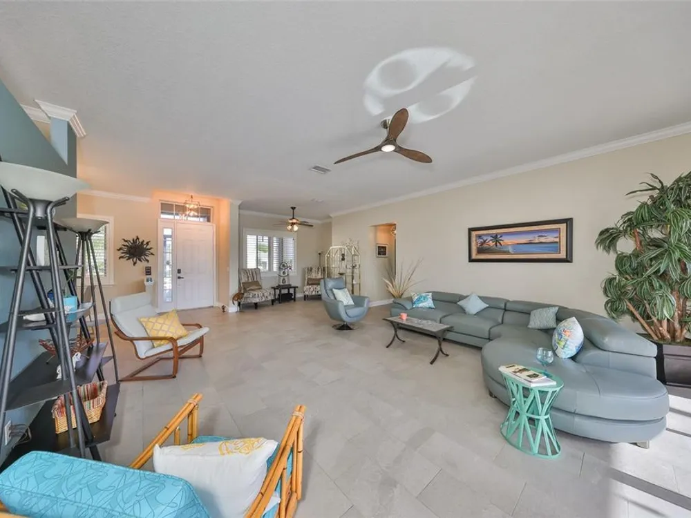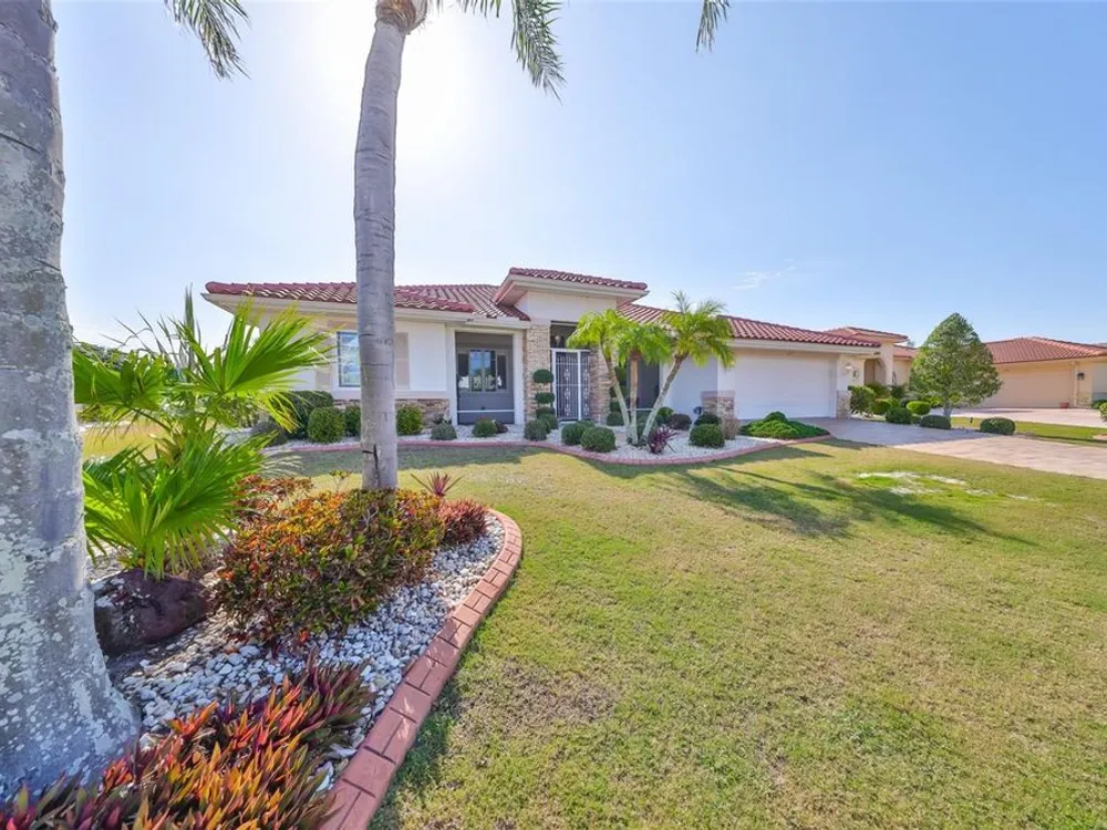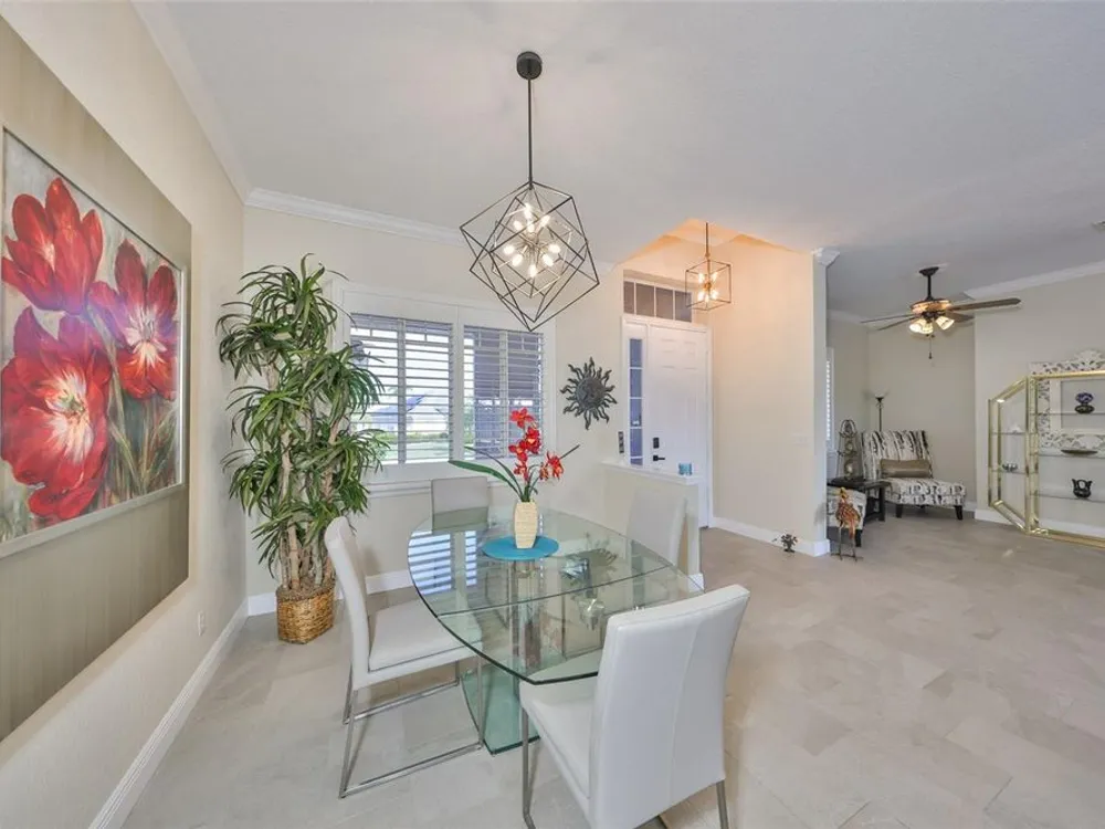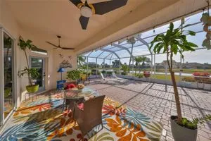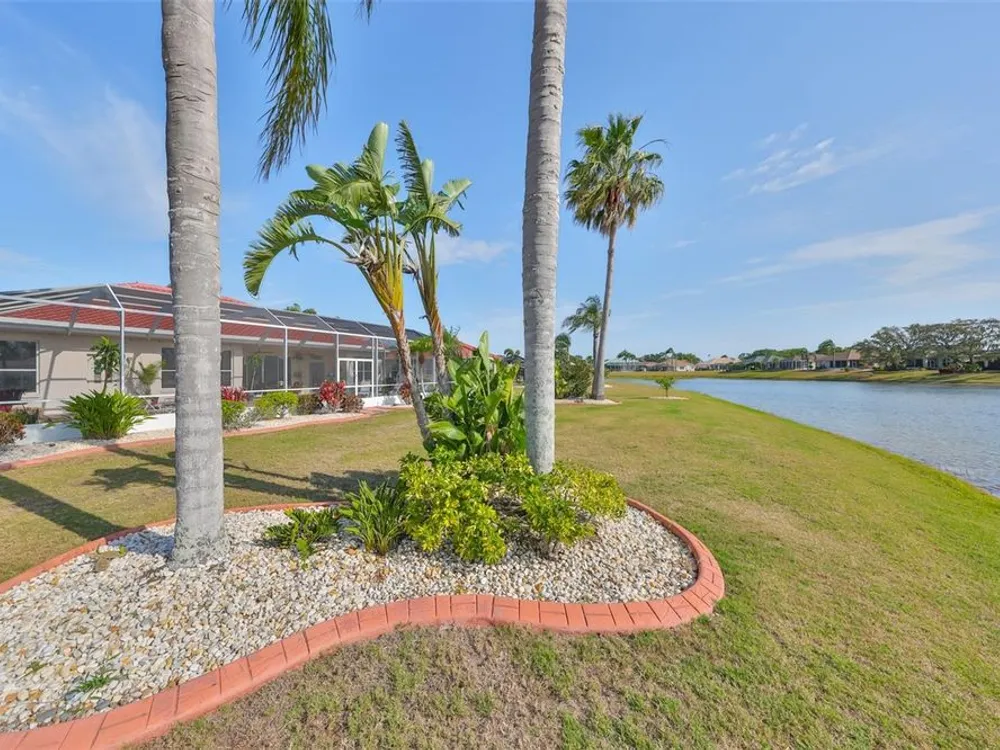 Welcome to Your Tranquil Lakeside Retreat! Discover the perfect blend of style, comfort, and modern amenities in this beautifully maintained Carrington floor plan, nestled in the prestigious Estates at Lake View on the desirable south side of Sun City Center (SCC). Enjoy exceptional curb appeal and outdoor Living as you step onto the oversized screened front porch and enter a home that exudes warmth and charm. High ceilings, elegant crown molding, upgraded lighting and fans, and classic plantation shutters set the stage for gracious living. The expansive living room features stylish gray plank tile that transitions seamlessly into vibrant Italian custom tiles, creating an inviting atmosphere throughout. The magnificent outdoor living space is the true showstopper! Enjoy year-round relaxation or entertain guests on the huge covered and screened lanai, offering serene water views and ample room for gatherings with friends and family. Whether you’re savoring your morning coffee or unwinding at sunset, this private oasis is sure to become your favorite retreat. The spacious kitchen is a chef’s delight, boasting abundant cabinetry with sliding shelves, solid surface countertops, stainless steel appliances, a large pantry, and a central island for effortless meal prep. The kitchen opens to a bright breakfast nook, perfect for casual dining. The luxurious extended primary bedroom suite is a true sanctuary, featuring direct access to the lanai, two generous walk-in closets, and a spa-like bathroom with dual vanities, a walk-in shower, a relaxing garden tub, and a beautiful custom stained-glass window. Two extra bedrooms, each with ample closet space, are designed for privacy. The third bedroom includes built-in desks and custom cabinetry, making it ideal for a home office or craft room. The guest bathroom, adorned with a custom stained-glass panel door, opens onto the rear lanai and can serve as a convenient pool bath. Additional home features include interior laundry room with extra storage, two-car garage with utility sink, water softener, and DIY workspace, new roof for peace of mind. Resort-Style Living where you will enjoy the vibrant 55+ golf cart community lifestyle, with access to exceptional amenities: indoor and outdoor pools, spas, fitness center, library, community hall, arts and crafts, sports courts, and golf. Conveniently located near airports, beaches, shopping, and big-city entertainment, this home offers endless opportunities for recreation and leisure This is more than just a home—it’s a lifestyle. Don’t miss your chance to own this beauty! Schedule your private showing today.