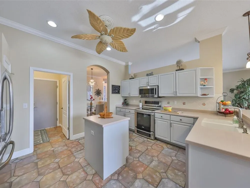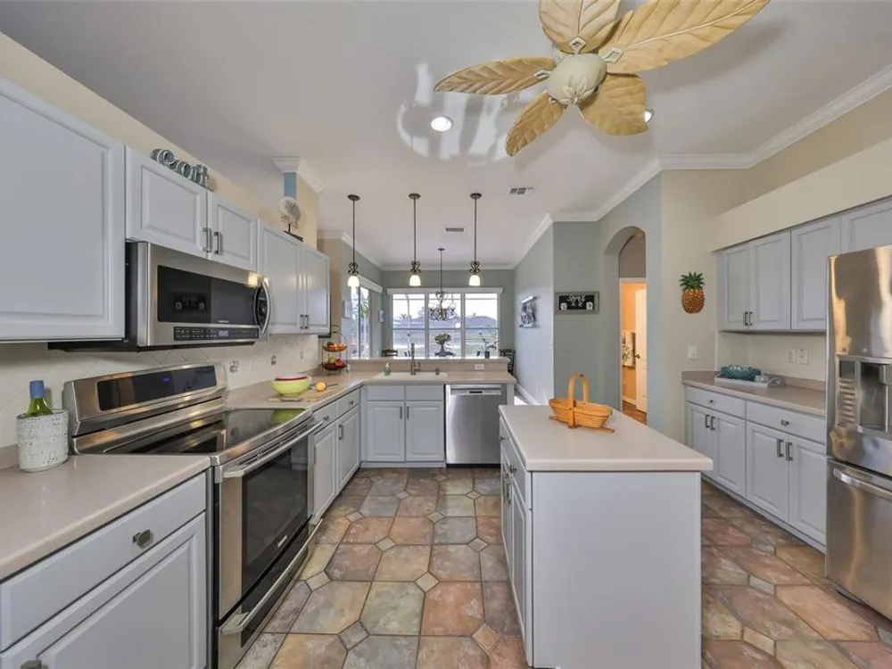 - Ceiling Fan(s), Crown Molding, Eat-in Kitchen, High Ceilings, Open Floorplan, Solid Surface Counters, Solid-Wood Cabinets, Split Bedrooms, Thermostat, Tray Ceiling(s), Walk-In Closet(s), Window Treatments