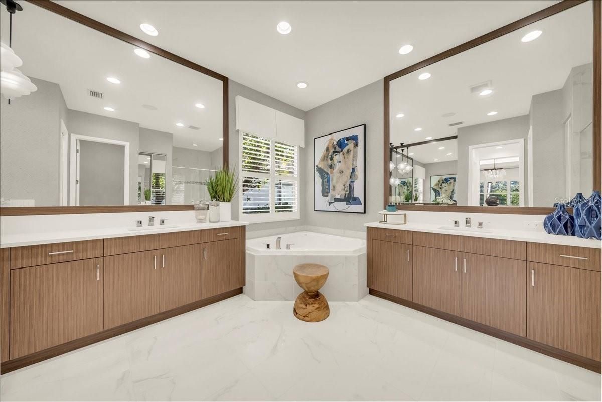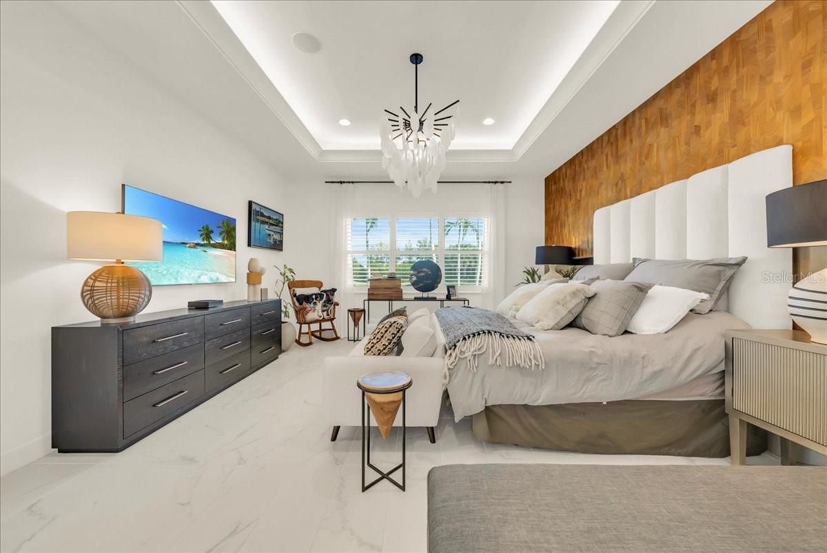 - Built-in Features, Ceiling Fan(s), Chair Rail, Crown Molding, Eat-in Kitchen, High Ceilings, In-Wall Pest Control, Open Floorplan, Main Level Primary, Smart Home, Solid Surface Counters, Solid-Wood Cabinets, Split Bedrooms, Stone Counters, Thermostat, Vaulted Ceiling(s), Walk-In Closet(s), Window Treatments