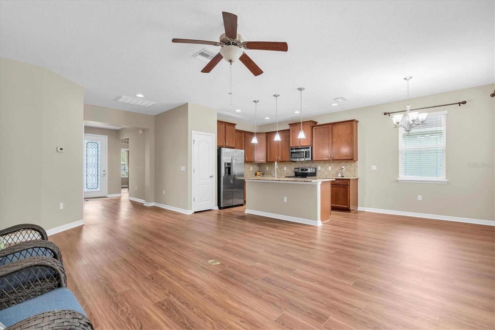 - Ceiling Fan(s), Kitchen/Family Room Combo, Open Floorplan, Main Level Primary, Solid-Wood Cabinets, Split Bedrooms, Stone Counters, Walk-In Closet(s)