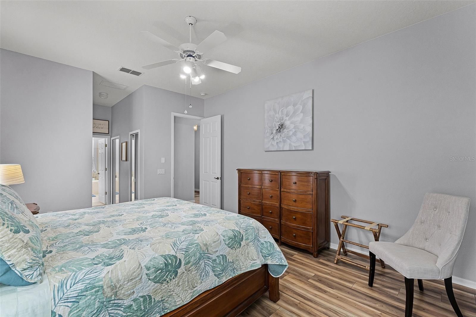 - Ceiling Fan(s), Crown Molding, High Ceilings, Open Floorplan, Main Level Primary, Solid Surface Counters