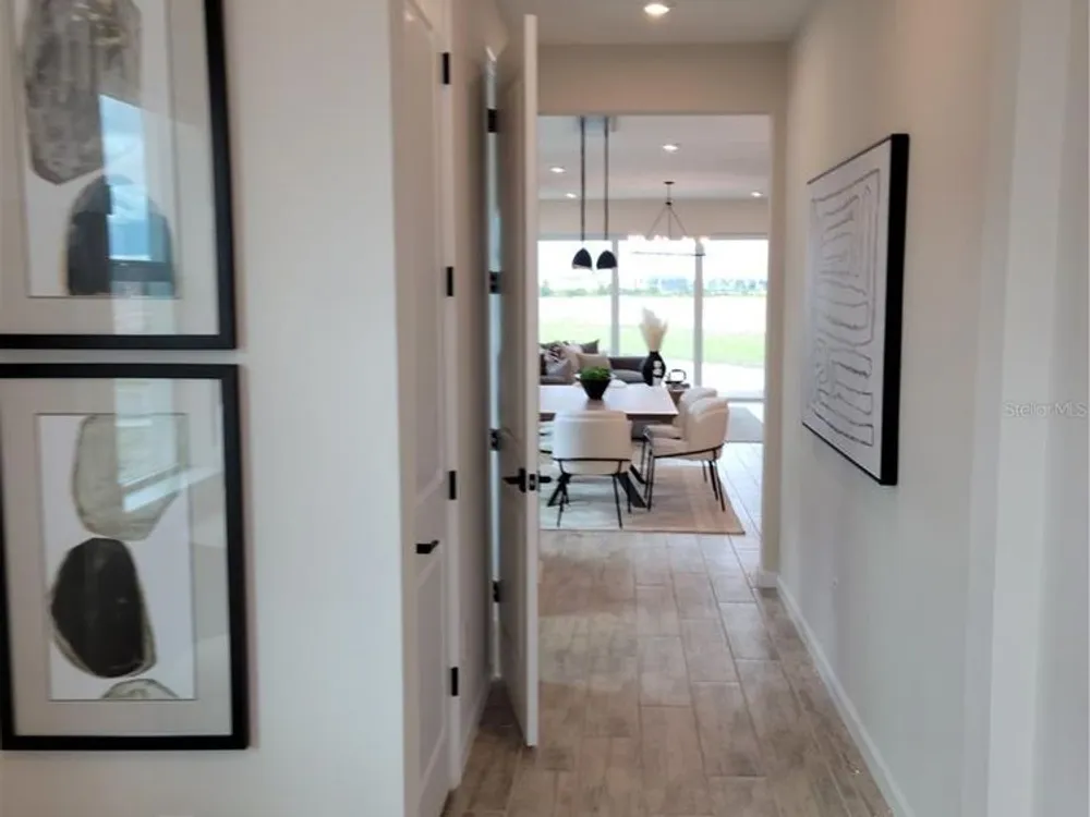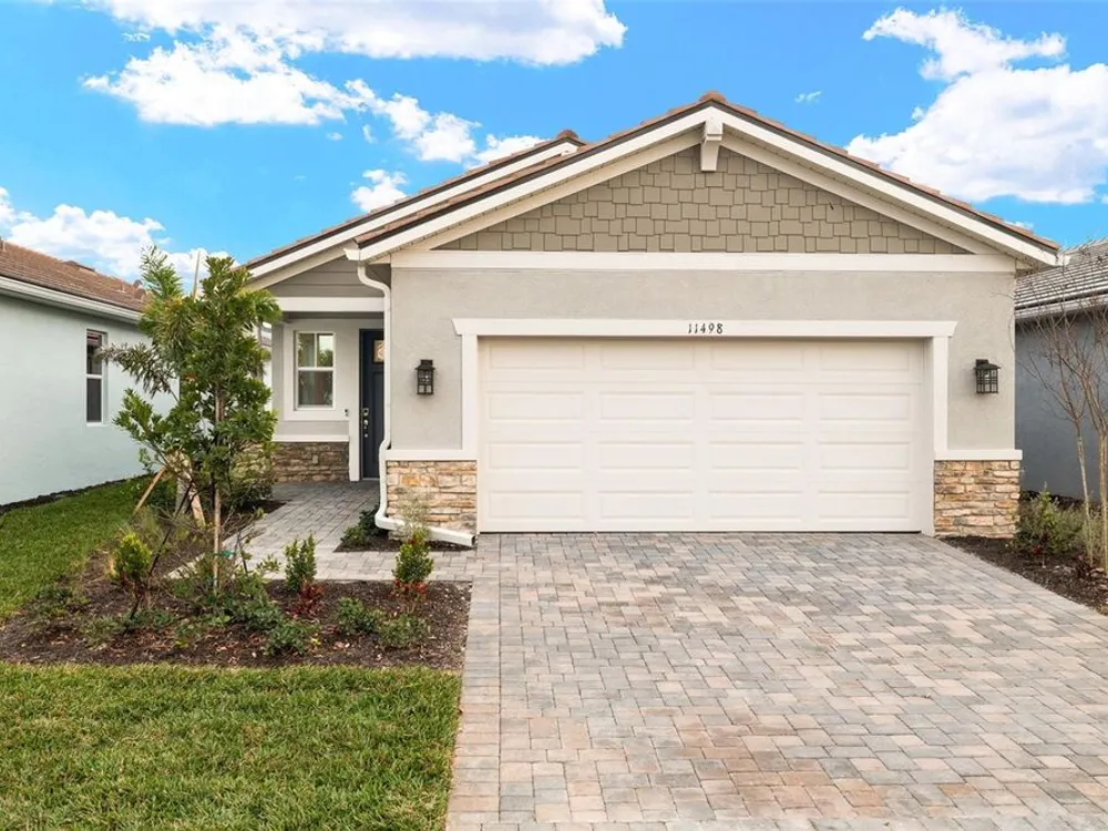 Under Construction. READY NOW – Stunning Sandstone single-family home in Brightmore at Wellen Park (55+ Community) This 1,916 sq. ft. Sandstone single-story home with Craftsman elevation blends timeless design with modern comfort, offering 2 bedrooms, 2.5 bathrooms, a private study, and a 2-car garage pre-plumbed for a utility tub. The open-concept layout is bathed in natural light that spills through oversized sliding glass doors and 8' interior doors, creating a bright and welcoming atmosphere. The floors are finished in soft stone-gray 12x24-inch ceramic tile, laid in a staggered pattern throughout the main living areas and bathrooms, while plush beige carpeting adds warmth to the bedrooms. The kitchen is a standout with painted linen cabinetry, crown molding, satin nickel hardware, and quartz countertops in a marble-inspired finish. A glossy white herringbone backsplash adds a splash of personality. Stainless steel appliances include a quiet dishwasher with adjustable racks and heated dry, a steam microwave with sensor cooking, a smart electric range with air fry and no-preheat mode, and a 36" side-by-side refrigerator with exterior ice and water dispenser (ENERGY STAR® certified). The owner’s suite features a spacious walk-in closet and a walk-in shower with a bench seat, wrapped in large-format gray tile and finished with brushed nickel fixtures and a mosaic tile floor. The second bathroom includes a recessed shower with full-height tile surround, and there’s a powder bath for guests. Additional upgrades include a study in place of the flex room, impact-rated windows throughout, a screened lanai enclosure, and an exterior-vented microwave. Recessed LED lighting in the great room and lanai, pendant prewiring over the kitchen island, and a TV wall mount package make entertaining effortless. A washer and dryer are also included. The covered lanai offers peaceful water views—perfect for morning coffee or evening relaxation. Located in Brightmore, Wellen Park’s exclusive 55+ neighborhood, residents will enjoy a future 21,000 sq. ft. amenity center with pickleball courts, resort and lap pools, a state-of-the-art fitness center, bar and café, dog park, outdoor exercise lawn, hot tub, full-time lifestyle director, and more. Just minutes from beaches, downtown Wellen Park, dining, and shopping—this home is ready to welcome you. *** Photos, renderings and plans are for illustrative purposes only and should never be relied upon and may vary from the actual home. Pricing, dimensions and features can change at any time without notice or obligation. The photos are from a furnished model home and not the home offered for sale.