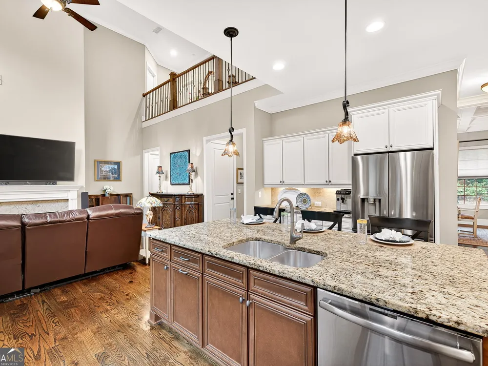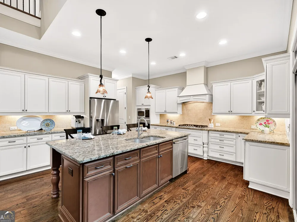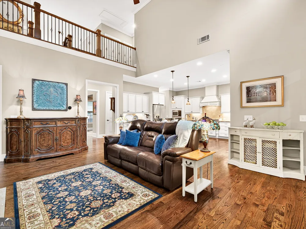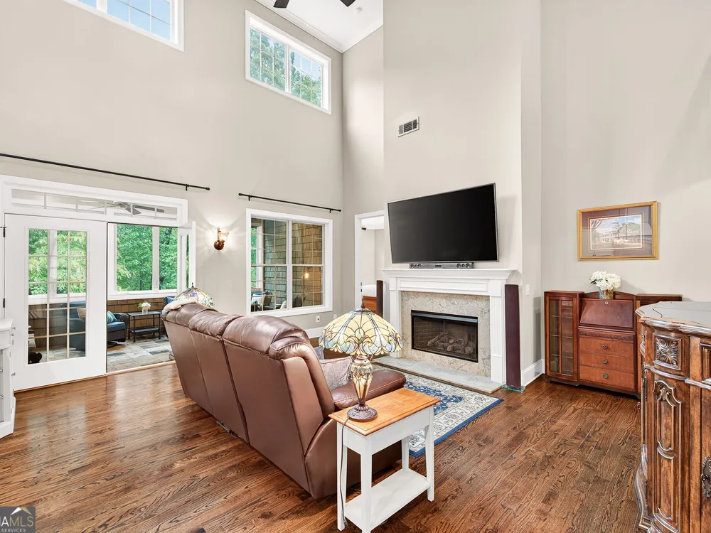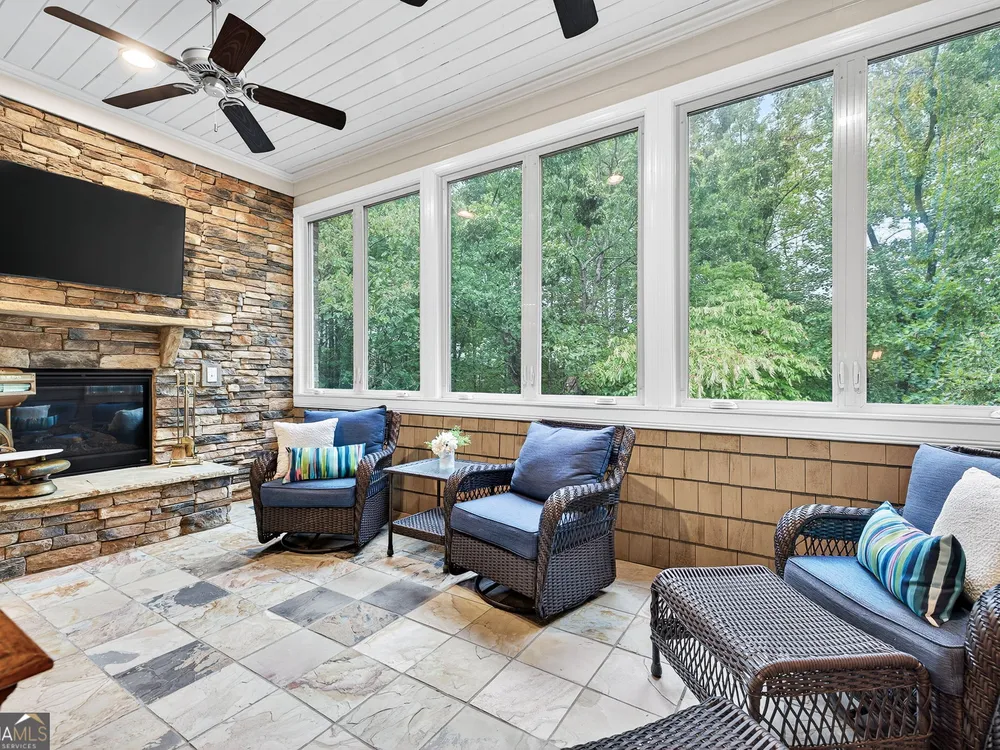 ABSOLUTELY IMMACULATE and METICULOUSLY maintained! Versatile floor plan in award winning Active Adult 55+ Community. Gorgeous wooded view. MAIN LEVEL: Gracious two-story foyer with lots of natural light. Stunning hardwood floors throughout main level really emphasize the open concept. Dining Room with coffered ceiling. Spacious family room is open to the kitchen and lanai. Fireplaces in both the living room and lanai create a cozy and congenial entertainment space. Lanai has insulated casement windows and stacked stone fireplace - a perfect four-season living space. You'll especially love the private and tranquil wooded view that's perfect for watching TV, reading, dining, or just relaxing. Creamy cabinetry, great lighting, and lots of granite countertop space offer ample storage and workspace in the kitchen. A grill deck off the kitchen makes outdoor cooking a year 'round pleasure. Primary Suite is spacious with huge walk-in shower, soaking tub, double sink vanities with granite countertops and linen tower for storage. HIS and HER custom closets are simply fabulous providing individual organized space for your wardrobe. UPSTAIRS, you'll find three additional bedrooms and a bonus/media room. Walk-in closets in each bedroom provide generous storage. The unfinished TERRACE level expands your living possibilities even further. It offers great options for another bedroom and full bath (already plumbed), workshop, recreation space, storage. A sense of COMMUNITY is so important to an Active Adult lifestyle. This community offers resort-like amenities that enhance your lifestyle. Enjoy the pool, well-appointed clubhouse, state-of-the-art fitness center, tennis and PICKLEBALL courts, community garden, and scenic walking trails. You'll love the many planned activities - a wonderful way to meet neighbors and friends. CONVENIENCE is key!! Easy access to a variety of restaurants, shopping destinations, Emory hospital and medical facilities, and several golf courses and country clubs. Come and check this out - the perfect combination of classy design, practical comfort and a vibrant community.