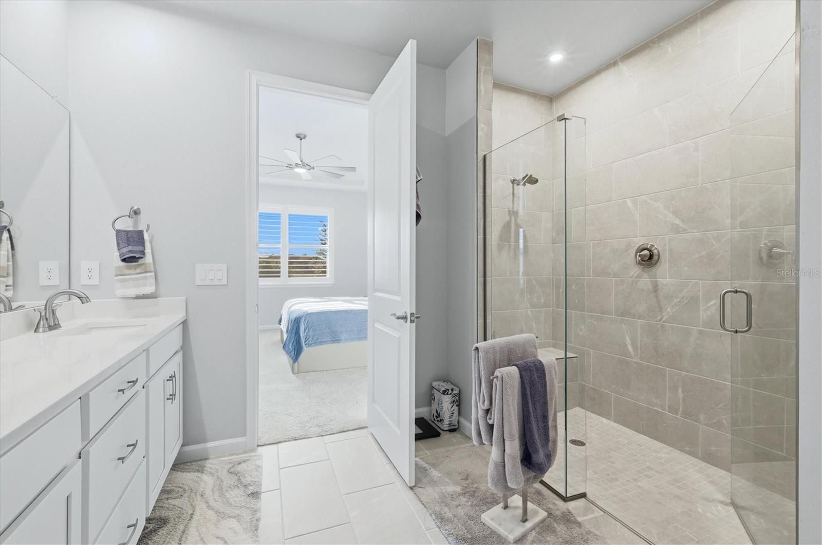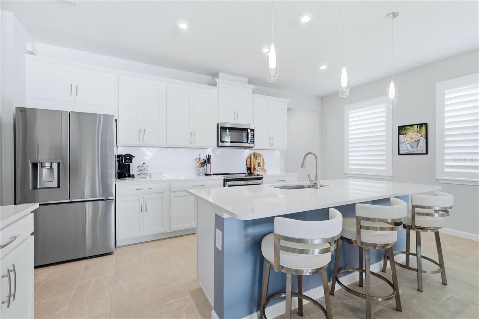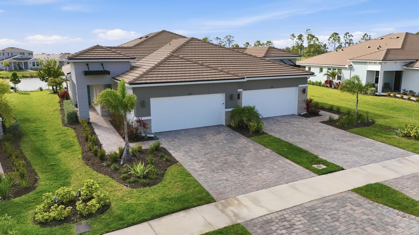 Welcome to Wellen Park’s sought-after Brightmore community, where this better-than-new Champagne Traditional paired villa stands out with extensive upgrades, thoughtful enhancements, and a premium lake view—without the wait or added expense of new construction. Built in 2024, this meticulously upgraded home features a bright, open-concept layout with a seamless flow between the kitchen, dining area, and great room. Every detail has been elevated beyond builder standards, including tile flooring throughout the main living areas, plantation shutters, upgraded lighting and ceiling fans, and abundant natural light. The kitchen has been beautifully enhanced with upgraded stainless steel appliances, 42" cabinetry with under-cabinet lighting, pull-out drawers for added functionality, and a clean, modern finish that blends both style and convenience. Step outside to a new extended upgraded lanai experience—complete with pavers, a covered seating area, Super Screen enclosure, and sliding glass doors with retractable blinds. Enjoy peaceful lake views in a space designed for true indoor-outdoor living. Additional exterior upgrades include enhanced landscaping, Storm Smart electric hurricane shutters on the lanai and a retractable front door screen. This home is loaded with high-value upgrades already completed for you, including impact windows and doors, a smart home technology panel, a fully outfitted laundry room with added cabinetry, and an extended two-car garage with epoxy flooring—features that are often costly add-ons in new builds. Residents of Brightmore at Wellen Park enjoy an exceptional lineup of resort-style amenities, including a spa, resort-style pool, and dedicated lap pool, along with a vibrant clubhouse featuring a fitness center, library, and card rooms. The community also offers a café, restaurant, and bar, perfect for casual dining and social gatherings. Outdoor amenities are equally impressive, with over 20 miles of scenic walking and biking trails, the stunning 80-acre Grand Lake, bocce ball courts, a dog park, and eight pickleball courts plus a stadium pickleball court for tournament-style play. Relax and unwind at the community fire pits or take in the beautifully designed gathering spaces that make Brightmore an active and engaging place to call home. Located just minutes from shopping, dining, and the exciting Downtown Wellen Park district, this home offers the ideal combination of move-in-ready convenience, premium upgrades, and resort-style living—without the delays, added costs, or uncertainty of building new.