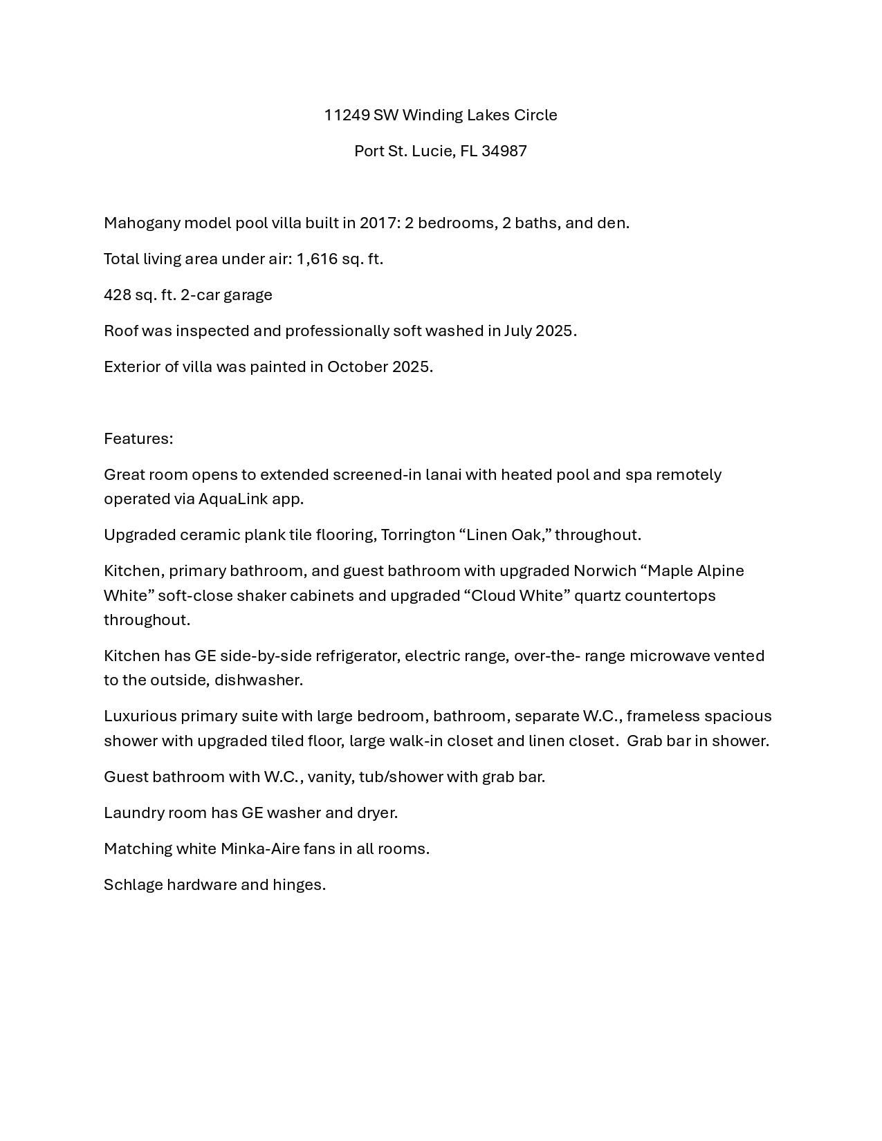 Experience refined Florida living in this exquisite Mahogany model villa, perfectly situated in the coveted LakePark at Tradition community. Designed with modern elegance in mind, this 2-bedroom plus den, 2-bathroom residence showcases a seamless blend of style, comfort, and tranquility. Step inside to an open-concept floor plan featuring contemporary tile flooring throughout, gorgeous quartz countertops, and full-impact glass windows that invite natural light and provide year-round peace of mind. The gourmet kitchen flows seamlessly into the spacious living and dining areas—perfect for entertaining or unwinding in style. Your private outdoor oasis awaits with a resort-style pool and spa overlooking lush preserve views, creating a tranquil retreat that feels worlds away. The automated pool system lets you heat the spa right from your smartphone, so it's perfectly ready for you to relax the moment you return home from dinner. Every detail of this home exudes sophisticationfrom its modern finishes to its smart technologydelivering a refined, low-maintenance lifestyle in one of Port St. Lucie's most desirable communities. Residents of Lake Park enjoy an all-inclusive HOA covering lawn care, mulching, full irrigation system use and maintenance, house phone, alarm system, high-speed internet, and cable TV; making this the perfect low-maintenance Florida lifestyle!