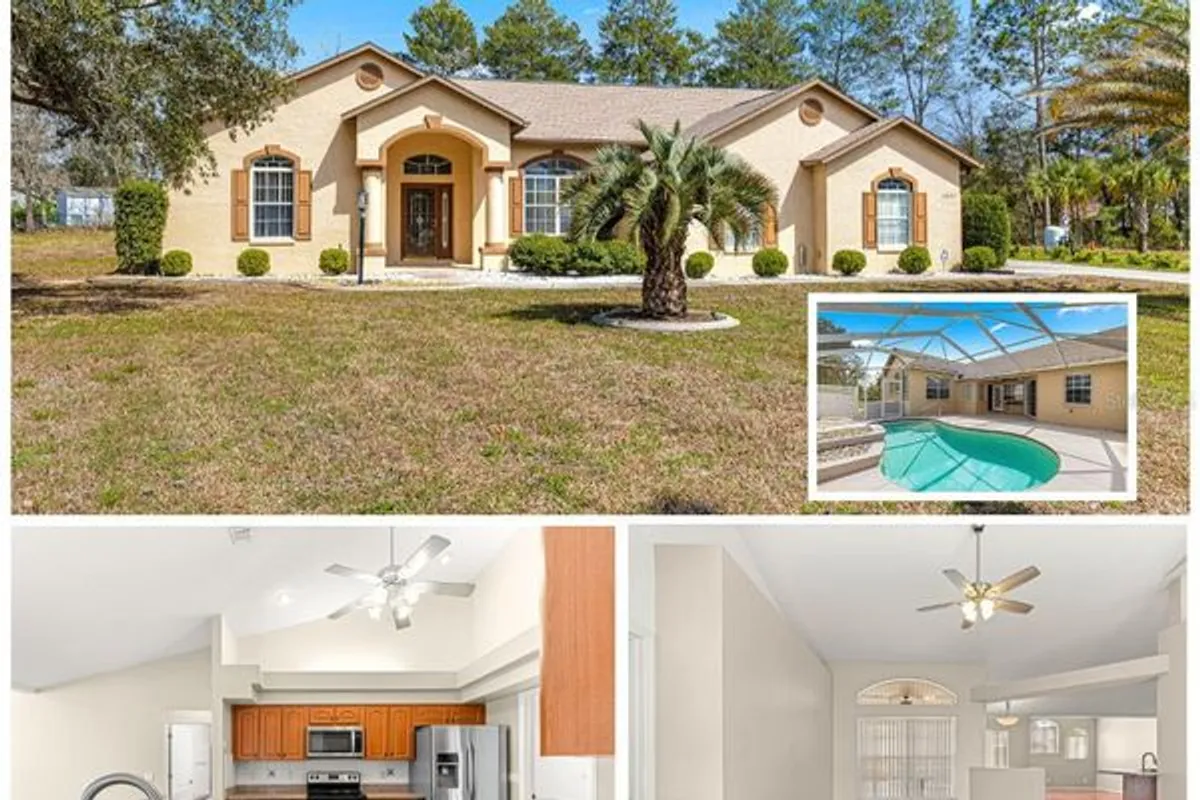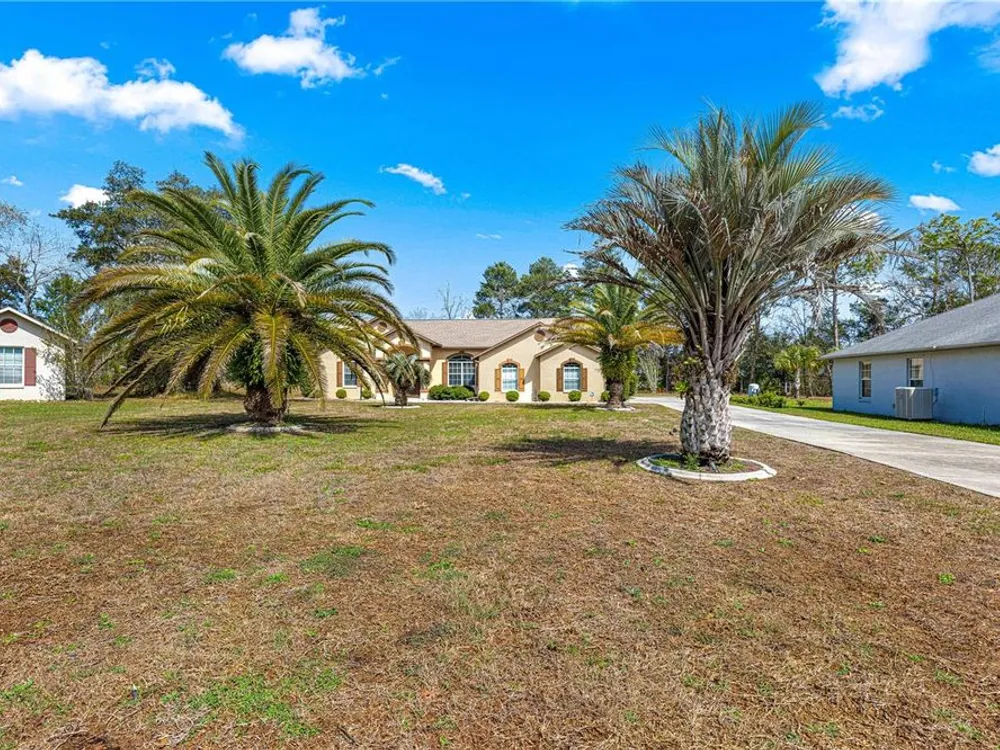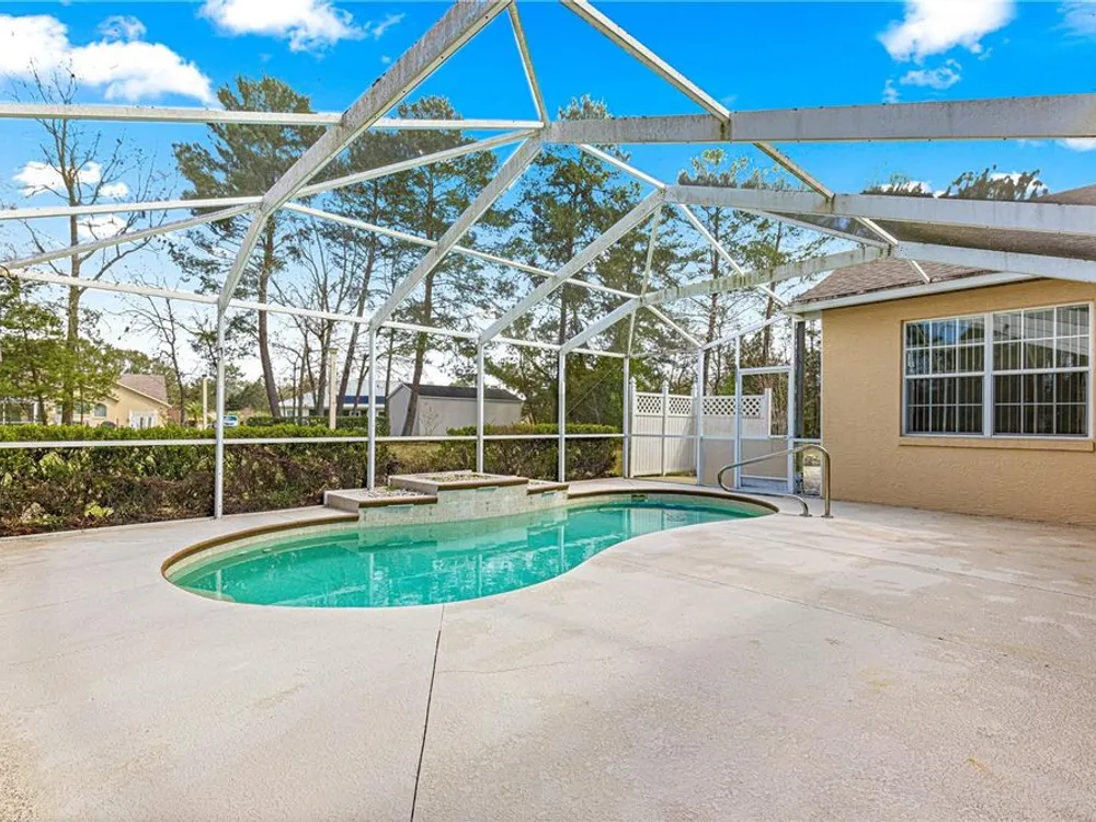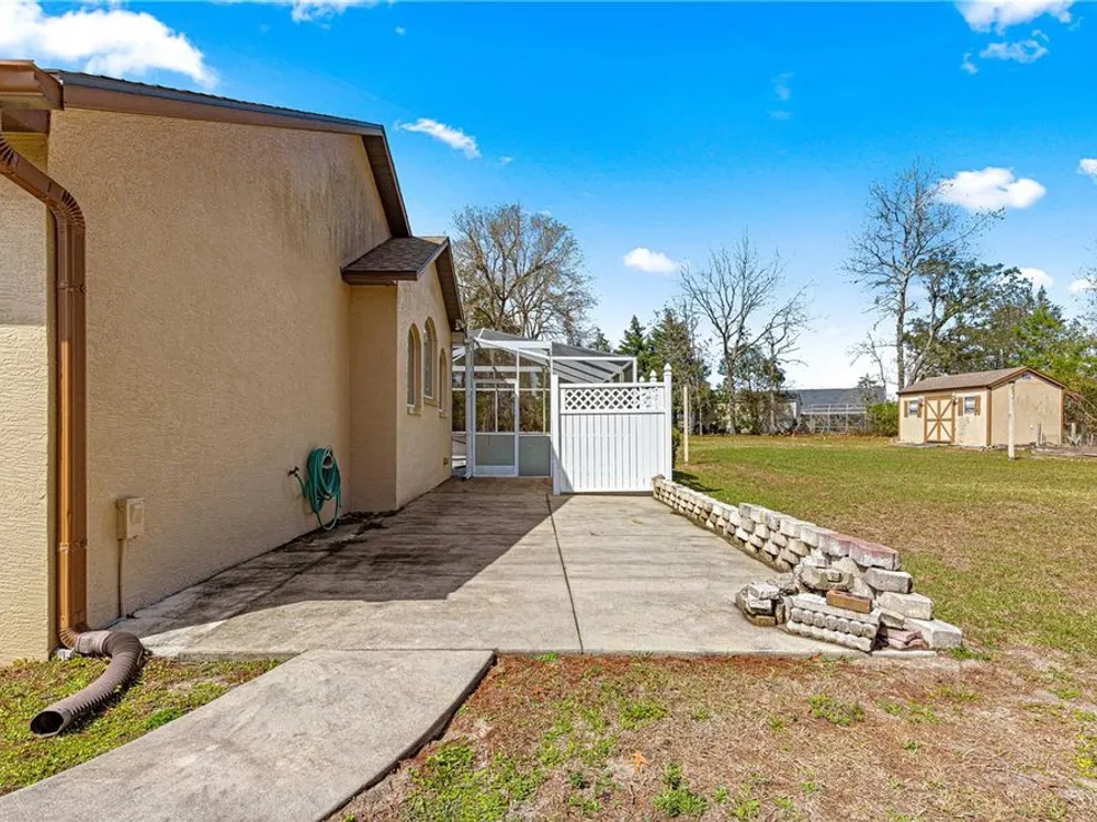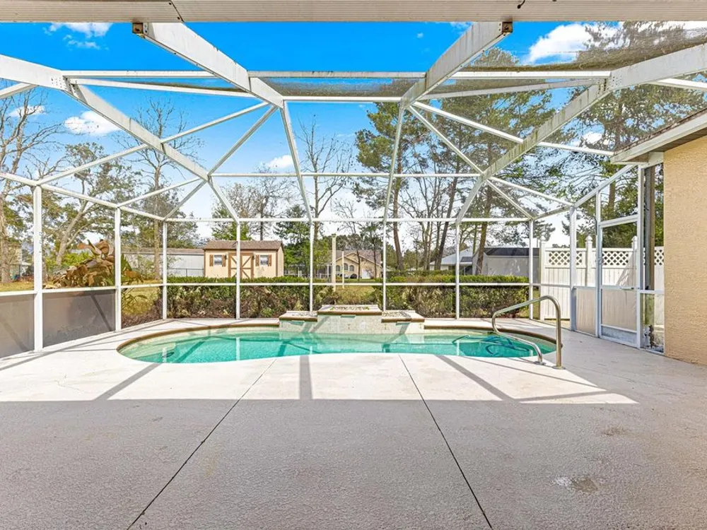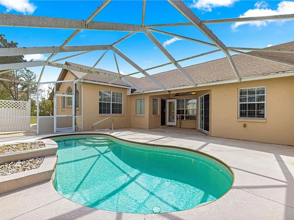 Pool, Palm Trees & an Oversized Lot! Discover the perfect blend of comfort and convenience in this 3-bedroom, 2-bathroom pool home, offering 2,150 sq. ft. of living space on a .61-acre lot in a peaceful cul-de-sac. An expansive driveway provides ample guest parking. Inside, enjoy a spacious, airy layout with vaulted ceilings and abundant natural light. The beautiful kitchen features granite countertops, backsplash, stainless steel appliances, and ample counter & cabinet space, plus a built-in wine rack—perfect for cooking and entertaining. The expanded master suite boasts wood flooring, a tray ceiling, and private pool access, creating a true retreat. The master bath includes dual sinks, a walk-in shower, and a relaxing garden tub. Step outside to your private backyard oasis, complete with a sparkling screened-in pool. The oversized lot is ideal for gardening, featuring a well for irrigation to keep everything lush year-round. Additional highlights include: a 2 car garage with a utility sink and pull down attic, Shed with electricity – great for storage or a workshop, Newer roof (2022) and water heater replaced in 2025 for peace of mind. Enjoy privacy, space, and true Florida living in a desirable location. Schedule your private tour today!