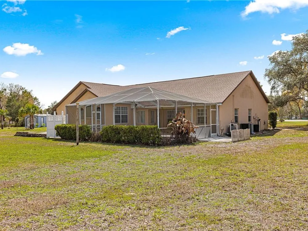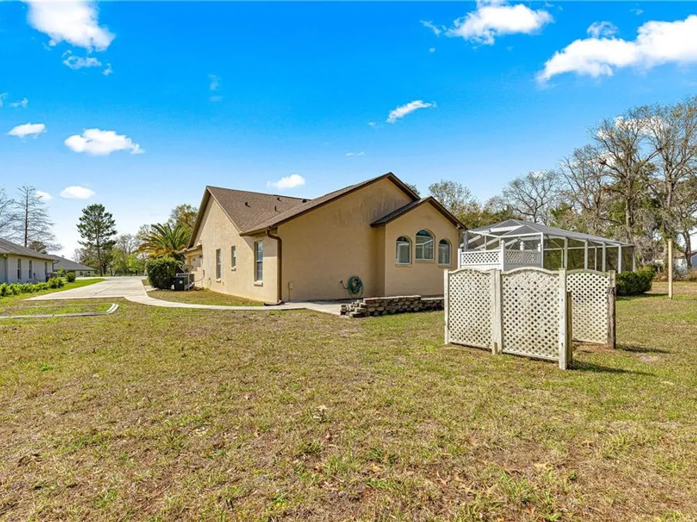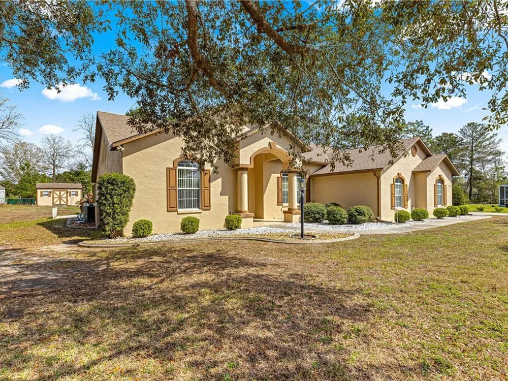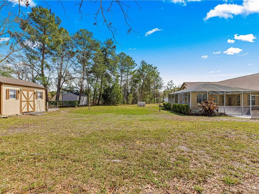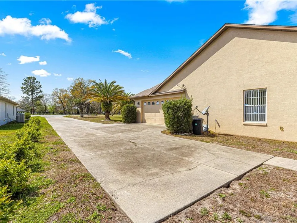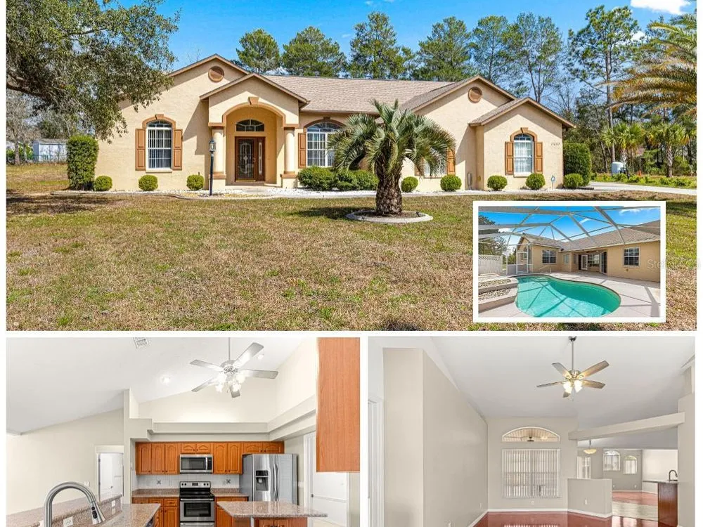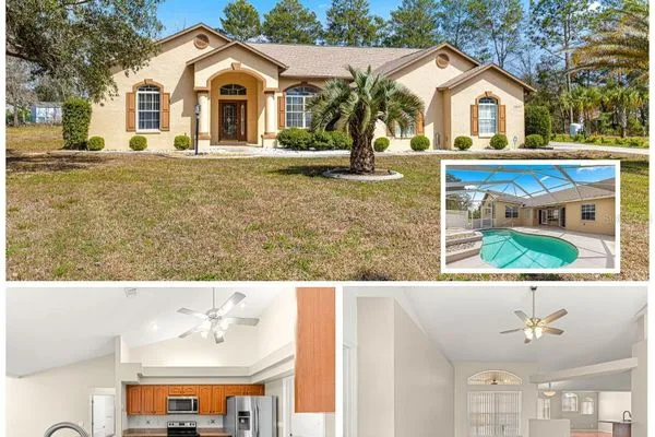 Pool, Palm Trees & an Oversized Lot! Discover the perfect blend of comfort and convenience in this 3-bedroom, 2-bathroom pool home, offering 2,150 sq. ft. of living space on a .61-acre lot in a peaceful cul-de-sac. An expansive driveway provides ample guest parking. Inside, enjoy a spacious, airy layout with vaulted ceilings and abundant natural light. The beautiful kitchen features granite countertops, backsplash, stainless steel appliances, and ample counter & cabinet space, plus a built-in wine rack—perfect for cooking and entertaining. The expanded master suite boasts wood flooring, a tray ceiling, and private pool access, creating a true retreat. The master bath includes dual sinks, a walk-in shower, and a relaxing garden tub. Step outside to your private backyard oasis, complete with a sparkling screened-in pool. The oversized lot is ideal for gardening, featuring a well for irrigation to keep everything lush year-round. Additional highlights include: a 2 car garage with a utility sink and pull down attic, Shed with electricity – great for storage or a workshop, Newer roof (2022) and water heater replaced in 2025 for peace of mind. Enjoy privacy, space, and true Florida living in a desirable location. Schedule your private tour today!