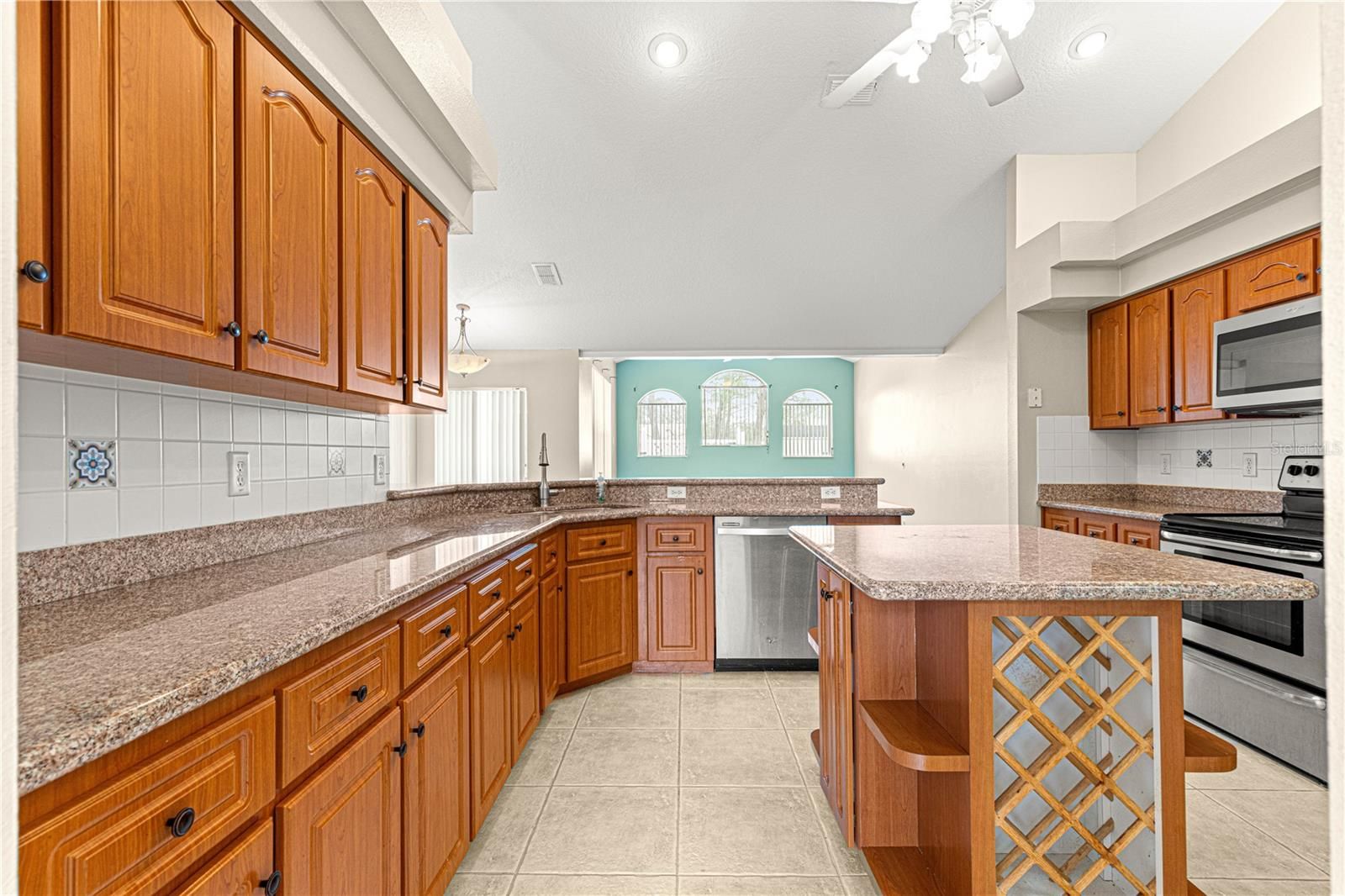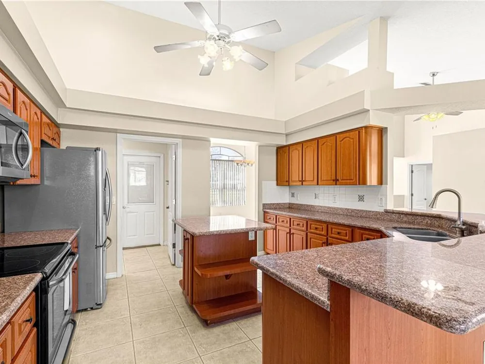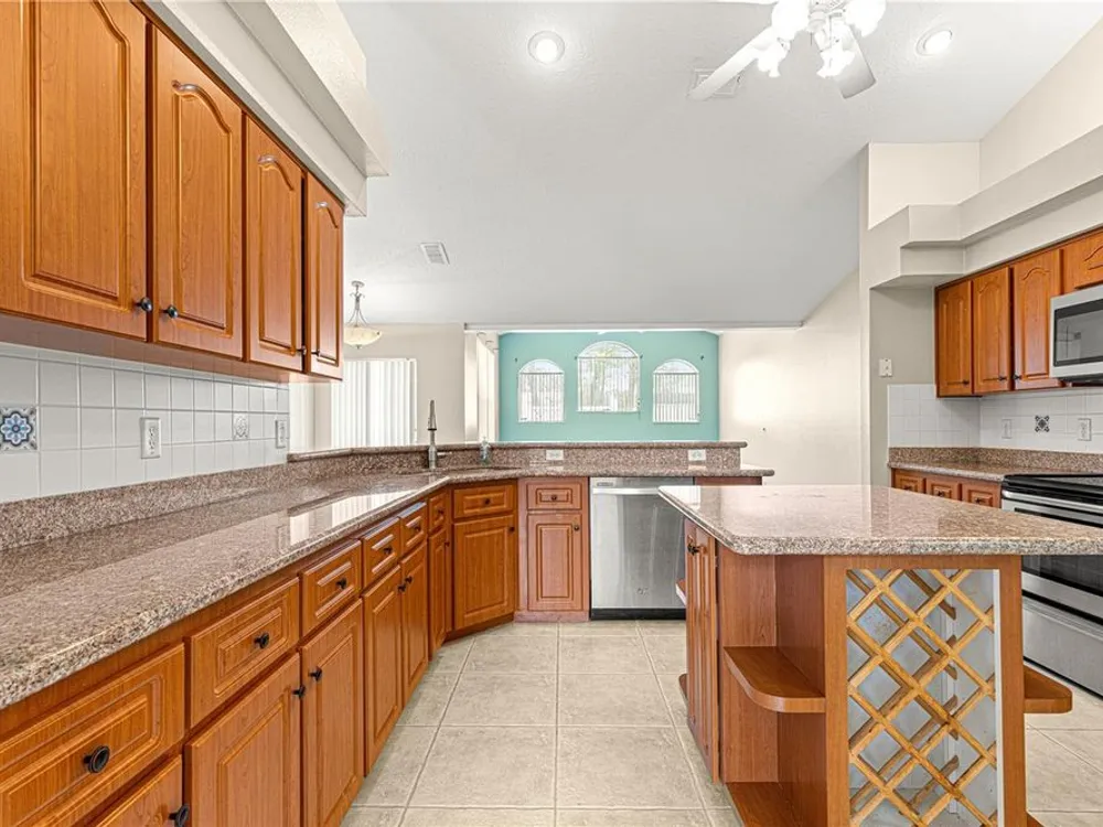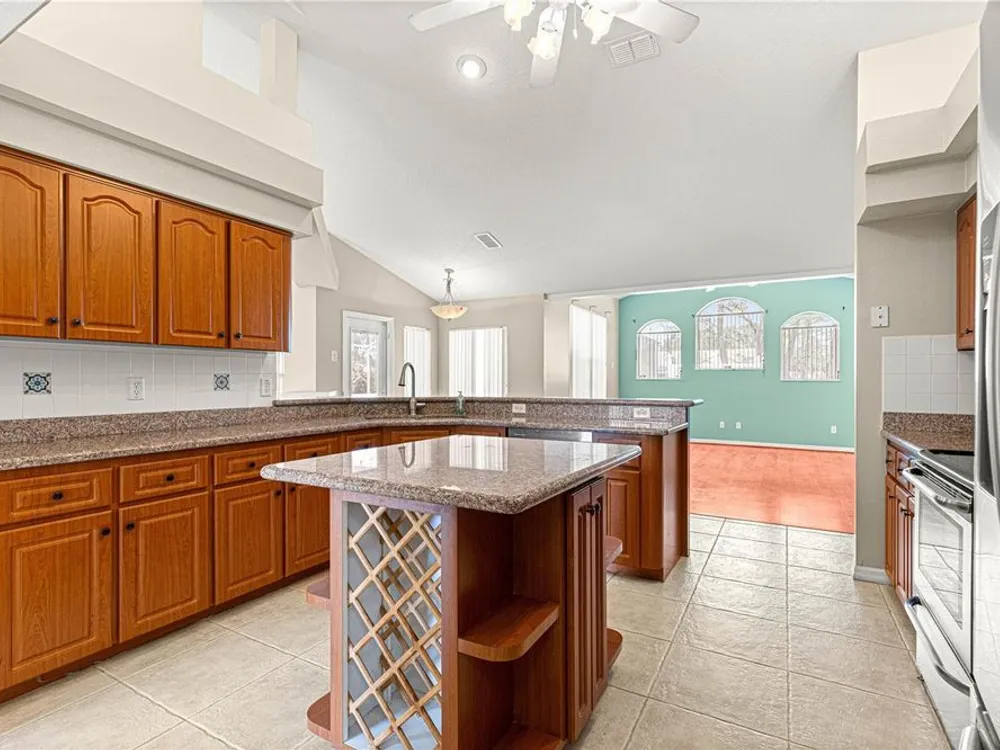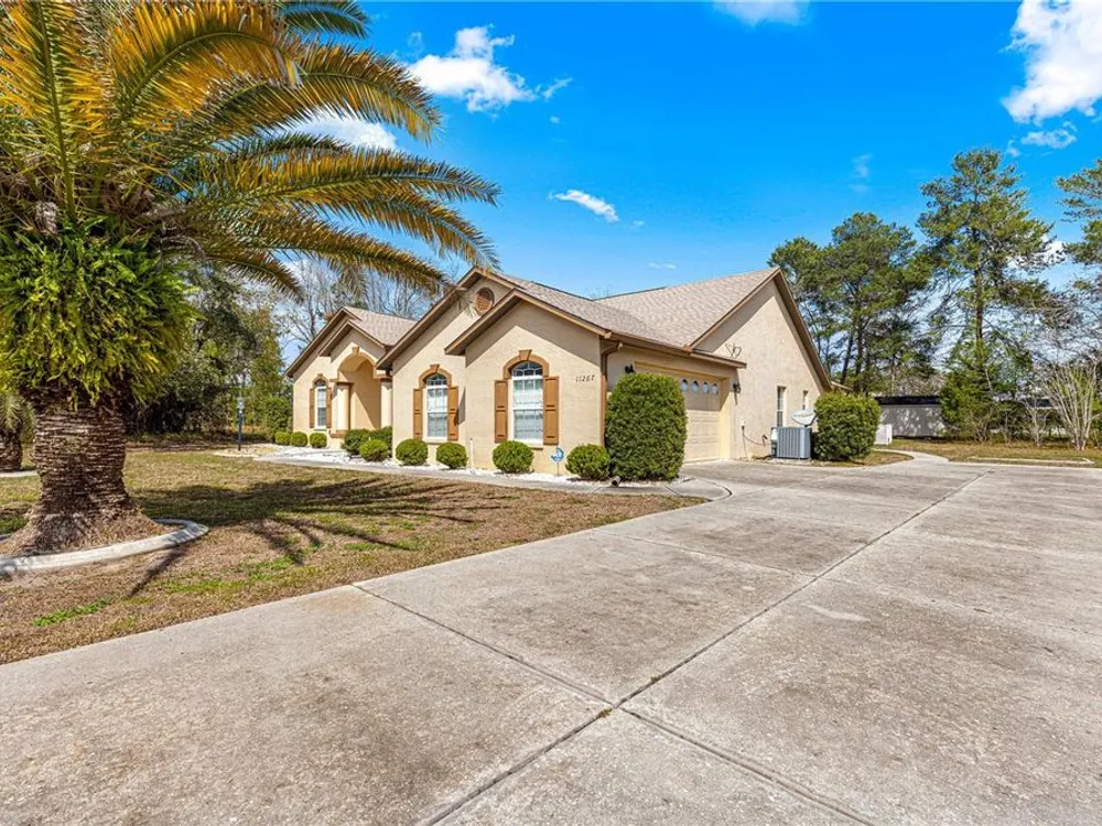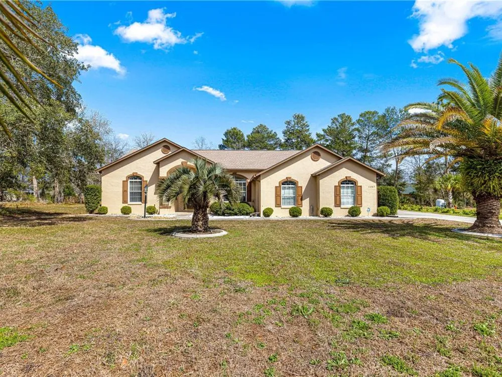 Pool, Palm Trees & an Oversized Lot! Discover the perfect blend of comfort and convenience in this 3-bedroom, 2-bathroom pool home, offering 2,150 sq. ft. of living space on a .61-acre lot in a peaceful cul-de-sac. An expansive driveway provides ample guest parking. Inside, enjoy a spacious, airy layout with vaulted ceilings and abundant natural light. The beautiful kitchen features granite countertops, backsplash, stainless steel appliances, and ample counter & cabinet space, plus a built-in wine rack—perfect for cooking and entertaining. The expanded master suite boasts wood flooring, a tray ceiling, and private pool access, creating a true retreat. The master bath includes dual sinks, a walk-in shower, and a relaxing garden tub. Step outside to your private backyard oasis, complete with a sparkling screened-in pool. The oversized lot is ideal for gardening, featuring a well for irrigation to keep everything lush year-round. Additional highlights include: a 2 car garage with a utility sink and pull down attic, Shed with electricity – great for storage or a workshop, Newer roof (2022) and water heater replaced in 2025 for peace of mind. Enjoy privacy, space, and true Florida living in a desirable location. Schedule your private tour today!