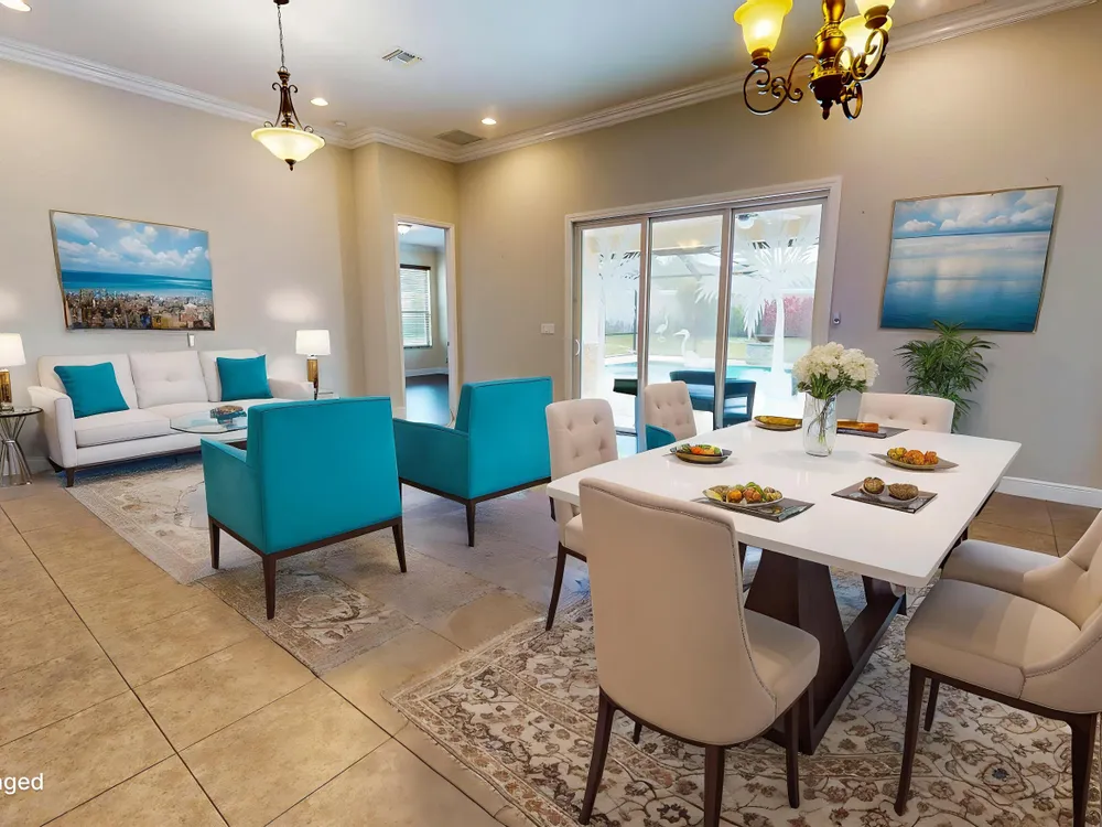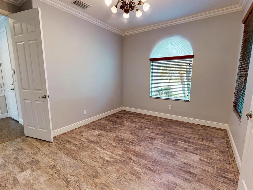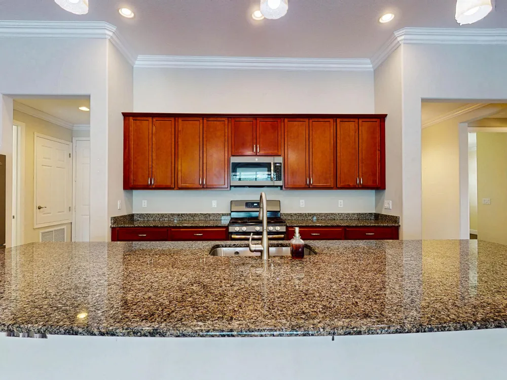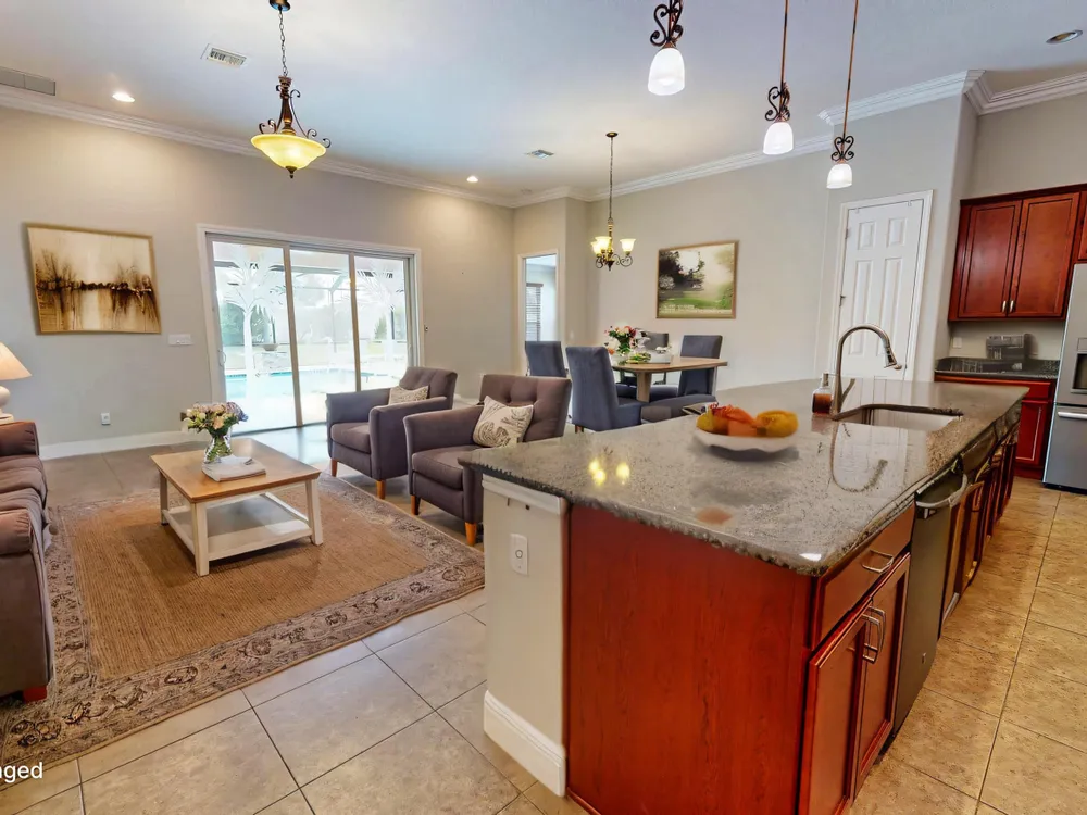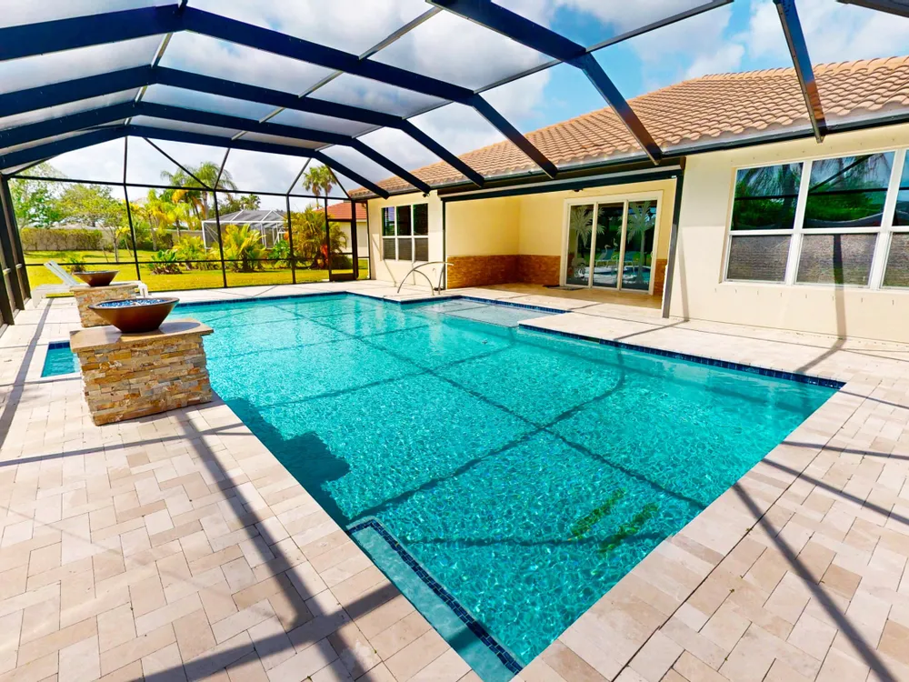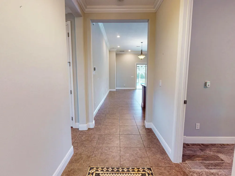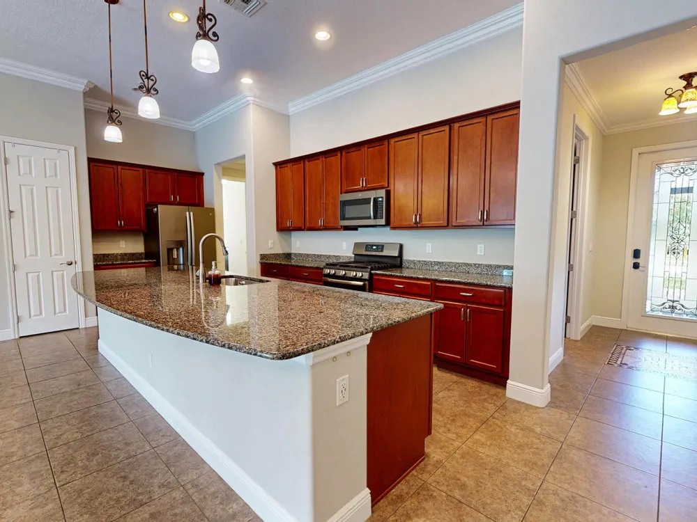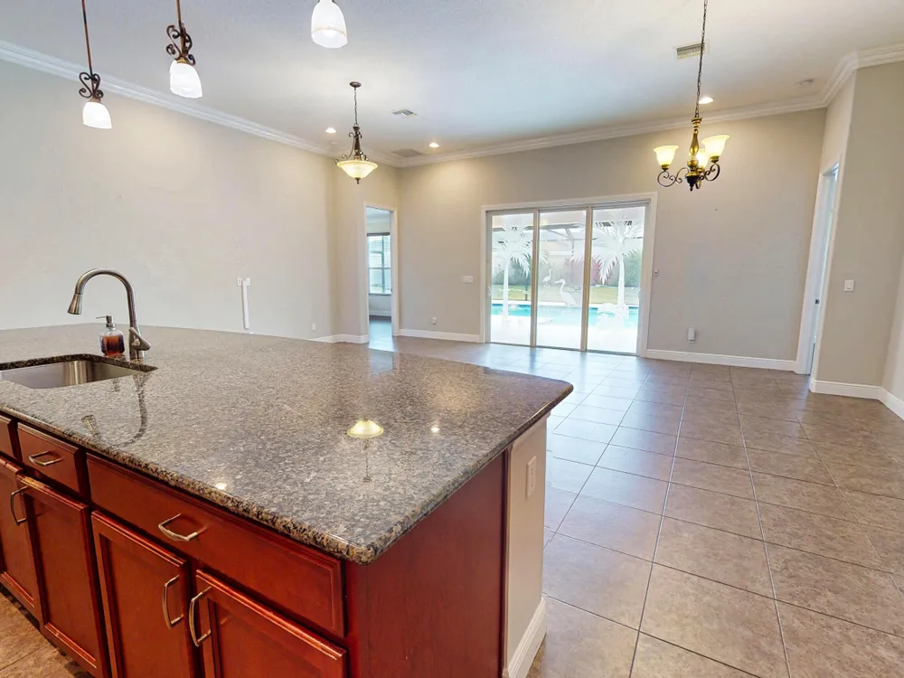 This stunning 3-bedroom, 3-bathroom home in Vitalia at Tradition with a spacious den offers the perfect blend of indoor comfort and outdoor luxury, all set on one of the largest pie-shaped lots in the community. The showpiece of the property is the expansive lanai, featuring a remote-controlled storm shade and elegant travertine flooring, which frames a spectacular saltwater heated pool--your own private retreat designed for year-round enjoyment and entertaining. Inside, the home boasts just under 2,300 square feet of thoughtfully designed living space with a bright and open layout. The large kitchen, dining, and living area flow seamlessly together, centered around a massive kitchen island that's perfect for gathering. A chef's dream, the kitchen is equipped with