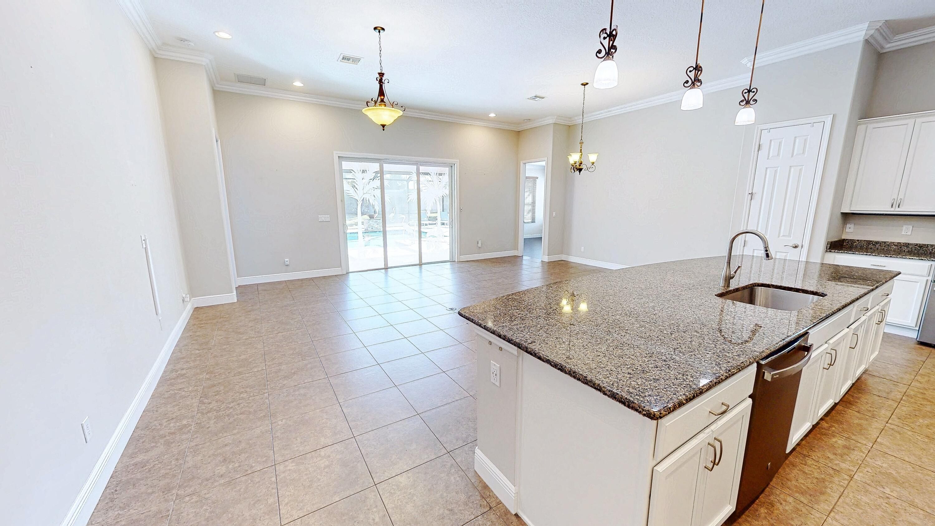This stunning 3-bedroom, 3-bathroom home in Vitalia at Tradition with a spacious den offers the perfect blend of indoor comfort and outdoor luxury, all set on one of the largest pie-shaped lots in the community. The showpiece of the property is the expansive lanai, featuring a remote-controlled storm shade and elegant travertine flooring, which frames a spectacular saltwater heated pool—your own private retreat designed for year-round enjoyment and entertaining. Inside, the home boasts just under 2,300 square feet of thoughtfully designed living space with a bright and open layout. The large kitchen, dining, and living area flow seamlessly together, centered around a massive kitchen island that's perfect for gathering. A chef's dream, the kitchen is equipped with 42-inch cabinets, a natural gas range, and ample counter space, offering both style and functionality. This home offers dual oversized master suites, each with its own walk-in closet, dual vanities with his-and-her sinks, and modern stand-up showersideal for privacy, comfort, or multi-generational living. A third bedroom and full guest bath are located at the front of the home, providing a quiet and separate space for visitors. A spacious, versatile den adds even more flexibility, making an ideal home office, hobby room, gym, or media space. With its resort-style pool area, upgraded finishes, and unique lot size, this home is a rare gem that combines everyday convenience with exceptional outdoor living within stunning Vitalia at Tradition.
