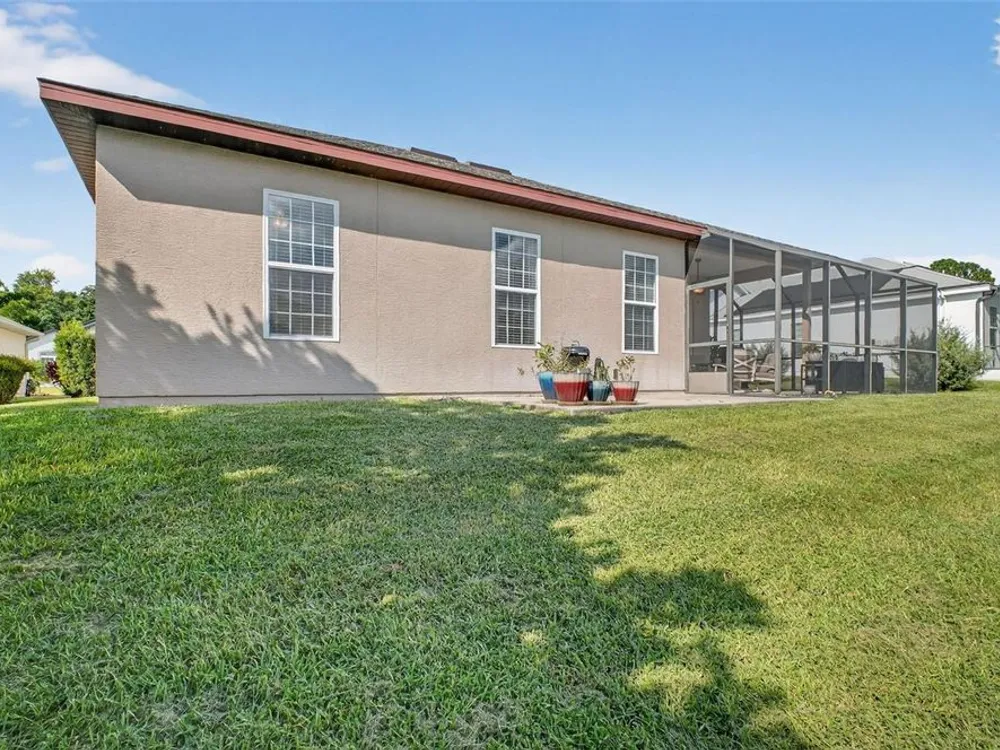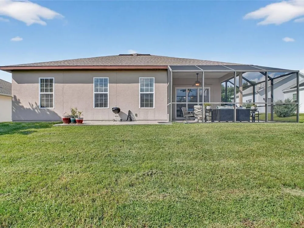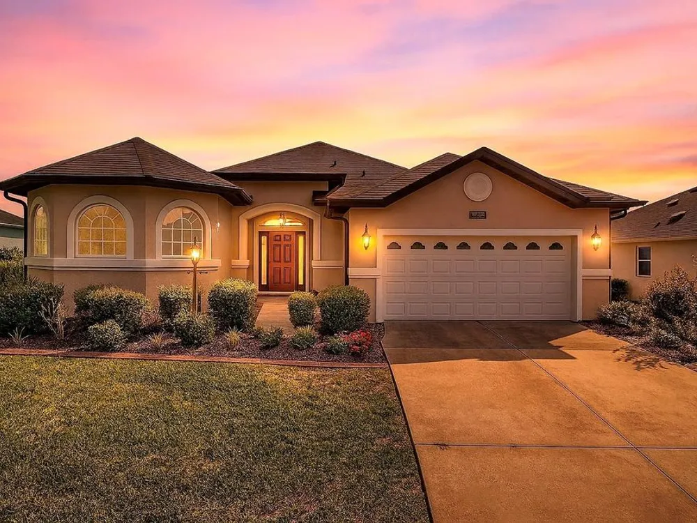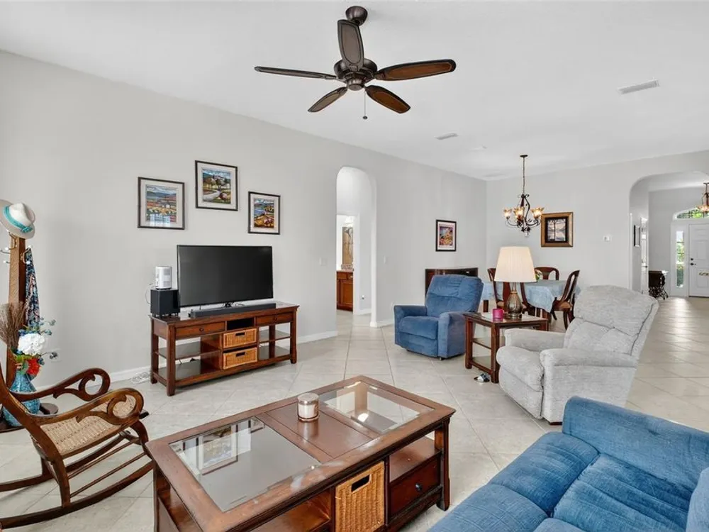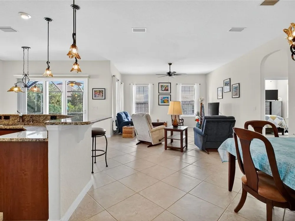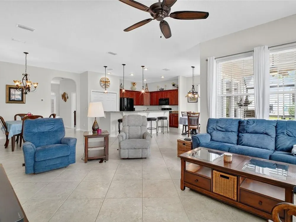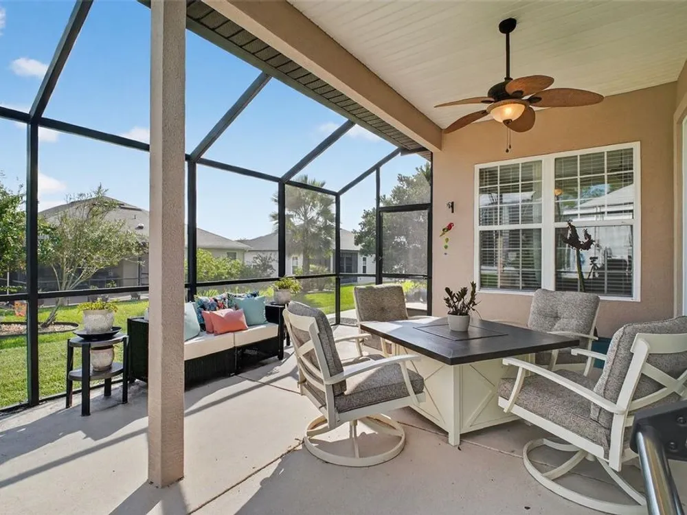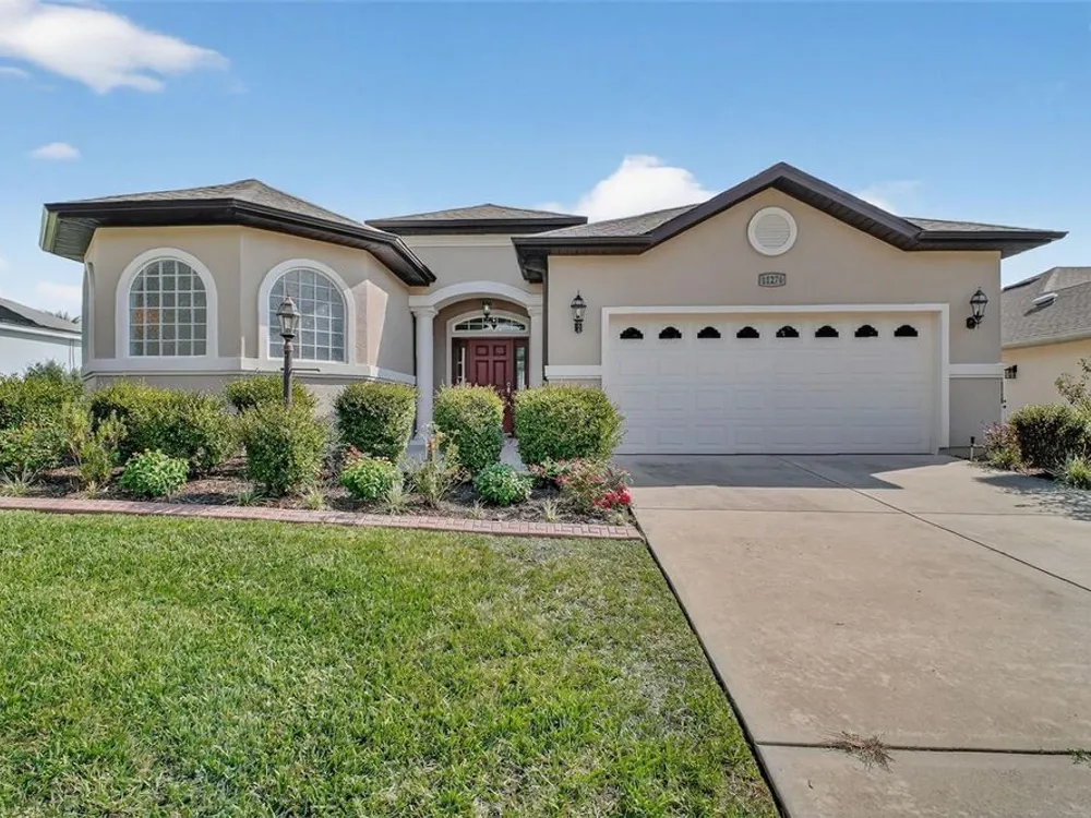 Situated in the heart of STONECREST’S vibrant 55+ community, just minutes from THE VILLAGES. This beautifully maintained 3-bedroom, 2-bath home offers 2,000 square feet of living space with soaring 10-FOOT CEILINGS and an open floor plan filled with natural light. The spacious living and dining areas are anchored by rich ceramic TILE FLOORING and flow seamlessly into a chef's kitchen featuring GRANITE COUNTER-TOPS, pendant lighting, a BREAKFAST BAR, a LARGE PANTRY, and a cozy breakfast nook. The primary suite is a relaxing retreat with a TRAY CEILING, ceiling fan, his-and-hers WALK-IN CLOSETS, and a spa-inspired en-suite bathroom with DUAL GRANITE VANITIES, a beautifully TILED WALK-IN SHOWER, and a stunning GARDEN TUB framed by arched privacy windows. Two generously sized guest bedrooms, each with a built-in closet and newer plush carpeting, are served by a full guest bathroom featuring a granite vanity and a tiled tub-shower combo. A separate laundry room provides added convenience and functionality. The spacious TWO-CAR GARAGE offers plenty of room for vehicles, golf carts, and storage. Step outside to enjoy the Florida lifestyle in the SCREENED LANAI featuring an EXTENDED BIRDCAGE and ceiling fan, perfect for year-round entertaining or quiet mornings. Additional highlights include a NEWER HVAC SYSTEM (2021), neutral interior tones, and a beautifully landscaped yard. Residents of Stonecrest enjoy resort-style amenities including indoor and outdoor pools, tennis and pickleball courts, a softball field, RV storage, and golf cart access to THE VILLAGES. This home truly offers a blend of luxury, comfort, and community-focused living.