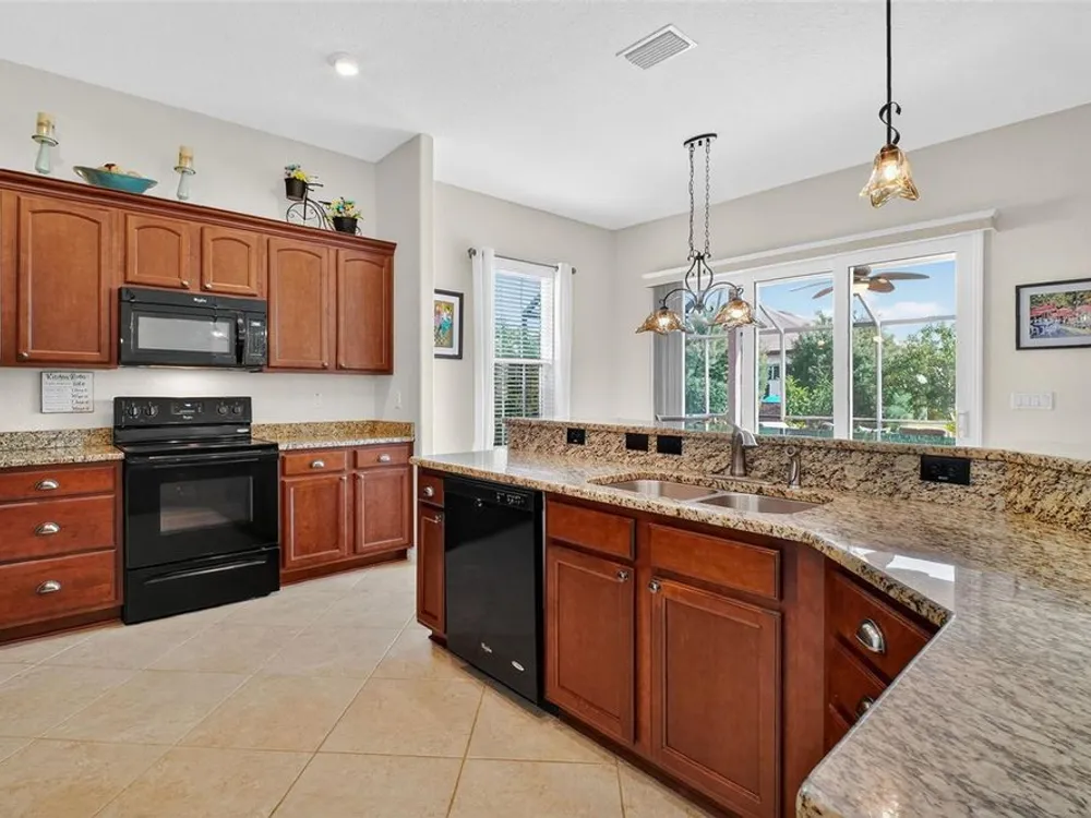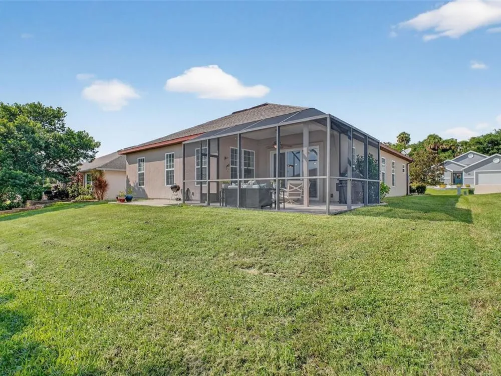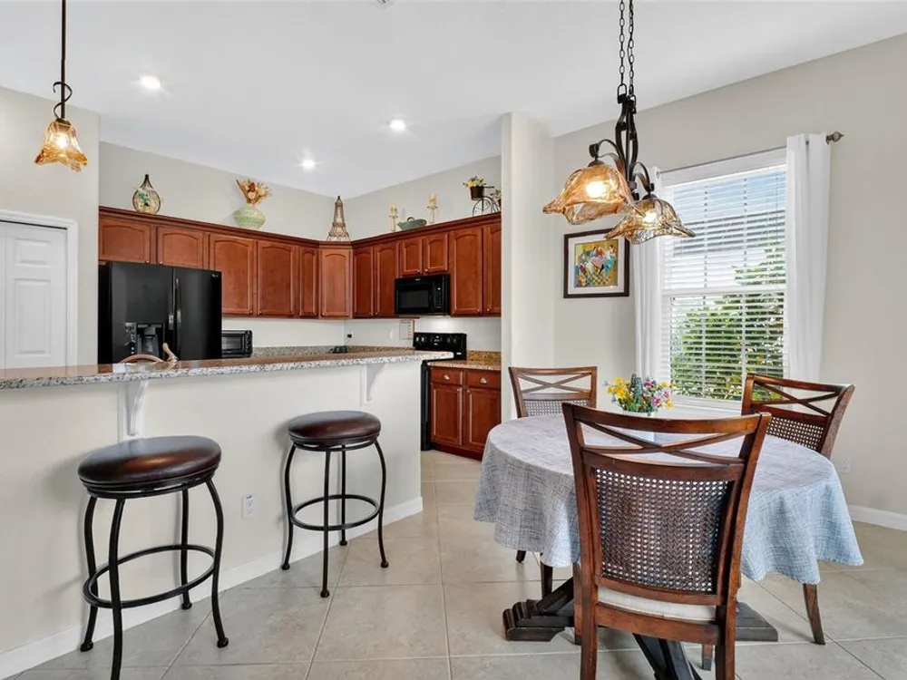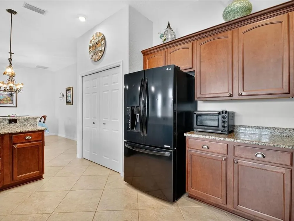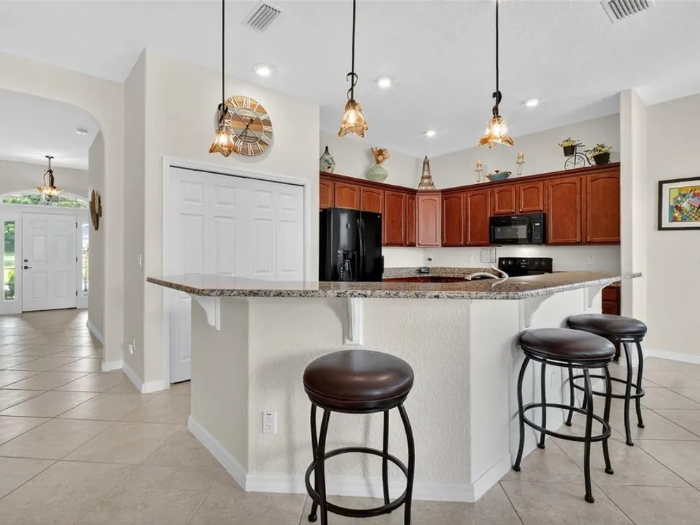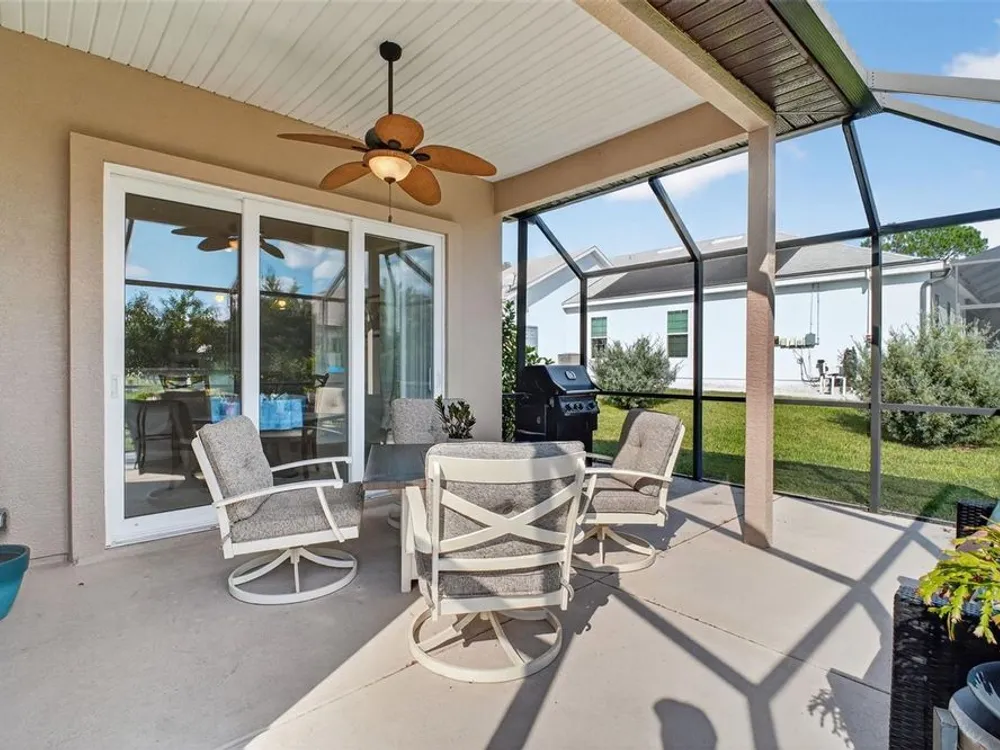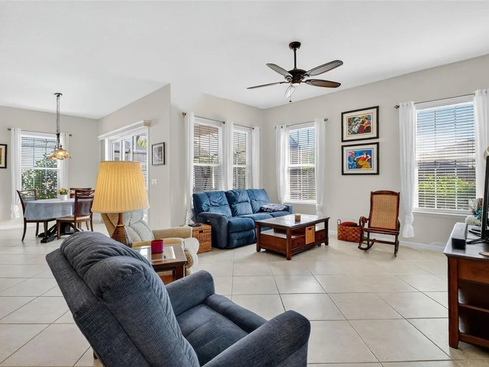 Situated in the heart of STONECREST’S vibrant 55+ community, just minutes from THE VILLAGES. This beautifully maintained 3-bedroom, 2-bath home offers 2,000 square feet of living space with soaring 10-FOOT CEILINGS and an open floor plan filled with natural light. The spacious living and dining areas are anchored by rich ceramic TILE FLOORING and flow seamlessly into a chef's kitchen featuring GRANITE COUNTER-TOPS, pendant lighting, a BREAKFAST BAR, a LARGE PANTRY, and a cozy breakfast nook. The primary suite is a relaxing retreat with a TRAY CEILING, ceiling fan, his-and-hers WALK-IN CLOSETS, and a spa-inspired en-suite bathroom with DUAL GRANITE VANITIES, a beautifully TILED WALK-IN SHOWER, and a stunning GARDEN TUB framed by arched privacy windows. Two generously sized guest bedrooms, each with a built-in closet and newer plush carpeting, are served by a full guest bathroom featuring a granite vanity and a tiled tub-shower combo. A separate laundry room provides added convenience and functionality. The spacious TWO-CAR GARAGE offers plenty of room for vehicles, golf carts, and storage. Step outside to enjoy the Florida lifestyle in the SCREENED LANAI featuring an EXTENDED BIRDCAGE and ceiling fan, perfect for year-round entertaining or quiet mornings. Additional highlights include a NEWER HVAC SYSTEM (2021), neutral interior tones, and a beautifully landscaped yard. Residents of Stonecrest enjoy resort-style amenities including indoor and outdoor pools, tennis and pickleball courts, a softball field, RV storage, and golf cart access to THE VILLAGES. This home truly offers a blend of luxury, comfort, and community-focused living.