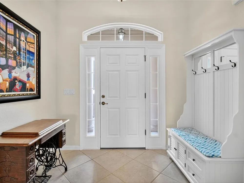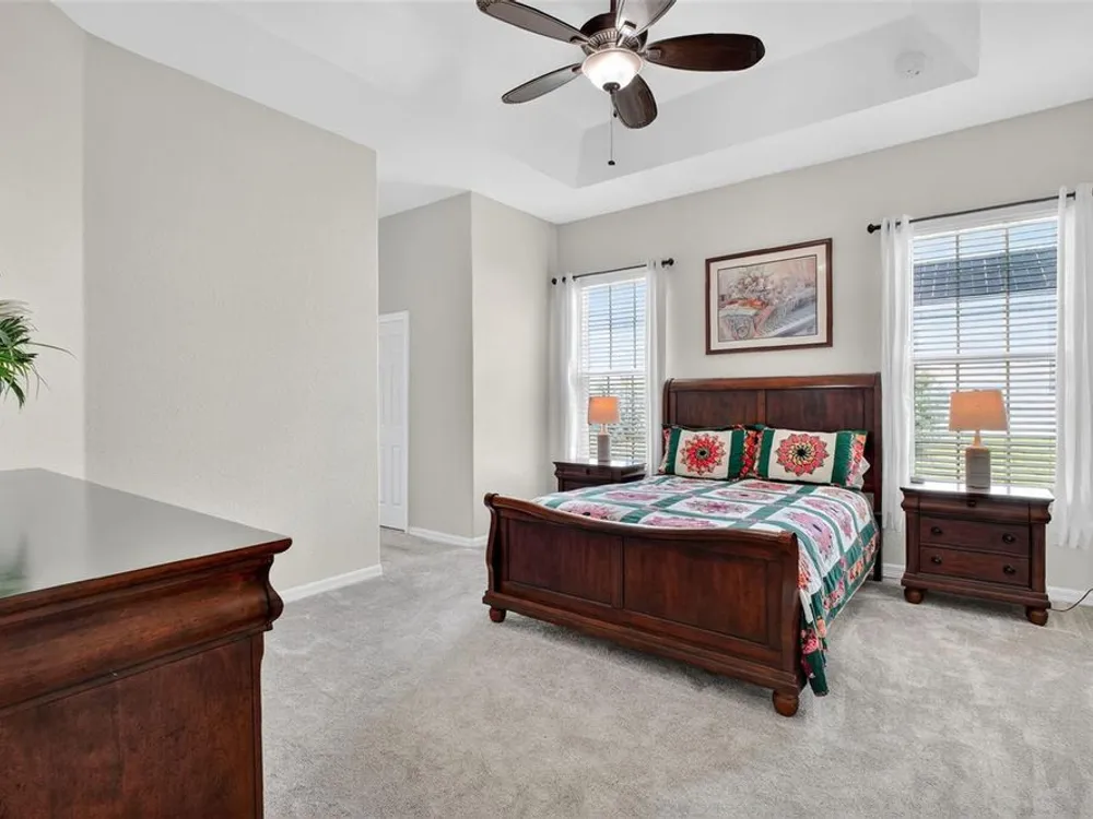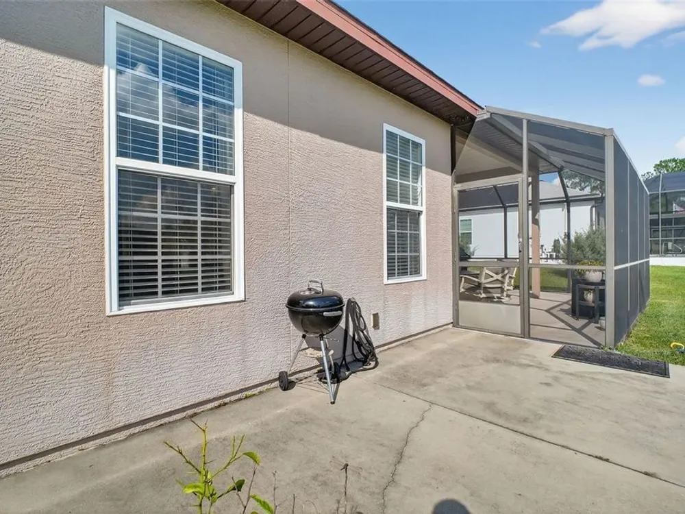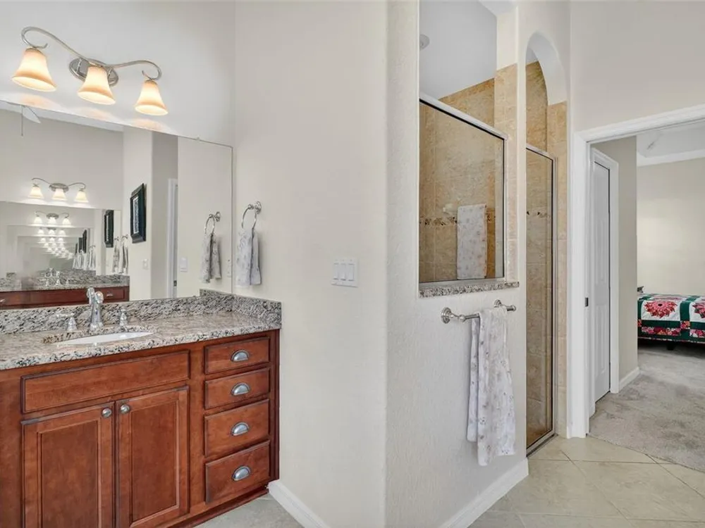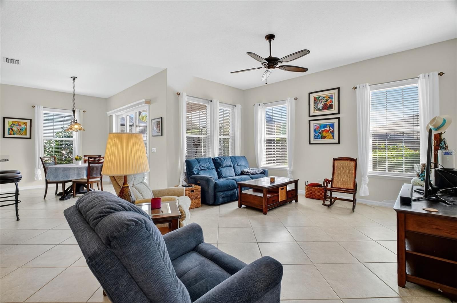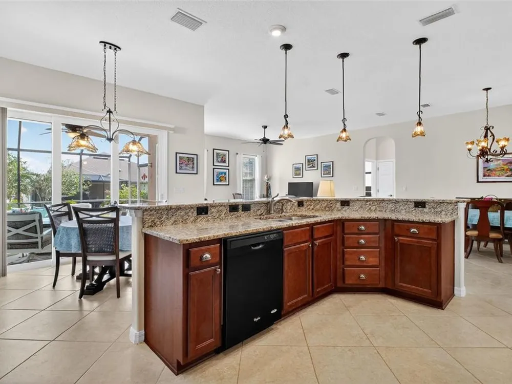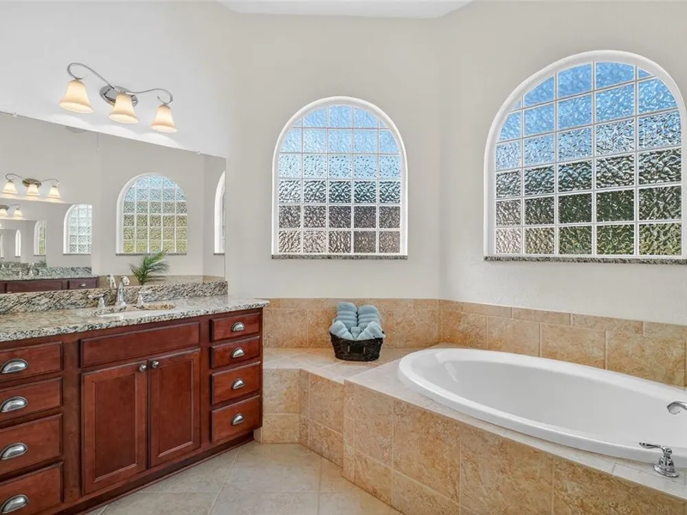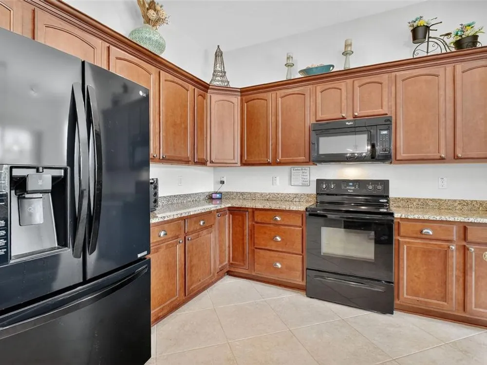 Situated in the heart of STONECREST’S vibrant 55+ community, just minutes from THE VILLAGES. This beautifully maintained 3-bedroom, 2-bath home offers 2,000 square feet of living space with soaring 10-FOOT CEILINGS and an open floor plan filled with natural light. The spacious living and dining areas are anchored by rich ceramic TILE FLOORING and flow seamlessly into a chef's kitchen featuring GRANITE COUNTER-TOPS, pendant lighting, a BREAKFAST BAR, a LARGE PANTRY, and a cozy breakfast nook. The primary suite is a relaxing retreat with a TRAY CEILING, ceiling fan, his-and-hers WALK-IN CLOSETS, and a spa-inspired en-suite bathroom with DUAL GRANITE VANITIES, a beautifully TILED WALK-IN SHOWER, and a stunning GARDEN TUB framed by arched privacy windows. Two generously sized guest bedrooms, each with a built-in closet and newer plush carpeting, are served by a full guest bathroom featuring a granite vanity and a tiled tub-shower combo. A separate laundry room provides added convenience and functionality. The spacious TWO-CAR GARAGE offers plenty of room for vehicles, golf carts, and storage. Step outside to enjoy the Florida lifestyle in the SCREENED LANAI featuring an EXTENDED BIRDCAGE and ceiling fan, perfect for year-round entertaining or quiet mornings. Additional highlights include a NEWER HVAC SYSTEM (2021), neutral interior tones, and a beautifully landscaped yard. Residents of Stonecrest enjoy resort-style amenities including indoor and outdoor pools, tennis and pickleball courts, a softball field, RV storage, and golf cart access to THE VILLAGES. This home truly offers a blend of luxury, comfort, and community-focused living.