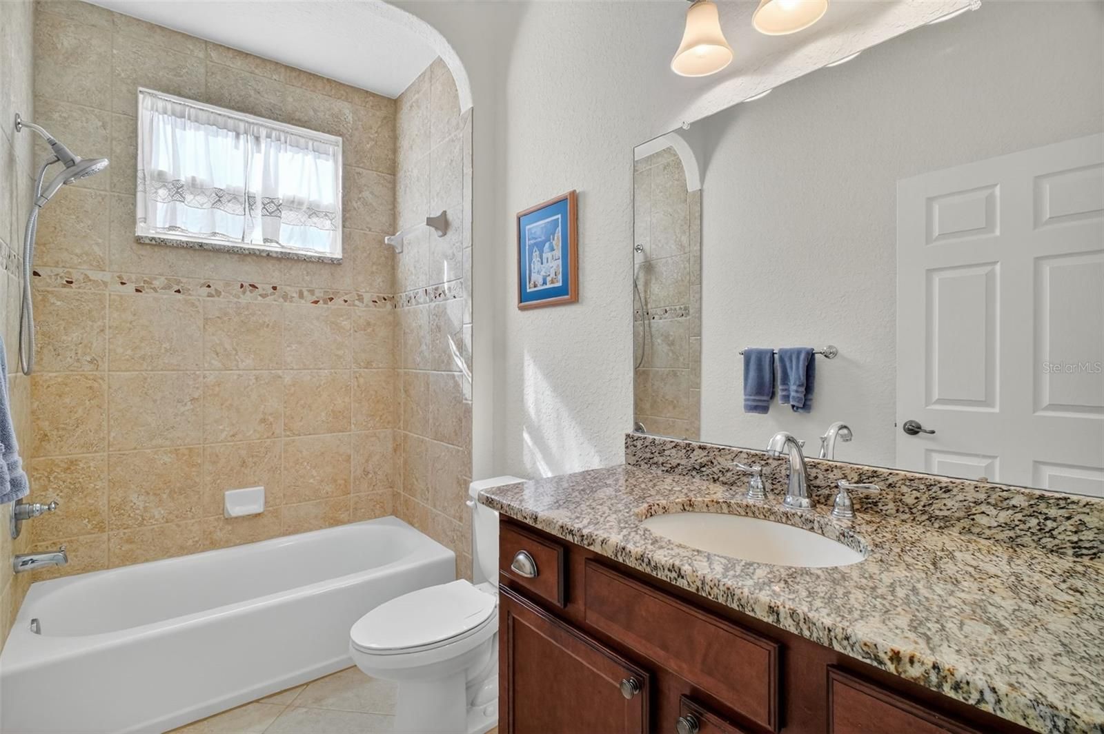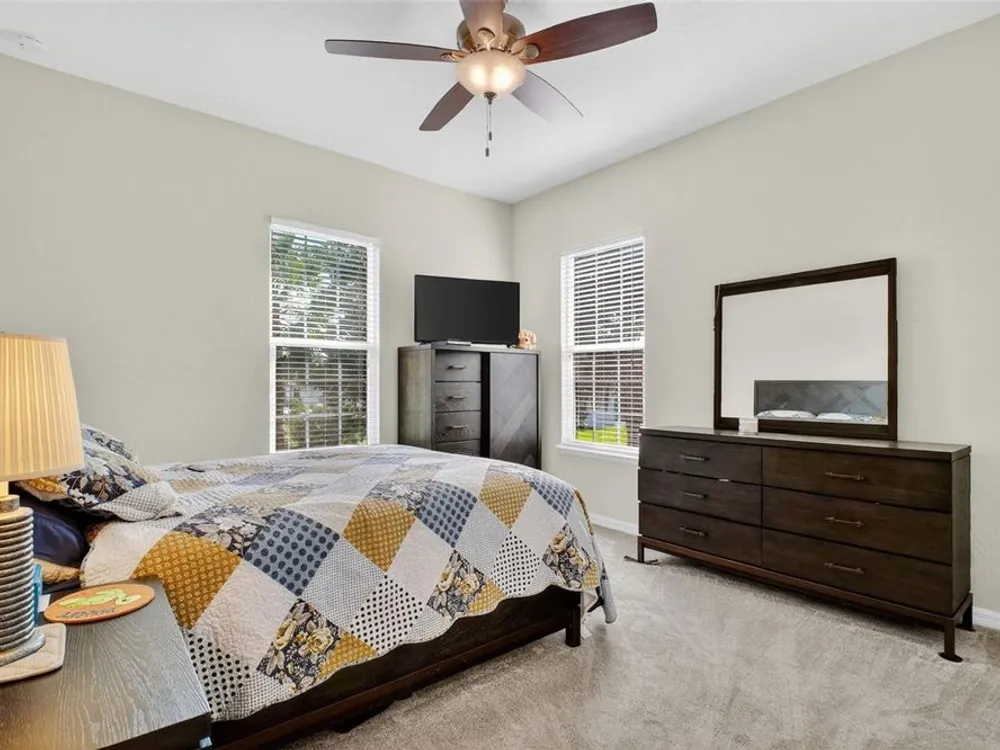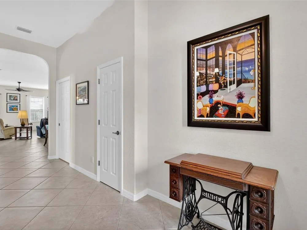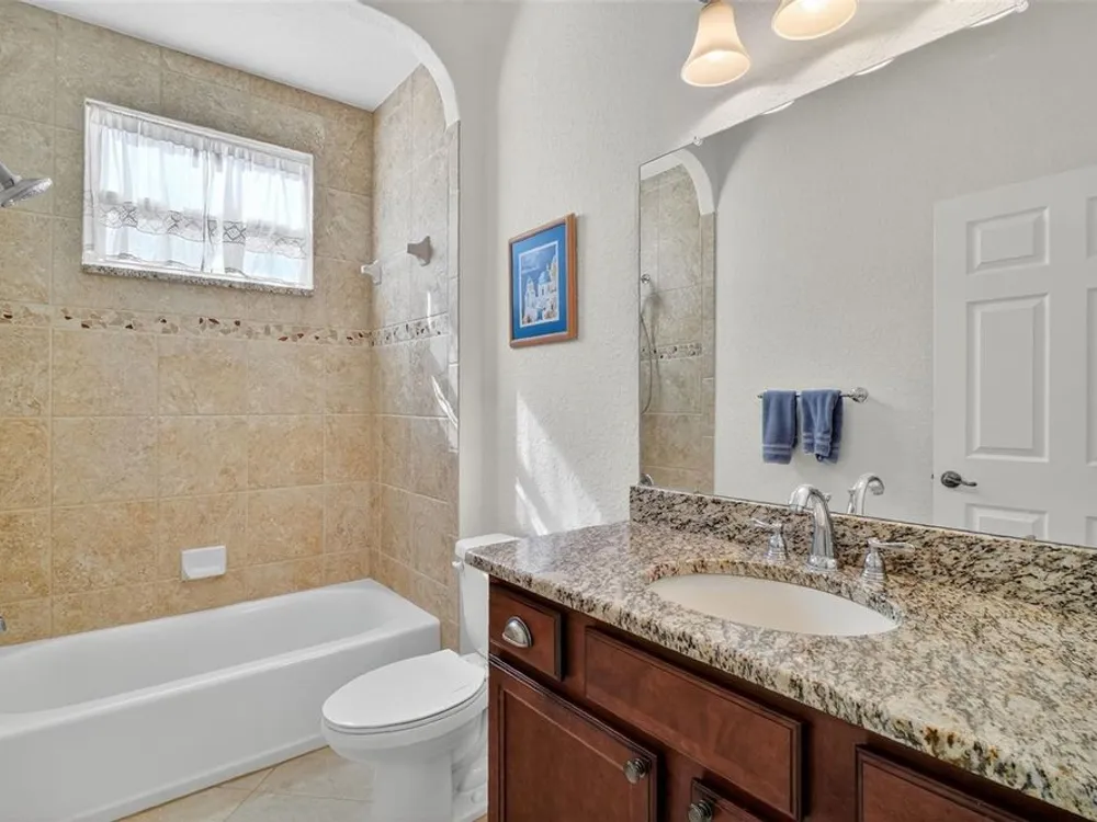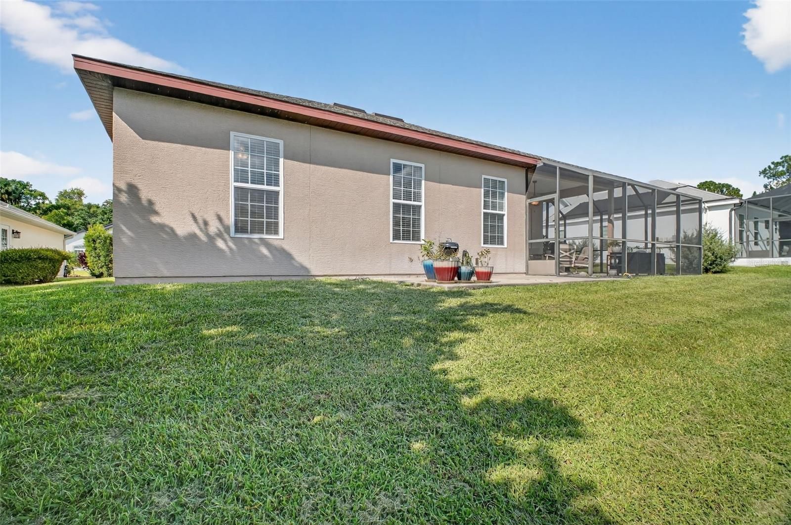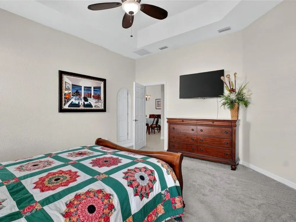 Situated in the heart of STONECREST’S vibrant 55+ community, just minutes from THE VILLAGES. This beautifully maintained 3-bedroom, 2-bath home offers 2,000 square feet of living space with soaring 10-FOOT CEILINGS and an open floor plan filled with natural light. The spacious living and dining areas are anchored by rich ceramic TILE FLOORING and flow seamlessly into a chef's kitchen featuring GRANITE COUNTER-TOPS, pendant lighting, a BREAKFAST BAR, a LARGE PANTRY, and a cozy breakfast nook. The primary suite is a relaxing retreat with a TRAY CEILING, ceiling fan, his-and-hers WALK-IN CLOSETS, and a spa-inspired en-suite bathroom with DUAL GRANITE VANITIES, a beautifully TILED WALK-IN SHOWER, and a stunning GARDEN TUB framed by arched privacy windows. Two generously sized guest bedrooms, each with a built-in closet and newer plush carpeting, are served by a full guest bathroom featuring a granite vanity and a tiled tub-shower combo. A separate laundry room provides added convenience and functionality. The spacious TWO-CAR GARAGE offers plenty of room for vehicles, golf carts, and storage. Step outside to enjoy the Florida lifestyle in the SCREENED LANAI featuring an EXTENDED BIRDCAGE and ceiling fan, perfect for year-round entertaining or quiet mornings. Additional highlights include a NEWER HVAC SYSTEM (2021), neutral interior tones, and a beautifully landscaped yard. Residents of Stonecrest enjoy resort-style amenities including indoor and outdoor pools, tennis and pickleball courts, a softball field, RV storage, and golf cart access to THE VILLAGES. This home truly offers a blend of luxury, comfort, and community-focused living.