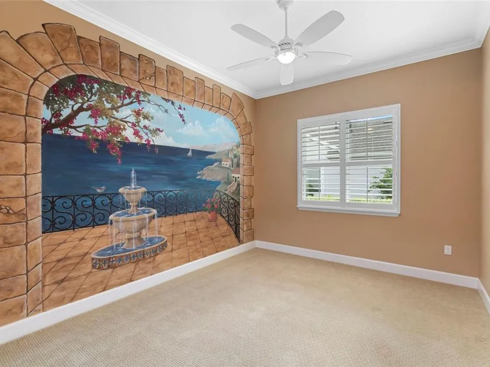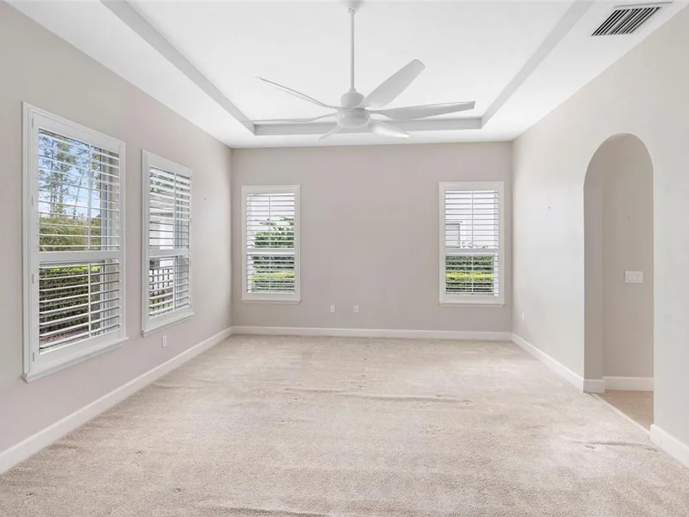 - Built-in Features, Ceiling Fan(s), Coffered Ceiling(s), Crown Molding, Eat-in Kitchen, High Ceilings, Open Floorplan, Main Level Primary, Solid Surface Counters, Split Bedrooms, Stone Counters, Tray Ceiling(s), Walk-In Closet(s), Window Treatments