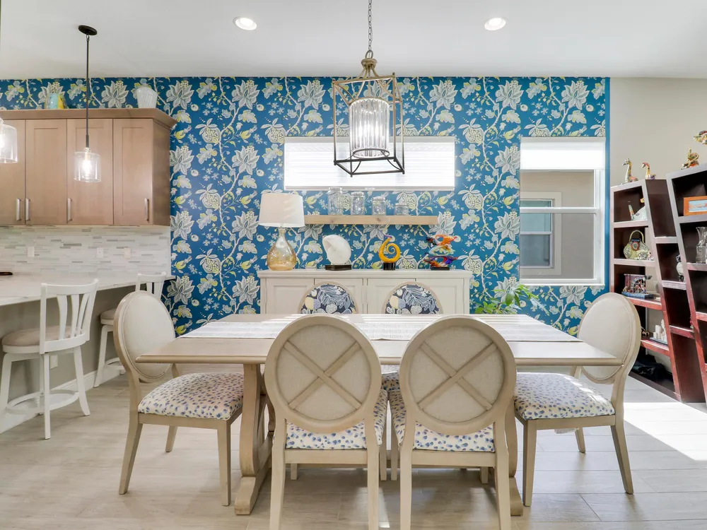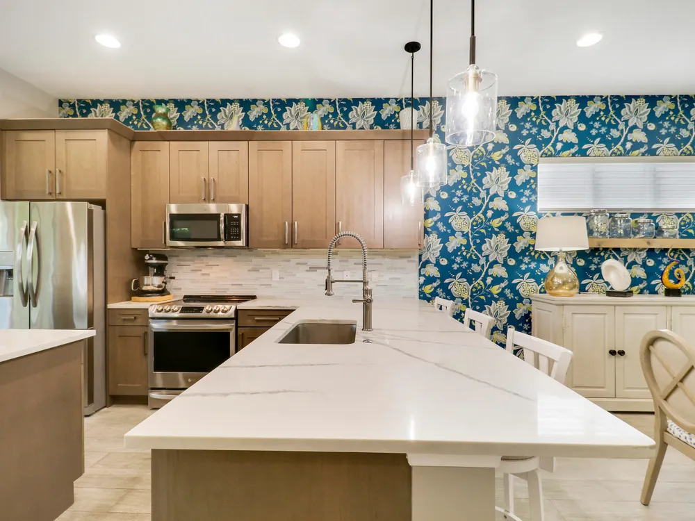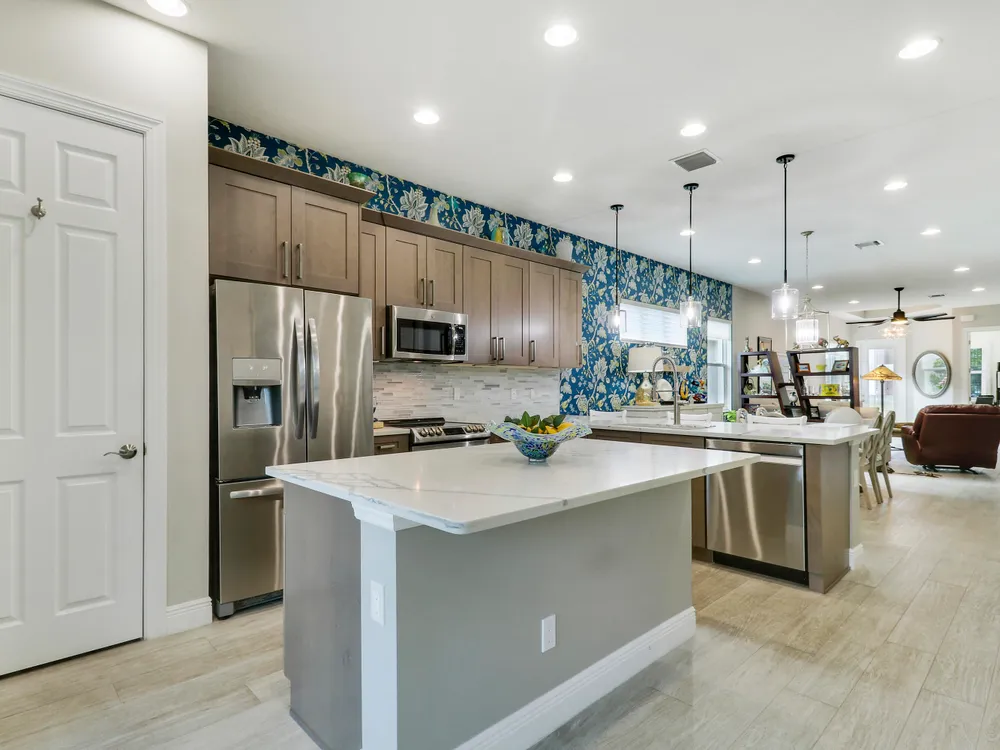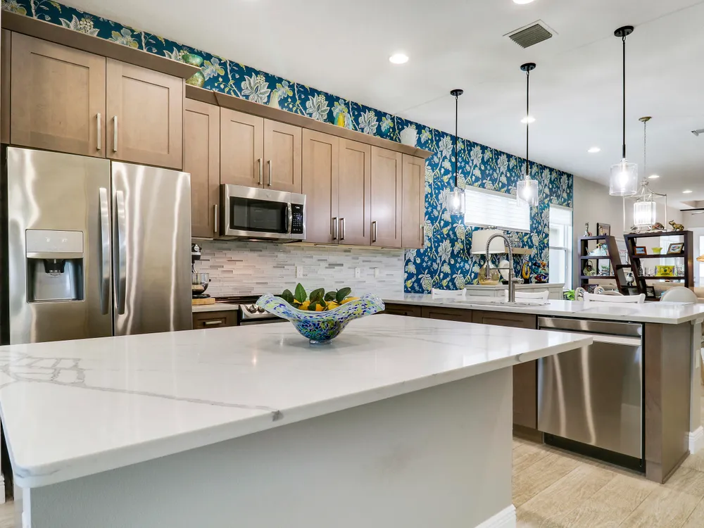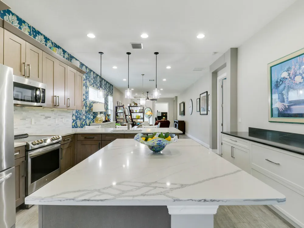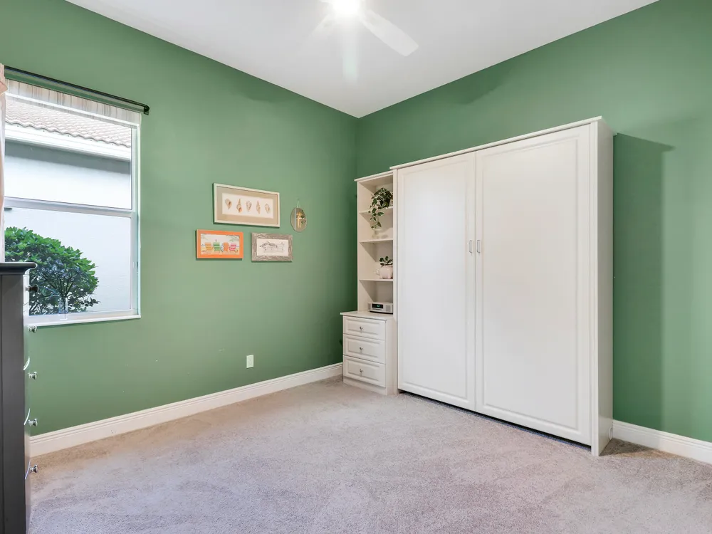 THIS HOME IS BRIMMING WITH CHARM & CHARACTER! Spacious 2BR+Den/2BA/2CG 'Casita' plan with private, fenced back yard. Some of the many special features include decorative glass entry front door, elegant lighting & fans throughout, upgraded window treatments, wallpaper accent, wood flooring in the master bedroom, murphy bed in the guest bedroom, front load washer & dryer, spacious fenced yard, quartz counters throughout, custom organizers in the master closet and more! Wood look tile runs through the main living areas. The spacious kitchen is fit for cooking enthusiasts and features 42'' wood cabinetry, quartz counters, center island, upgraded stainless steel appliances, breakfast bar seating, custom built storage center with drawers, pendant lighting, tiled backsplash and pantry closet.
