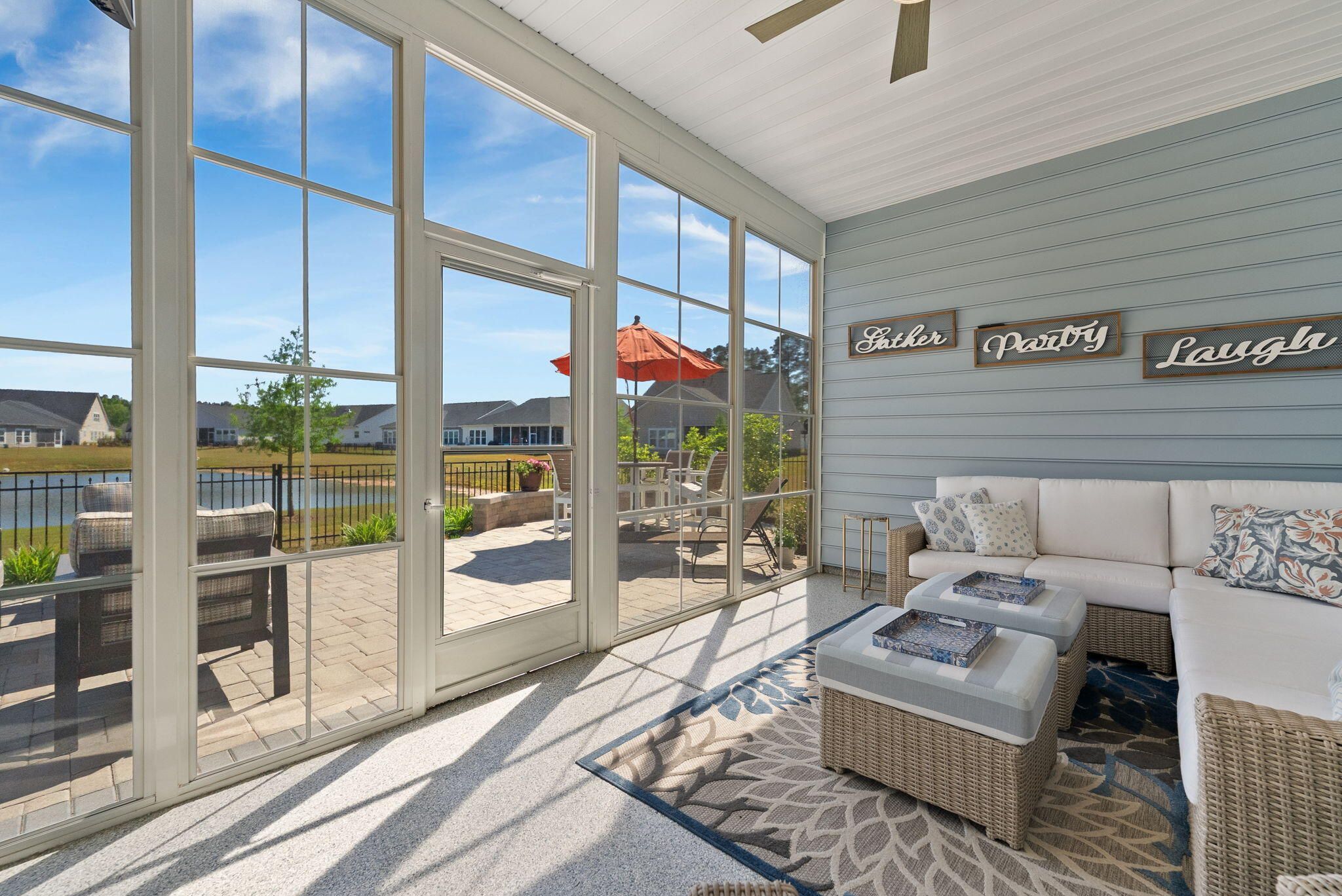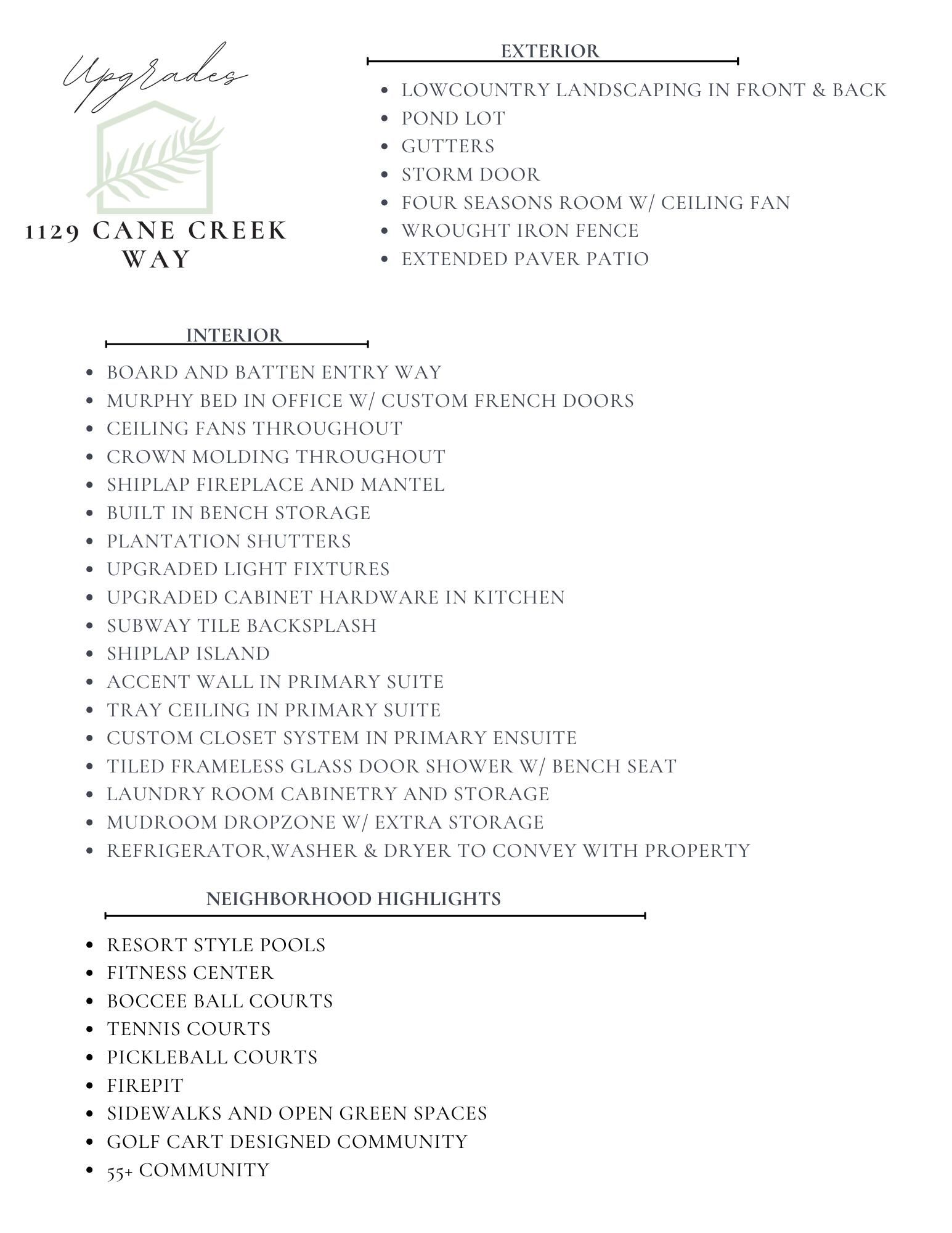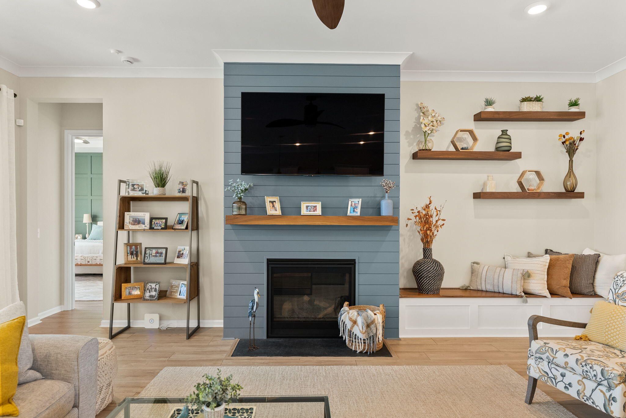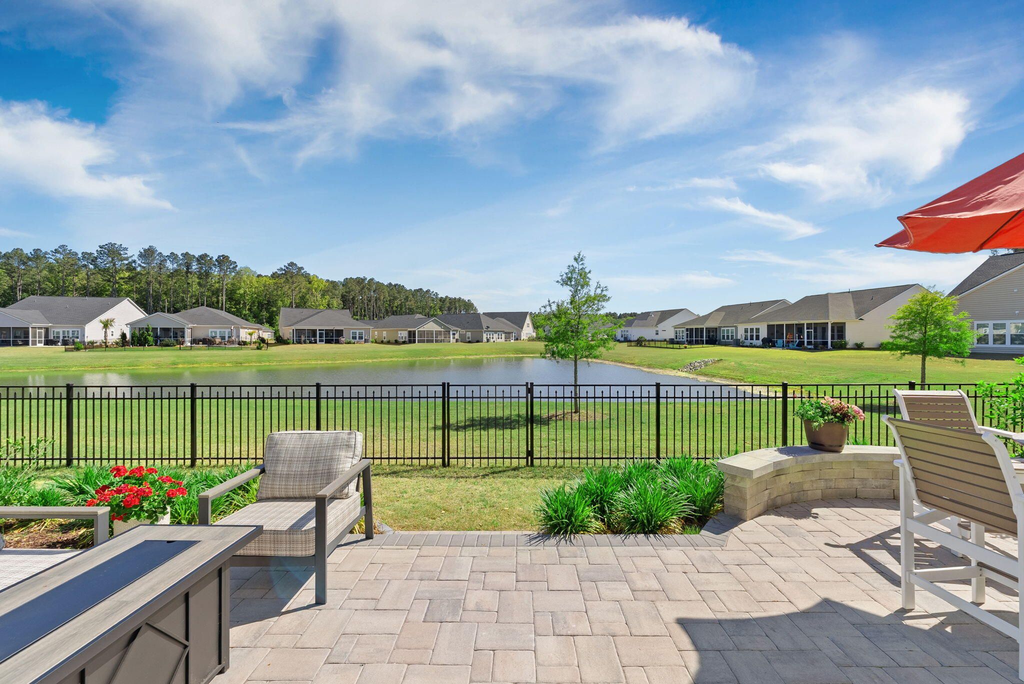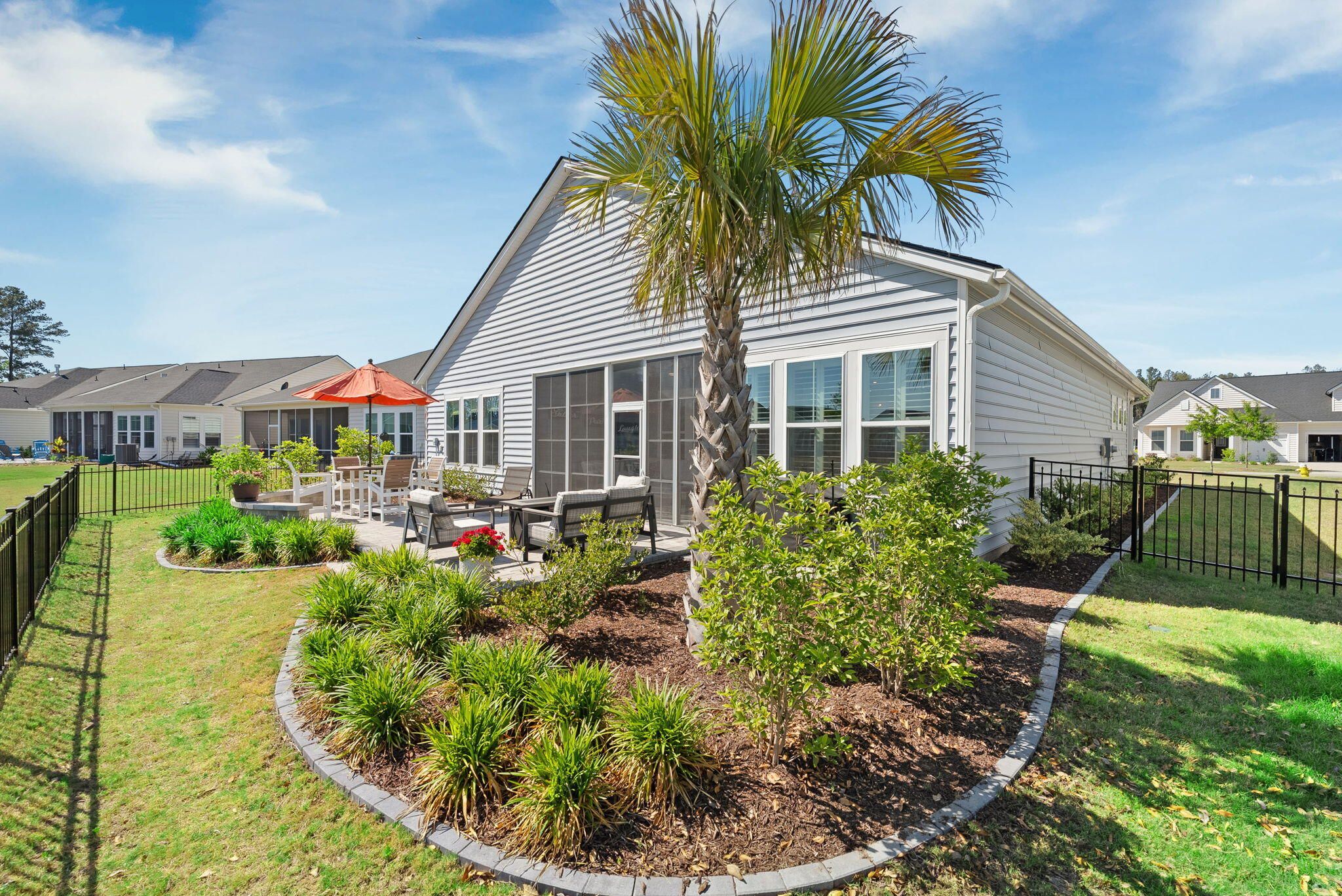 Welcome to 1129 Cane Creek Way, an immaculate and beautifully upgraded 3-bedroom, 2-bathroom home located in the sought-after Horizons active 55+ community within Summers Corner. From the moment you arrive, the spacious 3-car garage, inviting front porch, and beautifully maintained landscaping create a warm and welcoming first impression.Step inside to a bright entryway featuring custom board and batten trim that leads to a dedicated home office complete with custom French doors and a Murphy bed for extra guests. Throughout the home, elegant plantation shutters add timeless charm and sophistication while enhancing the abundance of natural light. Continue down the hall into a light-filled, open-concept living space designed for both everyday comfort and effortless entertaining.The stunning living room is filled with natural light and showcases peaceful views of your backyard oasis. Cozy up beside the beautiful shiplap fireplace with a custom mantel, creating a striking focal point for the space. Just off the fireplace is a custom built-in storage bench, perfect for added decoration, storage, and everyday functionality, adding both charm and practicality to the living space. The kitchen is truly the heart of the home, featuring crisp white cabinetry, white quartz countertops, and a classic subway tile backsplash. Stainless steel appliances, upgraded cabinet hardware, and designer gold light fixtures seamlessly tie the space together, while the large center island with matching shiplap accents makes this kitchen as functional as it is beautiful. Just off the kitchen, the spacious eat-in dining area provides additional space for gathering and everyday living. Step outside and enjoy your private Lowcountry retreat featuring a stunning four seasons room with finished flooring, vinyl windows, and a ceiling fan, creating the perfect year-round extension of your living space. Beyond the four seasons room, enjoy the extended paver patio, lush landscaping, and fenced pond lot with elegant wrought iron fencing, creating a peaceful outdoor oasis ideal for relaxing or entertaining. The primary suite offers a peaceful retreat at the end of the day with tranquil backyard views, a beautifully designed accent wall, tray ceiling, and ceiling fan. The luxurious en suite bathroom features dual vanities, a large tiled frameless glass shower with a bench seat, and direct access to the walk-in closet complete with a custom closet system. Conveniently connected to the closet, the laundry room adds thoughtful functionality to everyday living. Adding to the home's thoughtful functionality is a beautifully designed mudroom complete with extensive storage, a built-in bench, hooks, and cubby spaces perfect for baskets and everyday organization. Two additional bedrooms and a full guest bathroom provide comfortable accommodations for family, guests, or additional flex space. Residents of Horizons will enjoy access to brand-new resort-style amenities opening in Spring 2026, including pools, fitness centers, bocce ball courts, tennis and pickleball courts, fire pits, sidewalks, and open green spaces -- all within a vibrant golf cart-friendly 55+ community designed for active living and social connection.