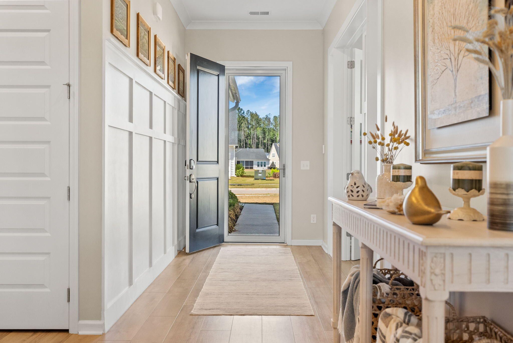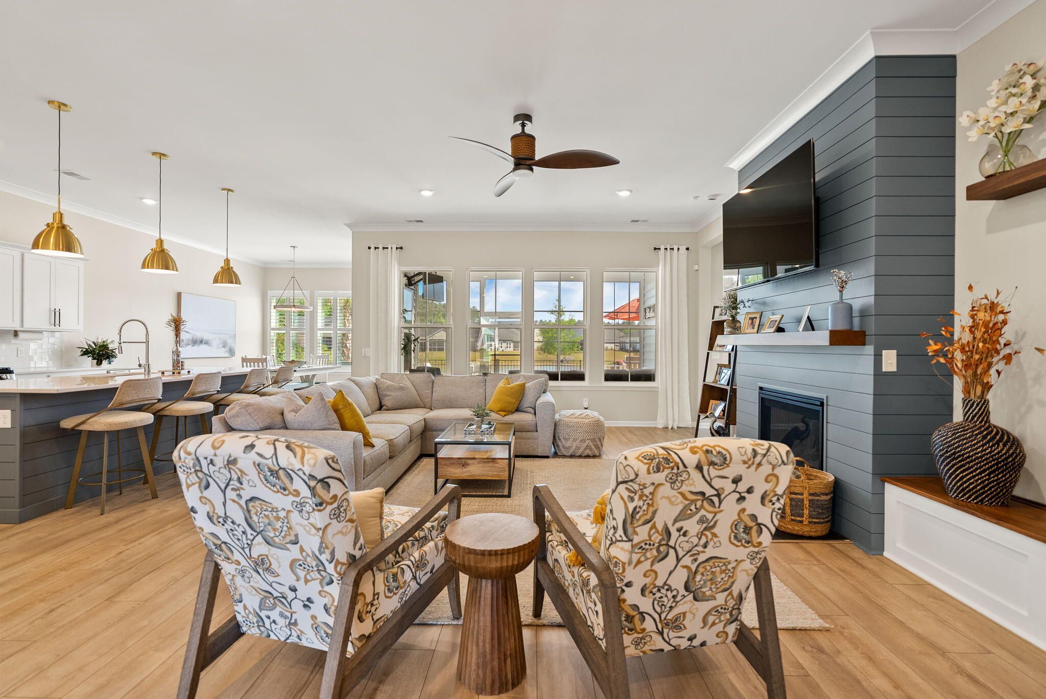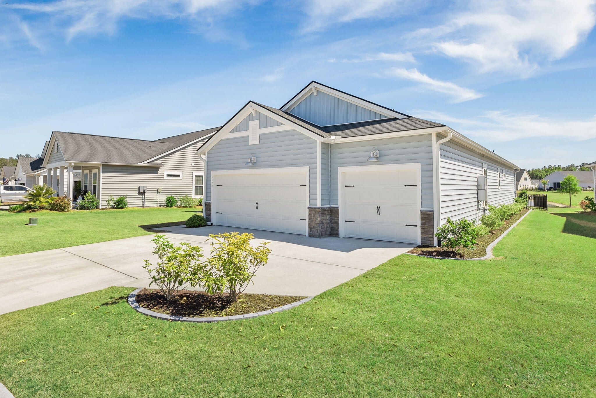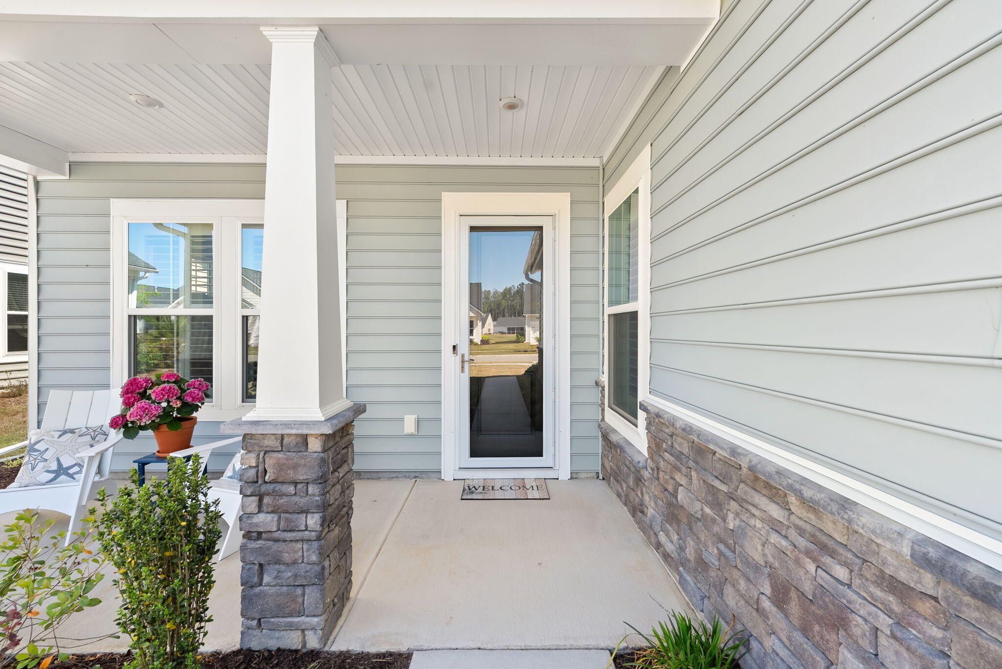 Welcome to 1129 Cane Creek Way, an immaculate and beautifully upgraded 3-bedroom, 2-bathroom home located in the sought-after Horizons active 55+ community within Summers Corner. From the moment you arrive, the spacious 3-car garage, inviting front porch, and beautifully maintained landscaping create a warm and welcoming first impression.Step inside to a bright entryway featuring custom board and batten trim that leads to a dedicated home office complete with custom French doors and a Murphy bed for extra guests. Throughout the home, elegant plantation shutters add timeless charm and sophistication while enhancing the abundance of natural light. Continue down the hall into a light-filled, open-concept living space designed for both everyday comfort and effortless entertaining.The stunning living room is filled with natural light and showcases peaceful views of your backyard oasis. Cozy up beside the beautiful shiplap fireplace with a custom mantel, creating a striking focal point for the space. Just off the fireplace is a custom built-in storage bench, perfect for added decoration, storage, and everyday functionality, adding both charm and practicality to the living space. The kitchen is truly the heart of the home, featuring crisp white cabinetry, white quartz countertops, and a classic subway tile backsplash. Stainless steel appliances, upgraded cabinet hardware, and designer gold light fixtures seamlessly tie the space together, while the large center island with matching shiplap accents makes this kitchen as functional as it is beautiful. Just off the kitchen, the spacious eat-in dining area provides additional space for gathering and everyday living. Step outside and enjoy your private Lowcountry retreat featuring a stunning four seasons room with finished flooring, vinyl windows, and a ceiling fan, creating the perfect year-round extension of your living space. Beyond the four seasons room, enjoy the extended paver patio, lush landscaping, and fenced pond lot with elegant wrought iron fencing, creating a peaceful outdoor oasis ideal for relaxing or entertaining. The primary suite offers a peaceful retreat at the end of the day with tranquil backyard views, a beautifully designed accent wall, tray ceiling, and ceiling fan. The luxurious en suite bathroom features dual vanities, a large tiled frameless glass shower with a bench seat, and direct access to the walk-in closet complete with a custom closet system. Conveniently connected to the closet, the laundry room adds thoughtful functionality to everyday living. Adding to the home's thoughtful functionality is a beautifully designed mudroom complete with extensive storage, a built-in bench, hooks, and cubby spaces perfect for baskets and everyday organization. Two additional bedrooms and a full guest bathroom provide comfortable accommodations for family, guests, or additional flex space. Residents of Horizons will enjoy access to brand-new resort-style amenities opening in Spring 2026, including pools, fitness centers, bocce ball courts, tennis and pickleball courts, fire pits, sidewalks, and open green spaces -- all within a vibrant golf cart-friendly 55+ community designed for active living and social connection.