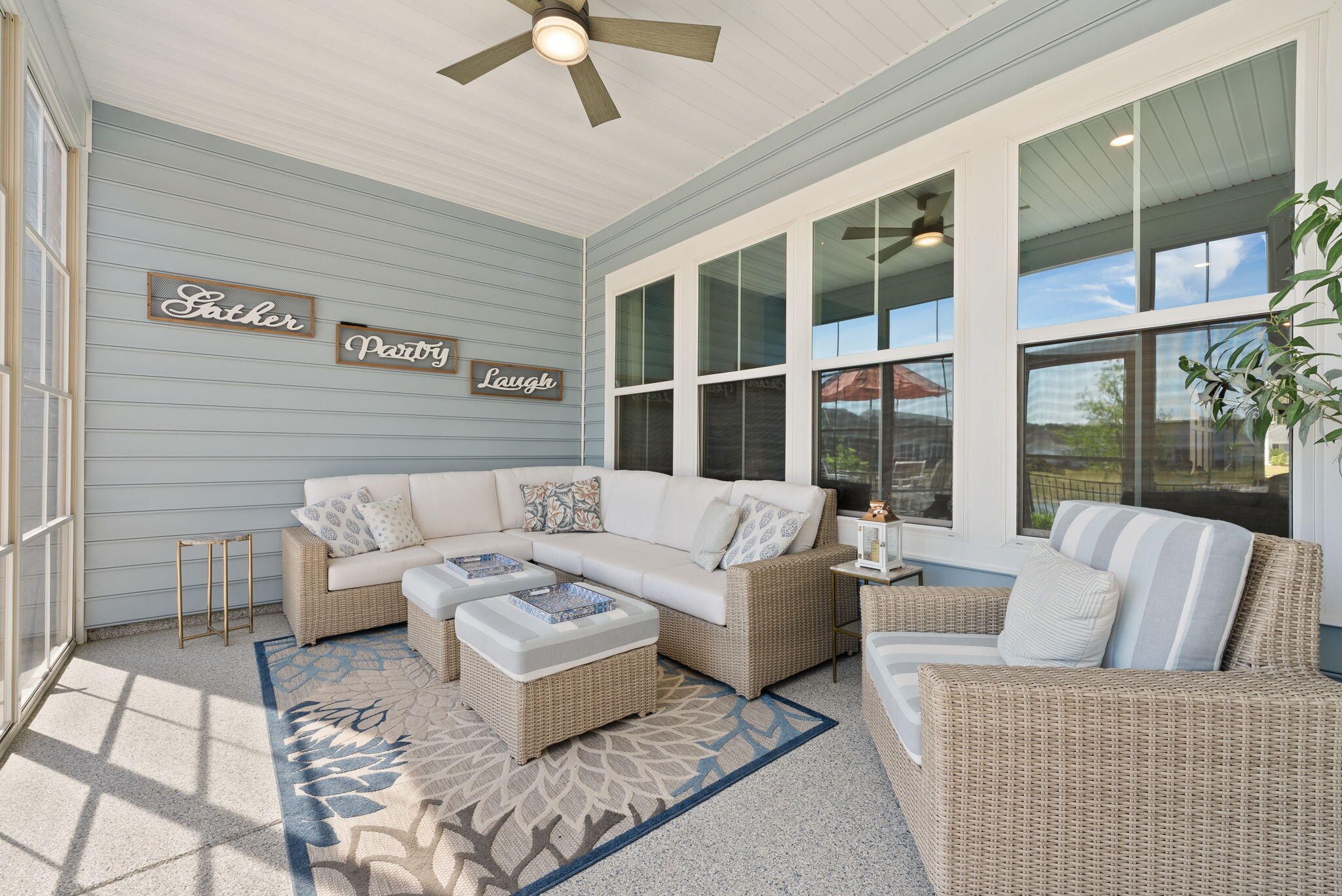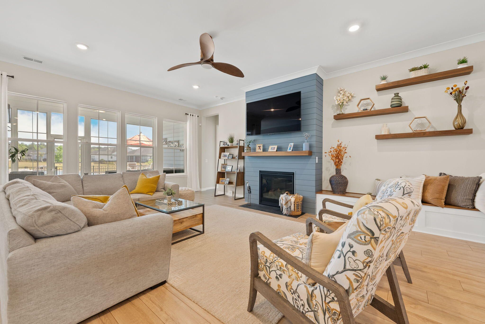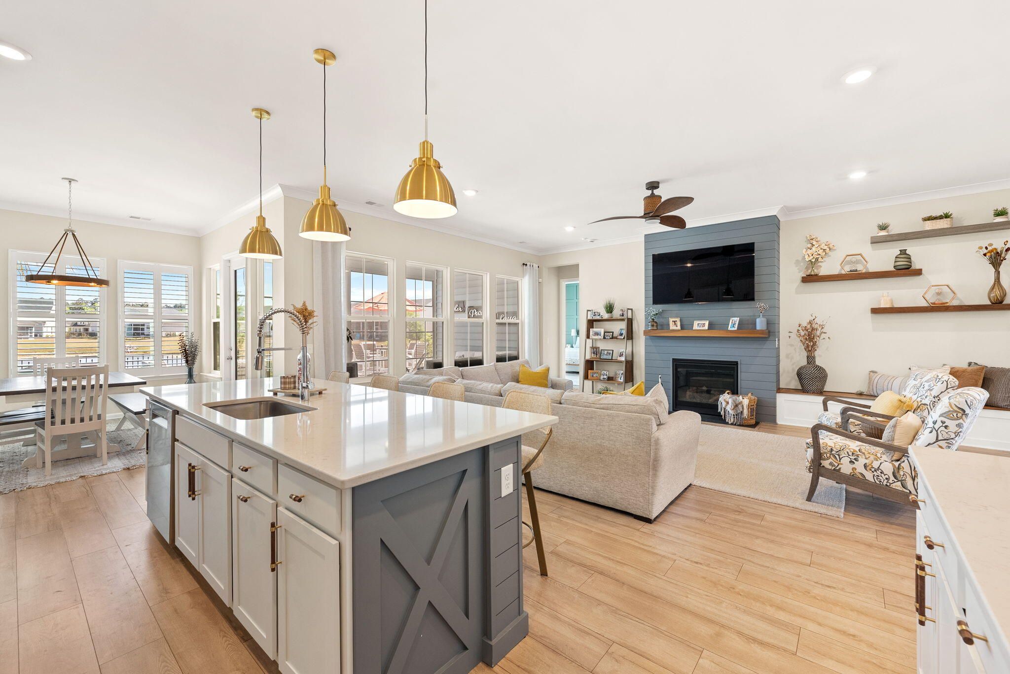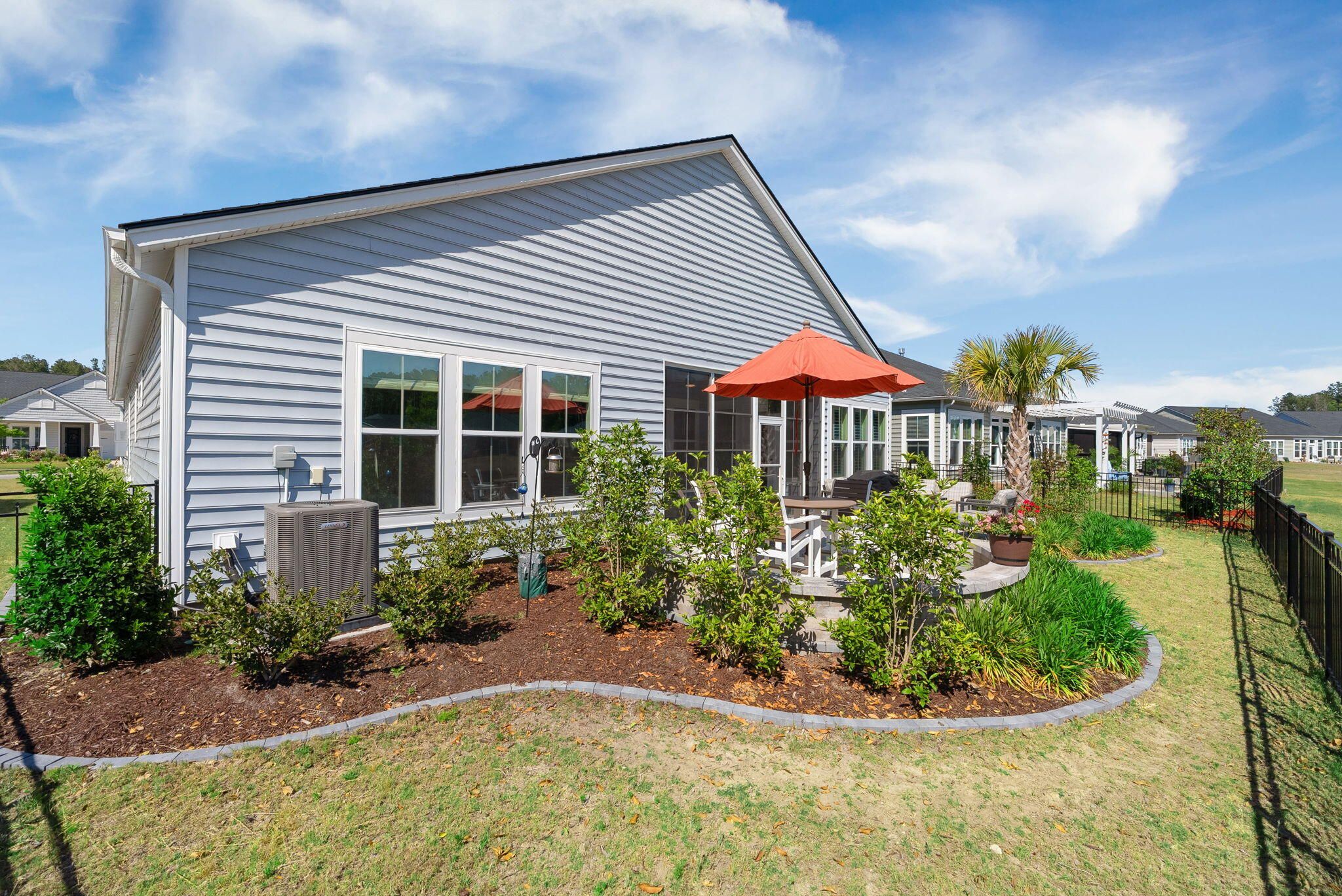Welcome to 1129 Cane Creek Way, an immaculate and beautifully upgraded 3-bedroom, 2-bathroom home located in the sought-after Horizons active 55+ community within Summers Corner. From the moment you arrive, the spacious 3-car garage, inviting front porch, and beautifully maintained landscaping create a warm and welcoming first impression.Step inside to a bright entryway featuring custom board and batten trim that leads to a dedicated home office complete with custom French doors and a Murphy bed for extra guests. Throughout the home, elegant plantation shutters add timeless charm and sophistication while enhancing the abundance of natural light. Continue down the hall into a light-filled, open-concept living space designed for both everyday comfort and effortless entertaining.The stunning living room is filled with natural light and showcases peaceful views of your backyard oasis. Cozy up beside the beautiful shiplap fireplace with a custom mantel, creating a striking focal point for the space. Just off the fireplace is a custom built-in storage bench, perfect for added decoration, storage, and everyday functionality, adding both charm and practicality to the living space. The kitchen is truly the heart of the home, featuring crisp white cabinetry, white quartz countertops, and a classic subway tile backsplash. Stainless steel appliances, upgraded cabinet hardware, and designer gold light fixtures seamlessly tie the space together, while the large center island with matching shiplap accents makes this kitchen as functional as it is beautiful. Just off the kitchen, the spacious eat-in dining area provides additional space for gathering and everyday living. Step outside and enjoy your private Lowcountry retreat featuring a stunning four seasons room with finished flooring, vinyl windows, and a ceiling fan, creating the perfect year-round extension of your living space. Beyond the four seasons room, enjoy the extended paver patio, lush landscaping, and fenced pond lot with elegant wrought iron fencing, creating a peaceful outdoor oasis ideal for relaxing or entertaining. The primary suite offers a peaceful retreat at the end of the day with tranquil backyard views, a beautifully designed accent wall, tray ceiling, and ceiling fan. The luxurious en suite bathroom features dual vanities, a large tiled frameless glass shower with a bench seat, and direct access to the walk-in closet complete with a custom closet system. Conveniently connected to the closet, the laundry room adds thoughtful functionality to everyday living. Adding to the home's thoughtful functionality is a beautifully designed mudroom complete with extensive storage, a built-in bench, hooks, and cubby spaces perfect for baskets and everyday organization. Two additional bedrooms and a full guest bathroom provide comfortable accommodations for family, guests, or additional flex space. Residents of Horizons will enjoy access to brand-new resort-style amenities opening in Spring 2026, including pools, fitness centers, bocce ball courts, tennis and pickleball courts, fire pits, sidewalks, and open green spaces -- all within a vibrant golf cart-friendly 55+ community designed for active living and social connection.