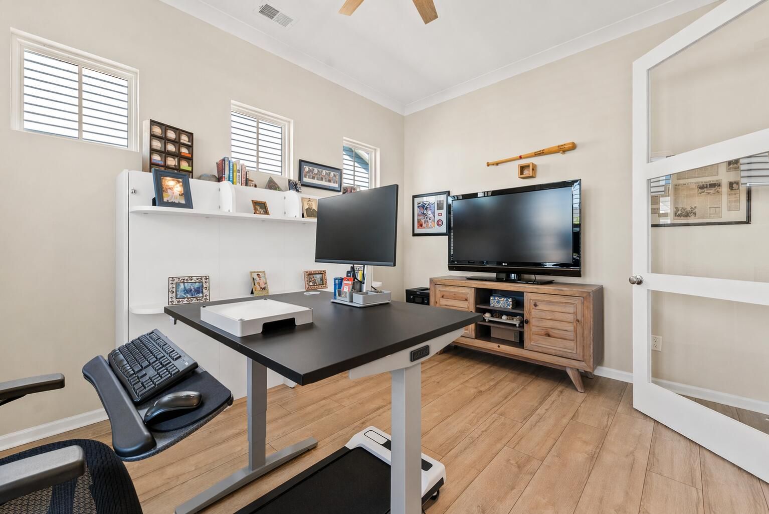 - Smooth Ceilings, Tray Ceiling(s), High Ceilings, Kitchen Island, Walk-In Closet(s), Ceiling Fan(s), Eat-in Kitchen, Family Room, Entrance Foyer, Home Office, Pantry, Study, Sunroom