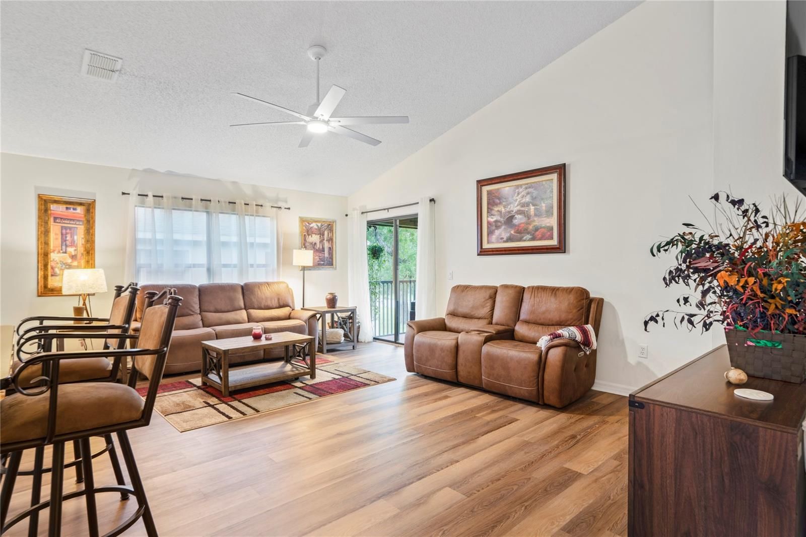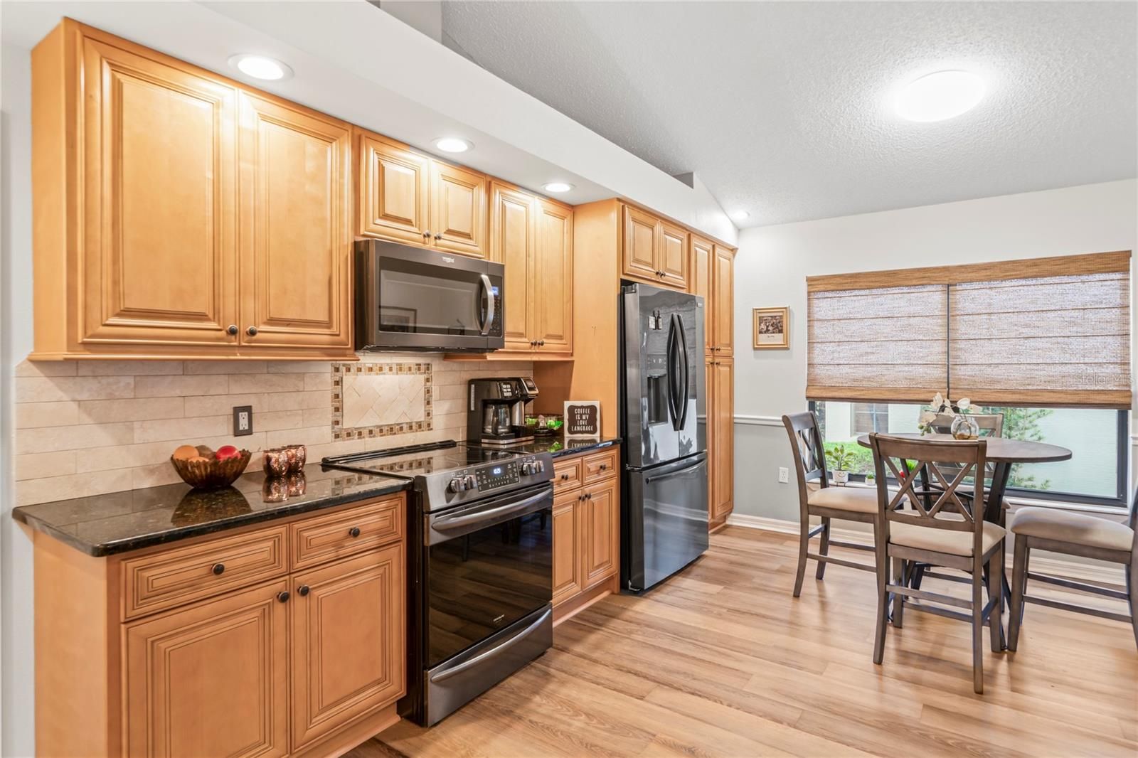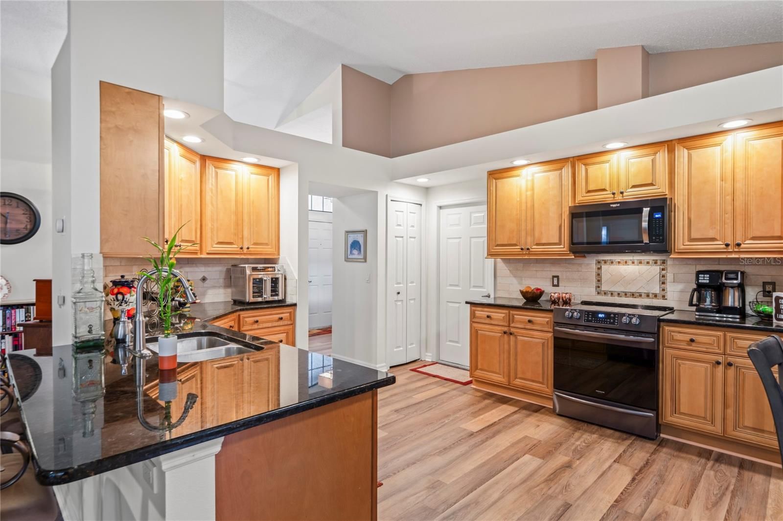 Welcome home to this spacious home located in the desirable 55+ community of Wellington at Seven Hills in Spring Hill. Beautifully maintained, this home features the Heron model floor plan by Ryland Homes that includes vaulted ceilings throughout the home, a spacious, open concept living area, kitchen with breakfast nook, as well as a large dining room. The large kitchen has beautiful wood cabinets incl. pull-outs and soft close drawers, granite countertops, breakfast bar, and a cabinet pantry as well as closet pantry. Plus, all appliances were just replaced in 2024 with stylish slate-colored appliances! Chair rails enhance the aesthetic of the adjacent breakfast area. Kitchen opens to living area - a great layout for daily living and entertaining! Main bedroom suite includes a walk-in closet, double vanity with granite counter, relaxing garden tub and separate walk-in shower with large shower seat. Two additional bedrooms are located on the opposite side of the home, both with good-size closets. One of these bedrooms has double pocket doors offering additional functionality as den, study, or hobby room. For easy maintenance, flooring in all living areas is luxury vinyl plank or laminate wood - no carpets - bathrooms are tiled. Laundry room has a laundry sink and lots of hanging cabinets for extra storage. Glass sliders lead to the screened and covered lanai offering a comfortable outdoor spot to enjoy morning coffee or just relax. Recent upgrades include resurfaced driveway (2023), waterheater (2024), luxury vinyl plank flooring in all living areas (2023), screen doors at front entry, newer paint in living area, window tint in living room, breakfast nook, and foyer transom window. Roof was replaced in 2015 and HVAC in 2019. Buyer may be able to assume current VA Loan with low interest rate. The Wellington at Seven Hills is a gated 55+ community, centrally located with easy access to shopping, dining, medical services and hospitals, and major roadways including Suncoast Parkway for easy commute to Tampa and international airport. Community amenities include a beautiful club house with restaurant, Olympic-size pool, fitness room, meeting and computer rooms, tennis and pickle ball, and more. Nearby, enjoy the local attractions including Weeki Wachee State Park with its world famous Mermaids, Pine Island beach area, fishing piers, numerous boat ramps and kayak launch areas or take a short drive to Homosassa Springs State Park or visit Brooksville for many other activities and festivals throughout the year.