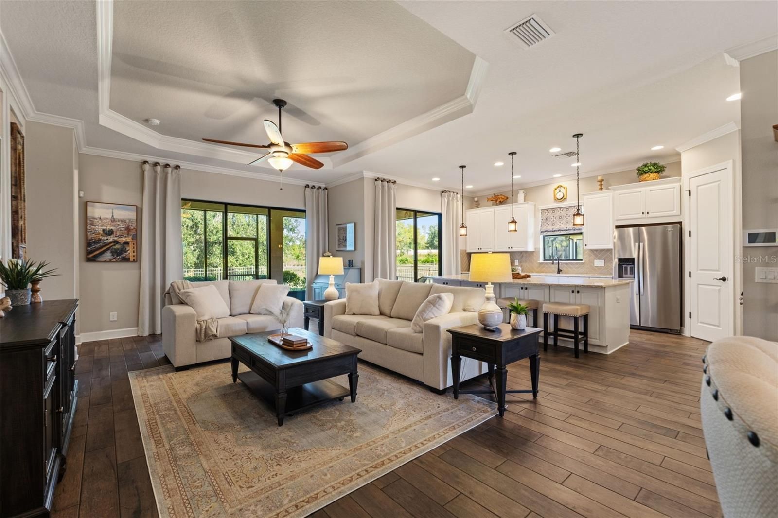 Welcome to the highly sought-after, gated, and maintenance inclusive community of ESPLANADE AT STARKEY RANCH! Some homes are pretty and some homes are structurally upgraded...this exquisite home is both and PRICED TO SELL! Offering 3 BEDROOMS + OFFICE, 3 FULL BATHS, and over 2,300 SQ FT, this home sits on a PREMIUM QUARTER-ACRE CONSERVATION LOT (NO REAR NEIGHBORS) that provides privacy and gorgeous natural views. The exterior impresses with a TILE ROOF, STACKED STONE ACCENTS, and PRIVATE GATED COURTYARD ENTRY. Step inside through the UPGRADED GLASS FRONT DOOR to a light-filled foyer with TRAY CEILINGS. Just off the entry is the THIRD BEDROOM and FULL GUEST BATH, while the SECOND BEDROOM features an ENSUITE BATH with FRAMELESS GLASS SHOWER—perfect for guests. The OVERSIZED LAUNDRY ROOM includes a SINK, COUNTERS, and BUILT-IN STORAGE with access to the EXTRA-DEEP 2-CAR GARAGE. A DEDICATED HOME OFFICE sits at the heart of the home, followed by an OPEN-CONCEPT GREAT ROOM combining the FAMILY ROOM, DINING AREA, and GOURMET KITCHEN. HIGH CEILINGS, CROWN MOLDING, 8-FOOT DOORS, and CUSTOM MILLWORK add elegance throughout. The CHEF’S KITCHEN features 42” WHITE CABINETS, PREMIUM QUARTZ COUNTERS, HERRINGBONE GLASS BACKSPLASH, PENDANT LIGHTING, and STAINLESS APPLIANCES including a GAS RANGE. The PRIVATE PRIMARY SUITE is tucked at the rear with a BAY WINDOW EXTENSION, TRAY CEILINGS, and PEACEFUL CONSERVATION VIEWS. The LUXURY PRIMARY BATH includes DUAL QUARTZ VANITIES, LARGE WALK-IN SHOWER, and SPACIOUS CLOSET. Enjoy the FLORIDA LIFESTYLE outdoors on the EXTENDED SCREENED LANAI and FULLY FENCED BACKYARD with NO REAR NEIGHBORS. Additional features include a TANKLESS WATER HEATER, WHOLE-HOME GENERATOR, CAT5 CABLING THROUGHOUT THE HOME and WATER SOFTENER. Located just TWO BLOCKS from the 6,000 SQ FT ESPLANADE CLUBHOUSE with LIFESTYLE DIRECTOR, CONCIERGE SERVICES, RESORT-STYLE POOL & SPA, FITNESS CENTER, MASSAGE ROOM, TENNIS & PICKLEBALL COURTS, FIRE PIT, DOG PARK, and PLAYGROUND. RESORT LIVING AT ITS FINEST—WITHOUT THE WAIT!