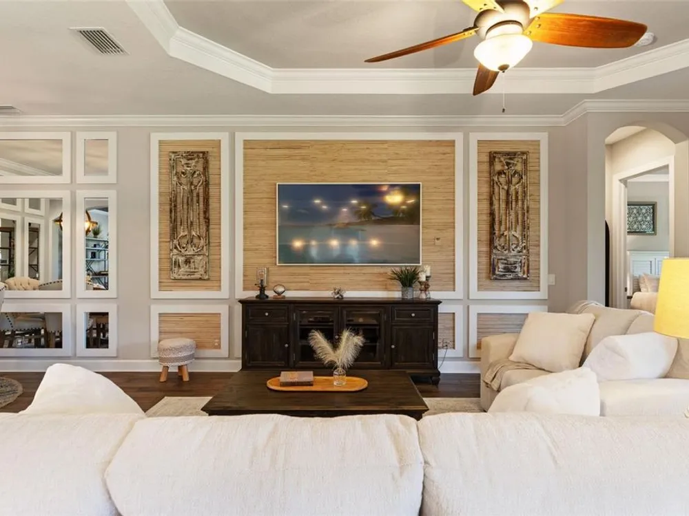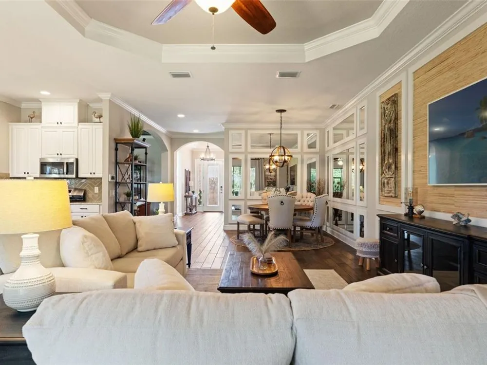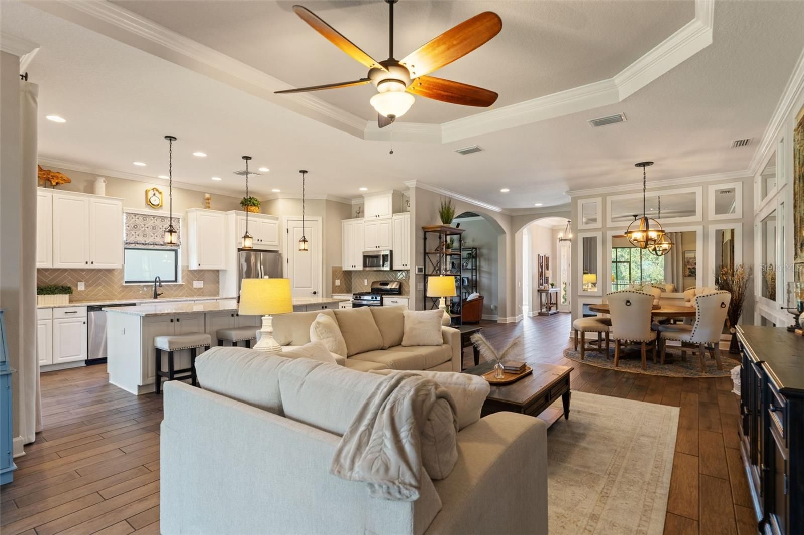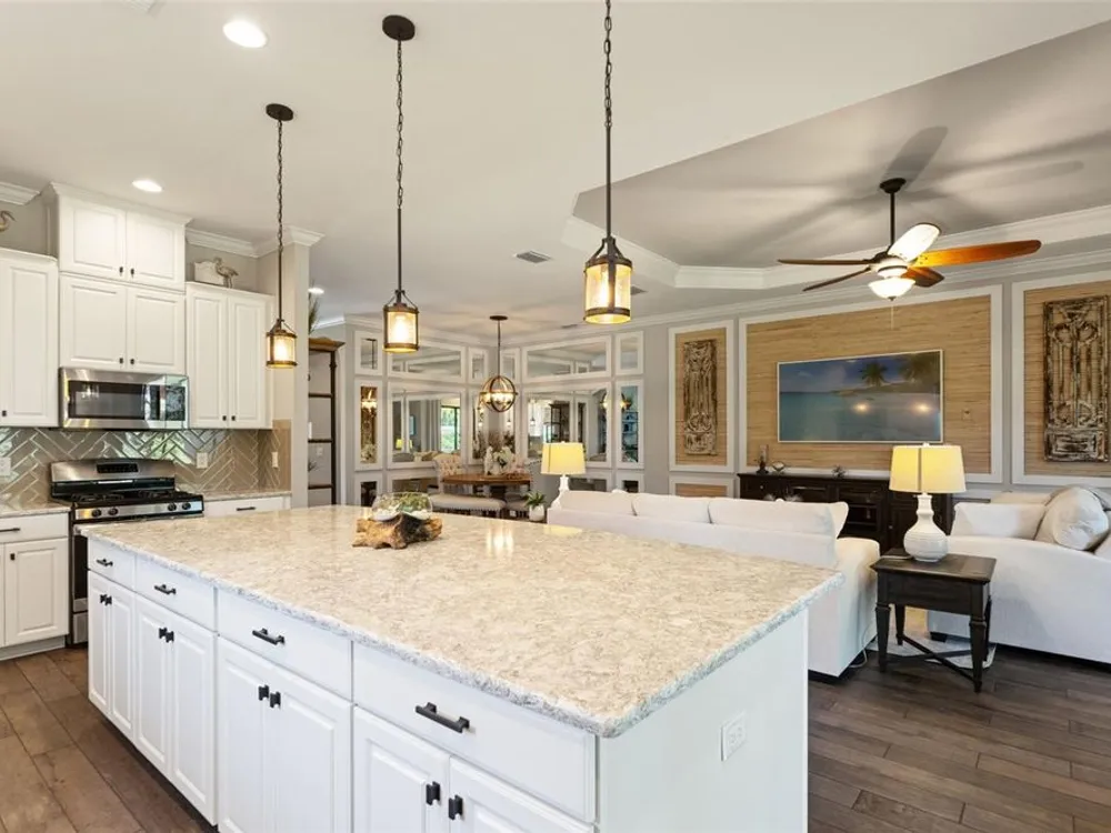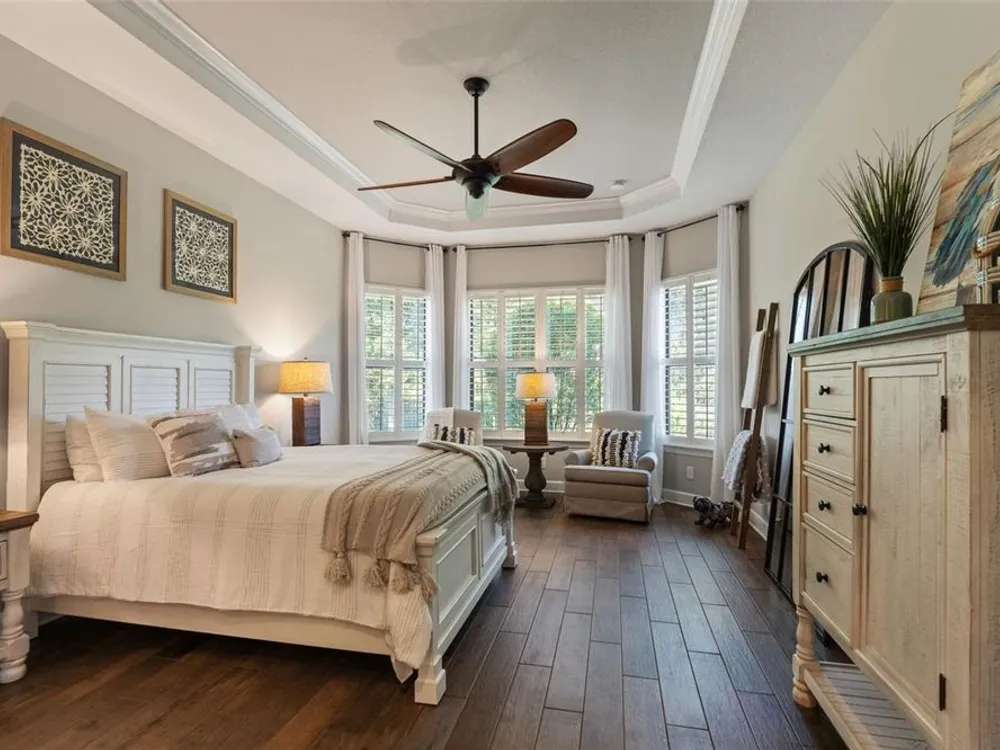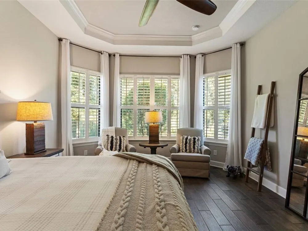 - Ceiling Fan(s), Crown Molding, Eat-in Kitchen, High Ceilings, Kitchen/Family Room Combo, Living/Dining Room, Open Floorplan, In-Wall Pest Control, Main Level Primary, Solid Surface Counters, Solid-Wood Cabinets, Split Bedrooms, Stone Counters, Thermostat, Tray Ceiling(s), Walk-In Closet(s), Window Treatments