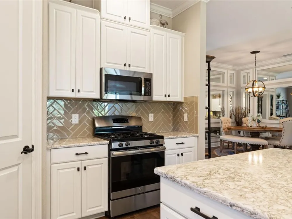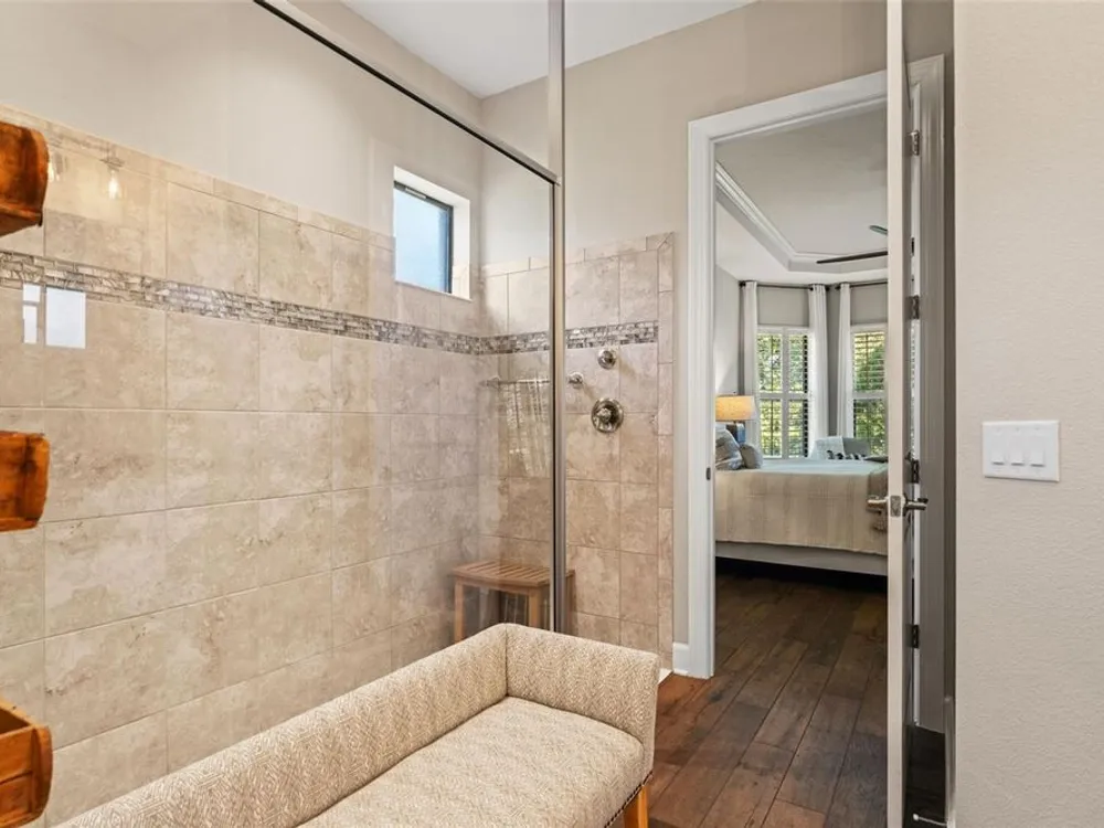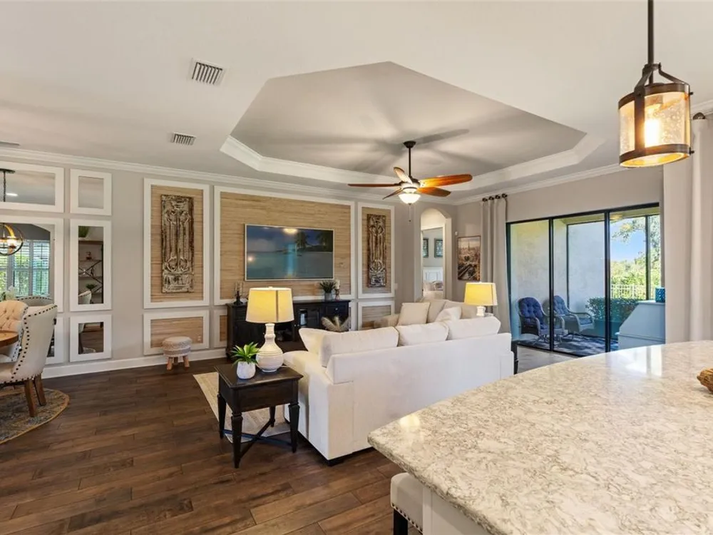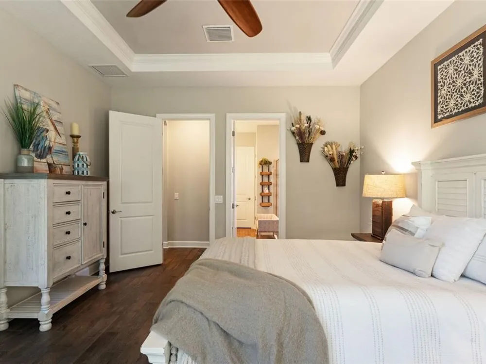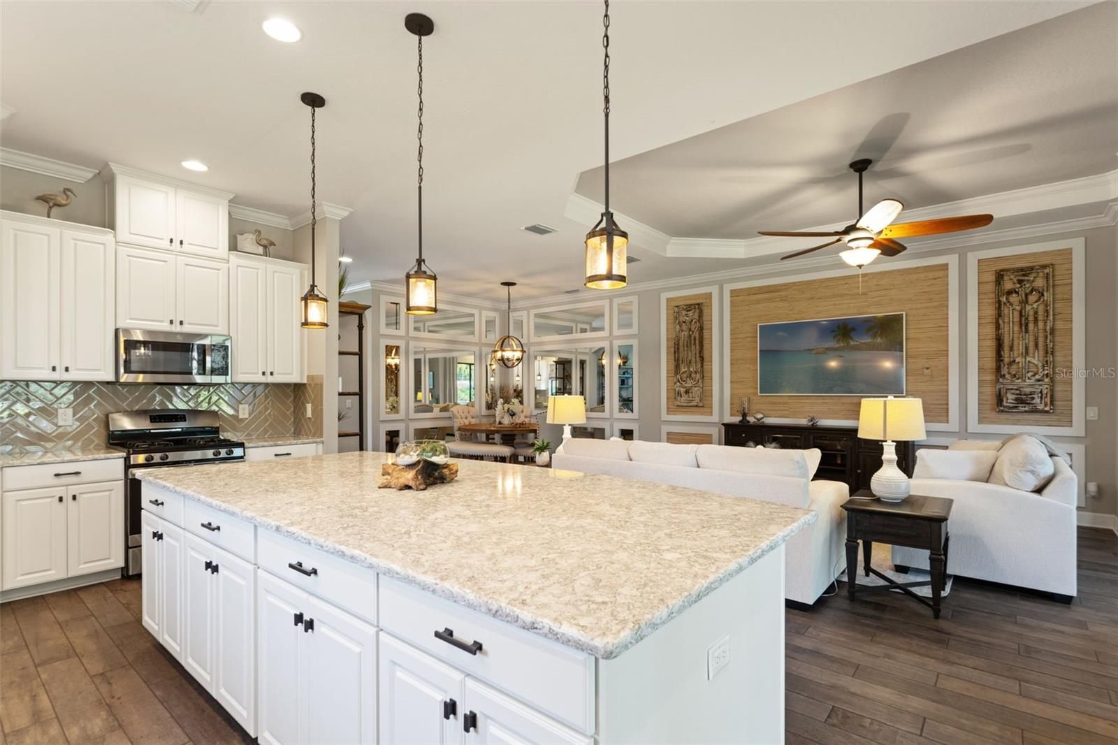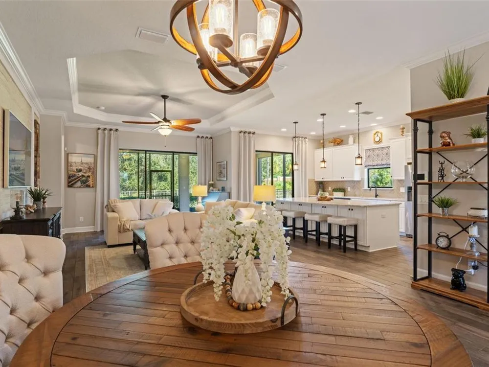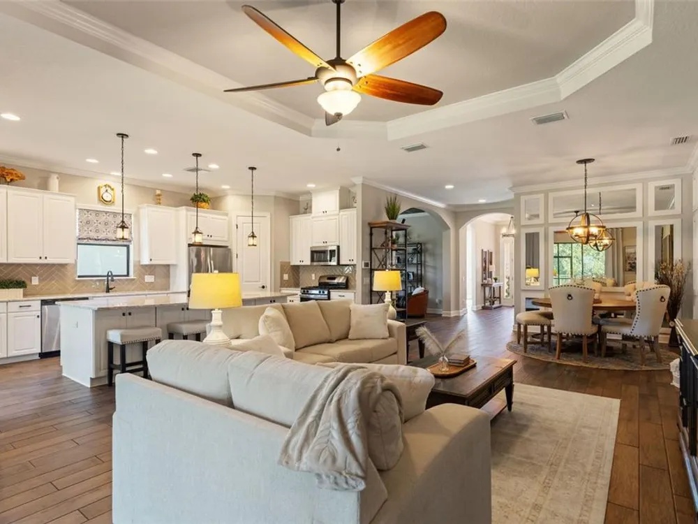 - Ceiling Fan(s), Crown Molding, Eat-in Kitchen, High Ceilings, Kitchen/Family Room Combo, Living/Dining Room, Open Floorplan, In-Wall Pest Control, Main Level Primary, Solid Surface Counters, Solid-Wood Cabinets, Split Bedrooms, Stone Counters, Thermostat, Tray Ceiling(s), Walk-In Closet(s), Window Treatments