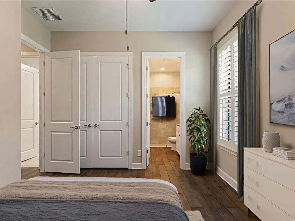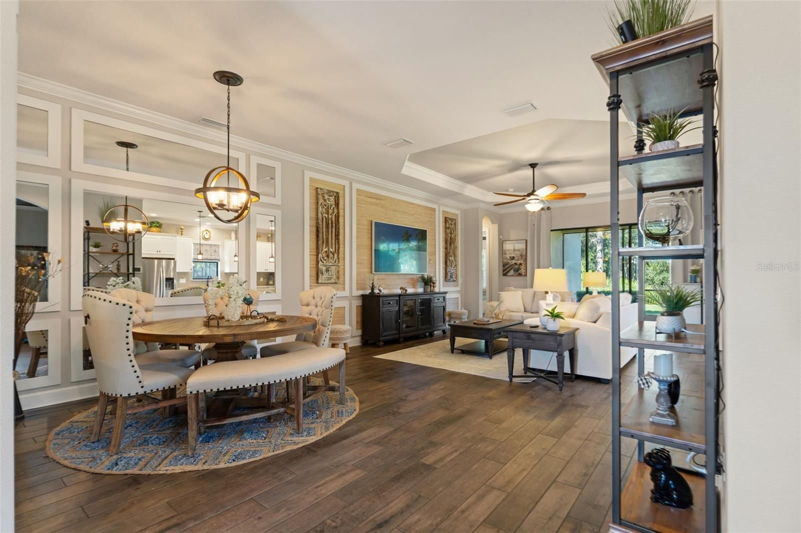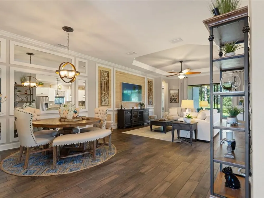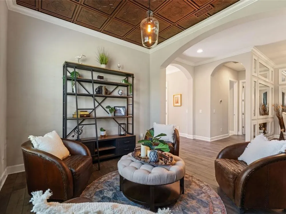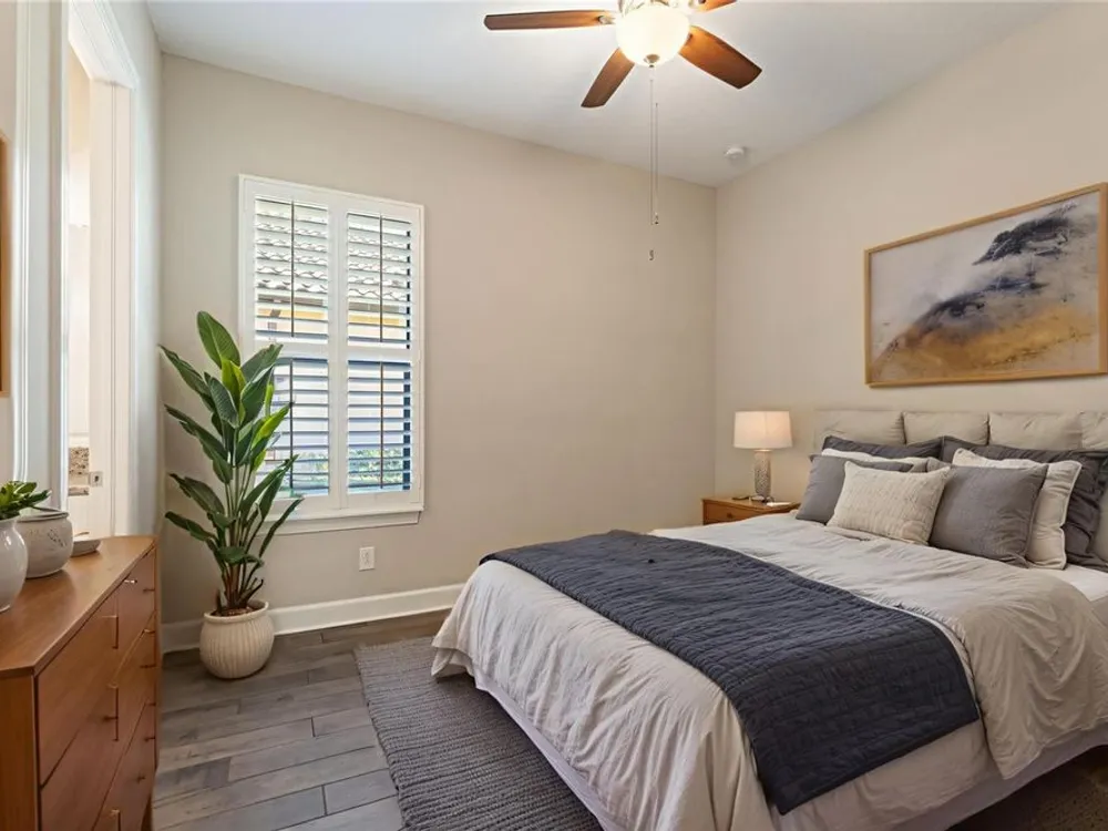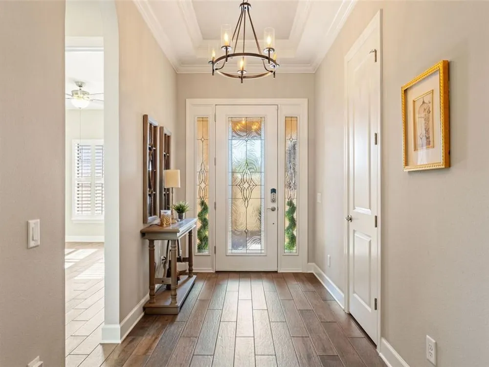 - Ceiling Fan(s), Crown Molding, Eat-in Kitchen, High Ceilings, Kitchen/Family Room Combo, Living/Dining Room, Open Floorplan, In-Wall Pest Control, Main Level Primary, Solid Surface Counters, Solid-Wood Cabinets, Split Bedrooms, Stone Counters, Thermostat, Tray Ceiling(s), Walk-In Closet(s), Window Treatments