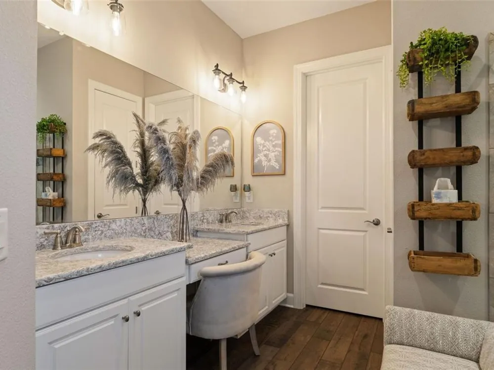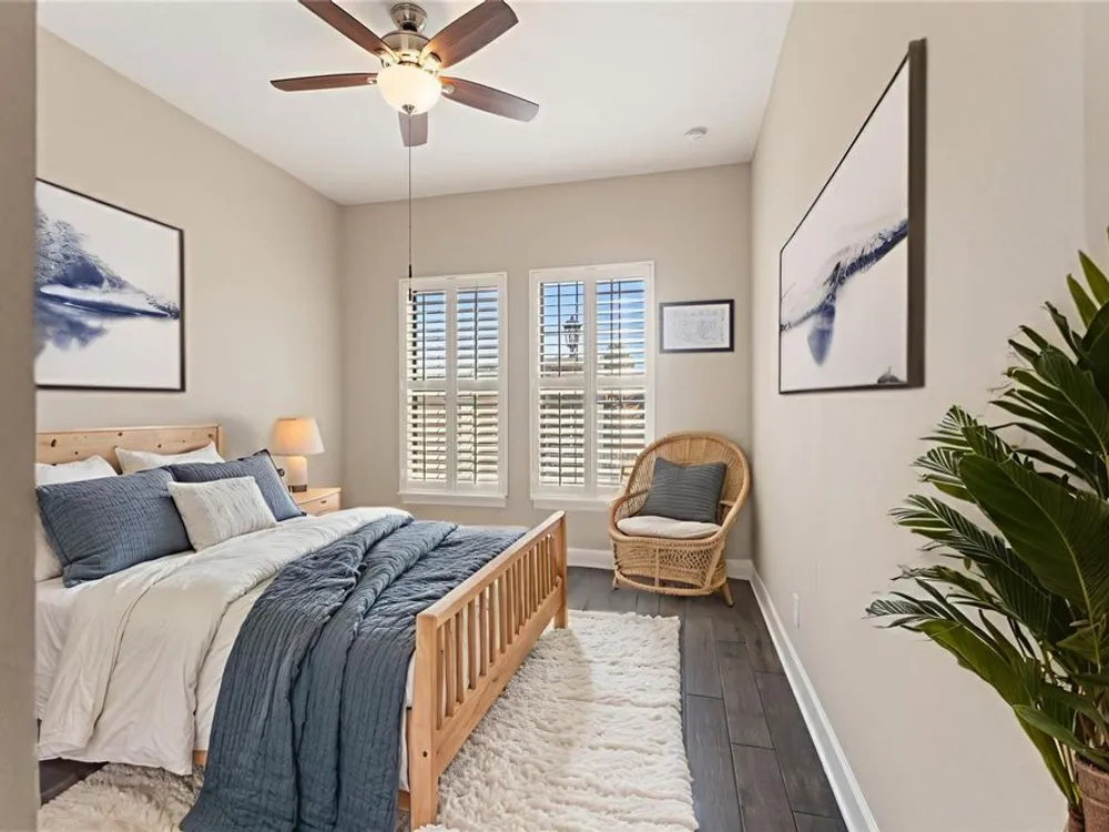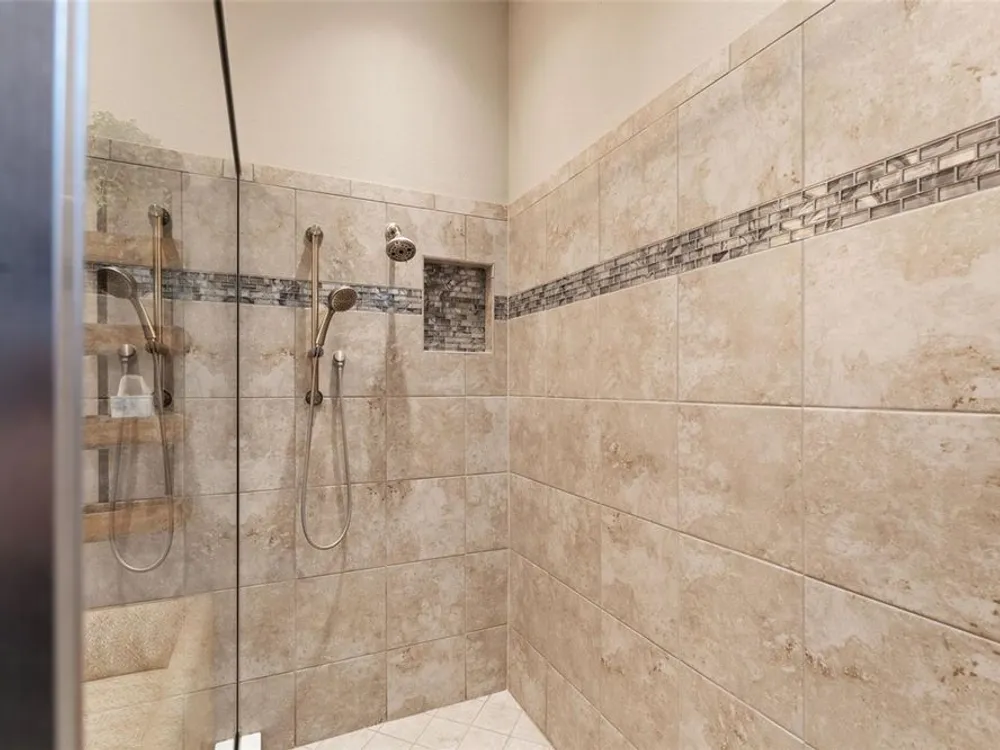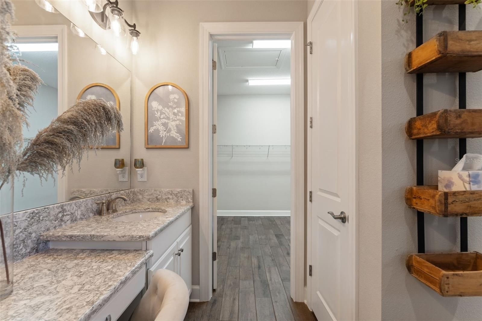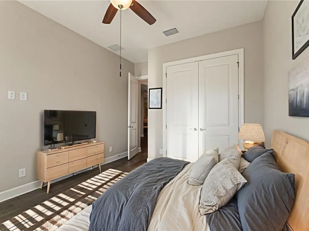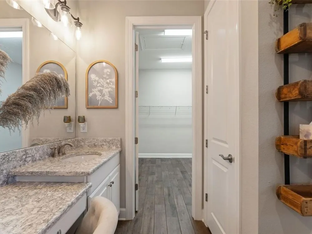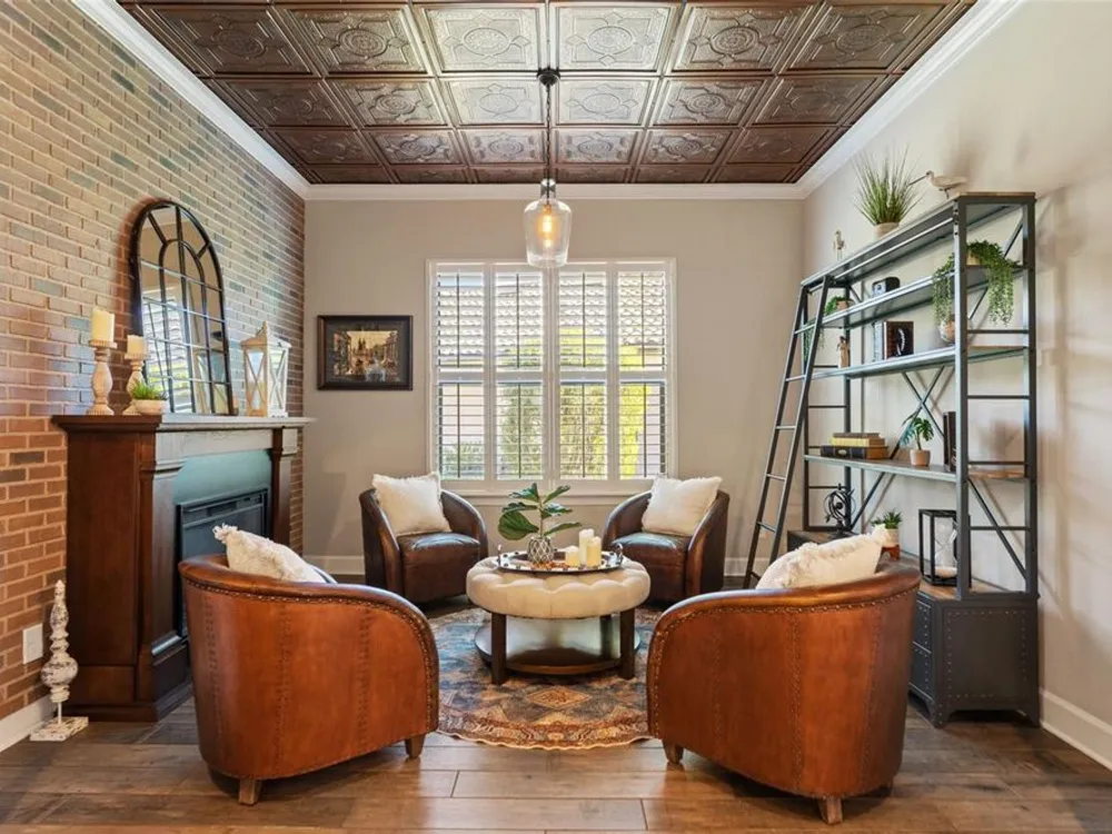 - Ceiling Fan(s), Crown Molding, Eat-in Kitchen, High Ceilings, Kitchen/Family Room Combo, Living/Dining Room, Open Floorplan, In-Wall Pest Control, Main Level Primary, Solid Surface Counters, Solid-Wood Cabinets, Split Bedrooms, Stone Counters, Thermostat, Tray Ceiling(s), Walk-In Closet(s), Window Treatments