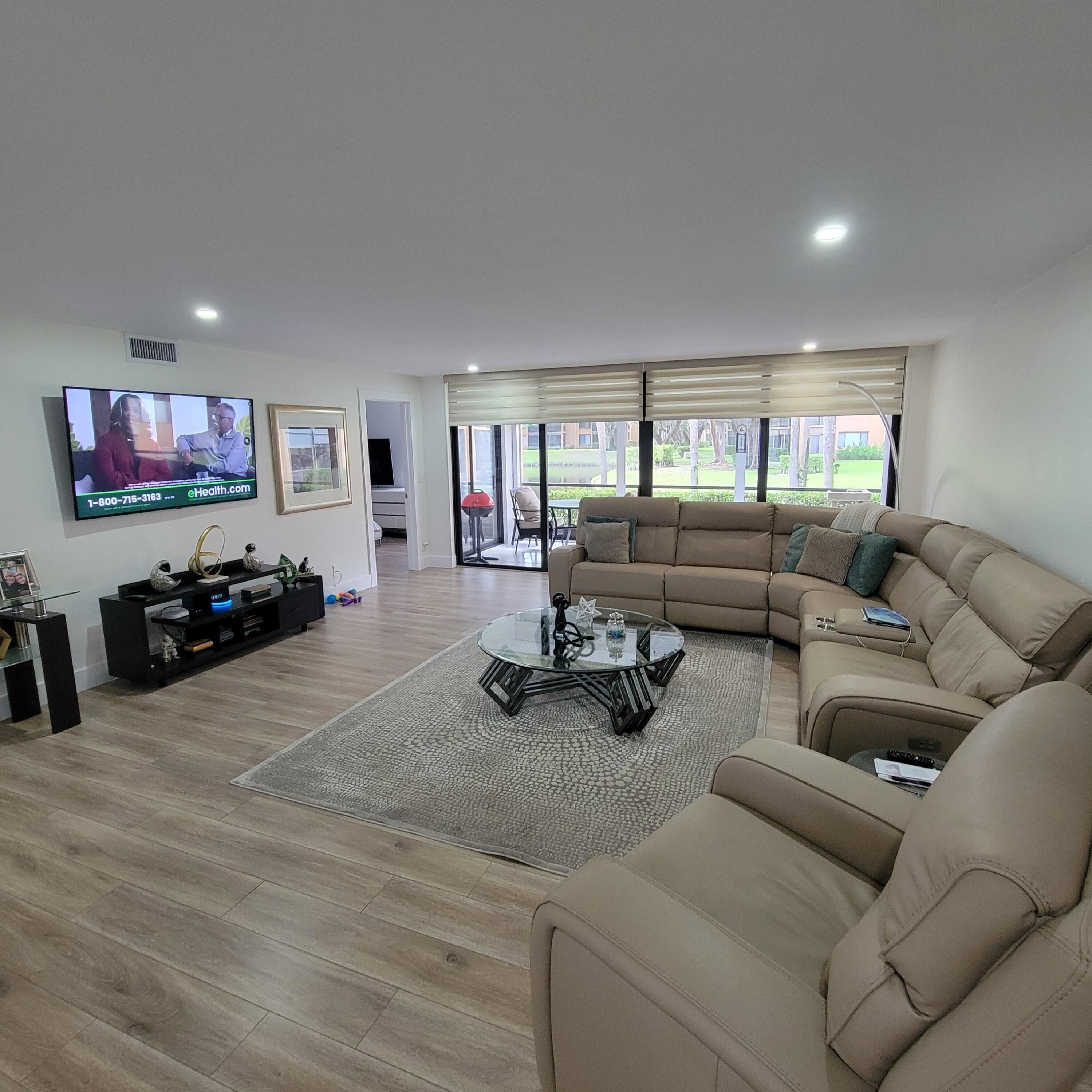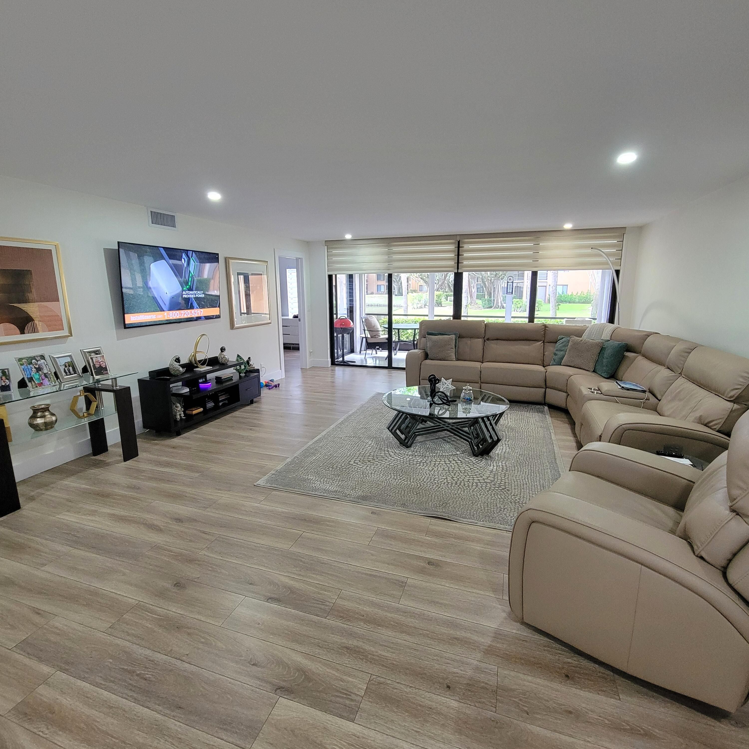 tunning ground floor condo with a lake view at Green Lakes Condominiums, an exclusive 55+ gated community. Welcome to a meticulously redesigned living space adorned with modern accents and high-end finishes. The kitchen dazzles with new cabinets and appliances, complemented by sleek flooring throughout the residence. Sliding barn door adds privacy to the guest room, bath and laundry Opulent glass enclosures the showers, adding a touch of sophistication to the bathrooms. Enjoy a vibrant social scene with the option to join club memberships, offering access to a variety of amenities and activities tailored to elevate your leisurely pursuits. Whether unwinding by the pool, pickleball, tennis, golf or partaking in community events, there's something for everyone to enjoy Conveniently located in Boynton Beach, this prime location offers easy access to an array of dining, shopping, and entertainment destinations, ensuring a lifestyle of convenience and fulfillment. Come experience the joy of Florida living in this remarkable condo at Green Lakes Condominiums - where every day feels like a retreat