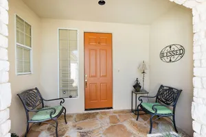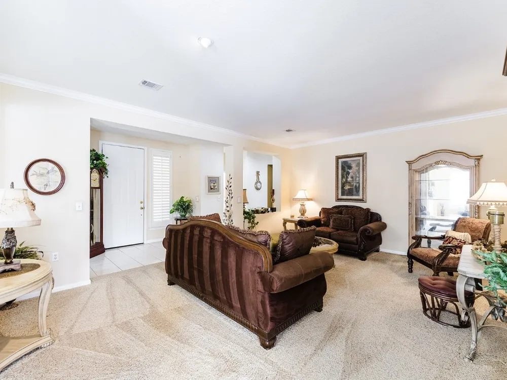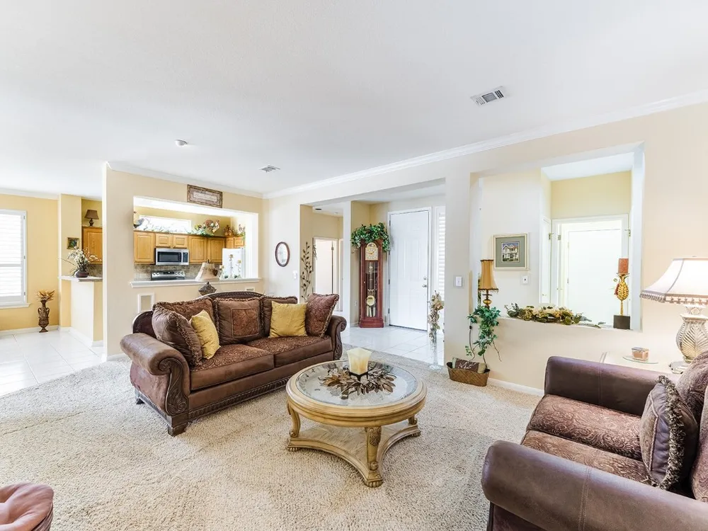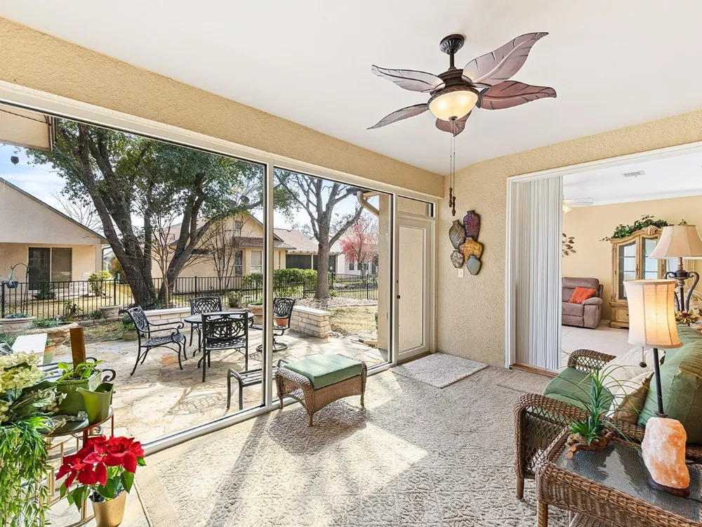 This exceptional home in prestigious Sun City is a 2 bedroom, 2 bath split plan. The San Jacinto Plan is 1726 SF of exceptionally-designed living space with many architectural accents. Tiled Flooring, Crown Molding, Plantation Shutters, Pony Wall between the Main Living Area and the Chef’s Kitchen with Quartz Countertops. Recent Stainless GE Microwave, Dishwasher and Smooth Cooktop, Self-Cleaning Range 1.27.2025. Several additions to the home that have been made since the Seller's initial purchase: Fresh Paint; Crown Molding; Pull-out Drawers in the Kitchen; Flagstone Sidewalk & Flower Beds to the Front Porch; a rear Flagstone Patio with Limestone Benches for extra seating; the Screened-in Porch became an became an All Seasons Sunroom with a Canvas, Electric-operated for ease and Privacy in the Sun Room. The Primary Bedroom received a Tiled-and-Glass Walk-in Shower for ease in access. Seller added elegant Silhouette-like Shades that can offer privacy. Main Living Room is quite spacious as well as a 2nd more Casual Living TV Room off the Main Dining Room. But the Glassed-in Sun Room is usable 12 months of the year and is dressed with Martha Stewarts Rattan Suite for that tropical feel. NOTE: The mattresses and bed frame in the Primary Bedroom will be removed by the Seller prior to Closing.