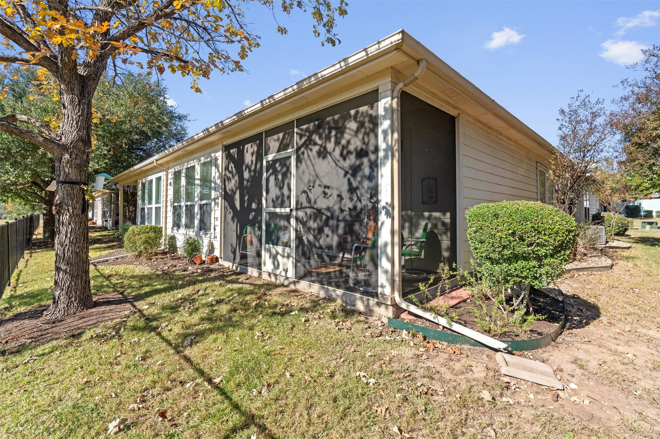 Joyful upgrades add light and airy appeal at this Sun City Texas Monterey Cottage hugging a rolling greenbelt in the heart of this active-adult resort. Year-around lawn care is included in the stated annual dues at this well-kept neighborhood, where one can Lock & Leave the yard work for others! After greetings from a private Front Porch, a glassed entry door welcomes you inside. Off the Foyer, a Dining Area boasts a fun boxed-window adding its cozy cushion for additional seating. Open to the space, the Kitchen toasts quartz counters lowered to the Great Room and a collection of upgraded appliances. A handy Pantry Closet makes things easy to organize, while the nearby Laundry offers a Second Pantry Closet. A high transom window adds natural lighting to the Laundry, which is the access point to the light-filled Two-Car Garage. Meanwhile, the sizable Great Room features yet another eating area, which can be as "formal" or casual as you desire. Custom built-ins treat with usable beauty at the Great Room, where a trio of full-view glass doors reveal the breezy Screened Porch and lovely greenbelt vista. Those same delightful views repeat at the Primary Bedroom privately located at the rear of the home. The en suite Primary Bath hosts dual vanities, a seated shower and a generous Walk-in Closet. At the front of the home, the nicely-separated Guest Bedroom views the Front Porch and landscaped yard, while steps away, the full Guest Bath touts pretty wainscoting and a Linen Closet. Near the first-class amenities of the Village Center, this well-placed home is ready for your immediate enjoyment.