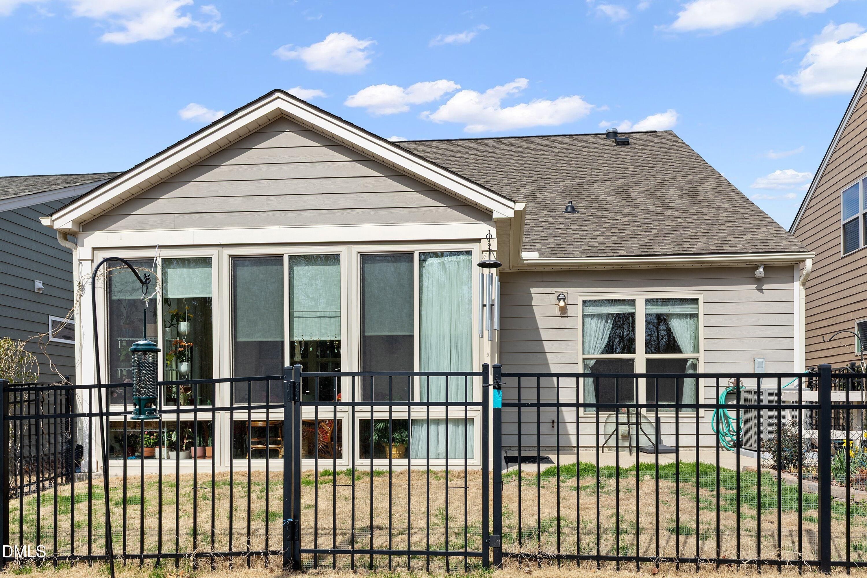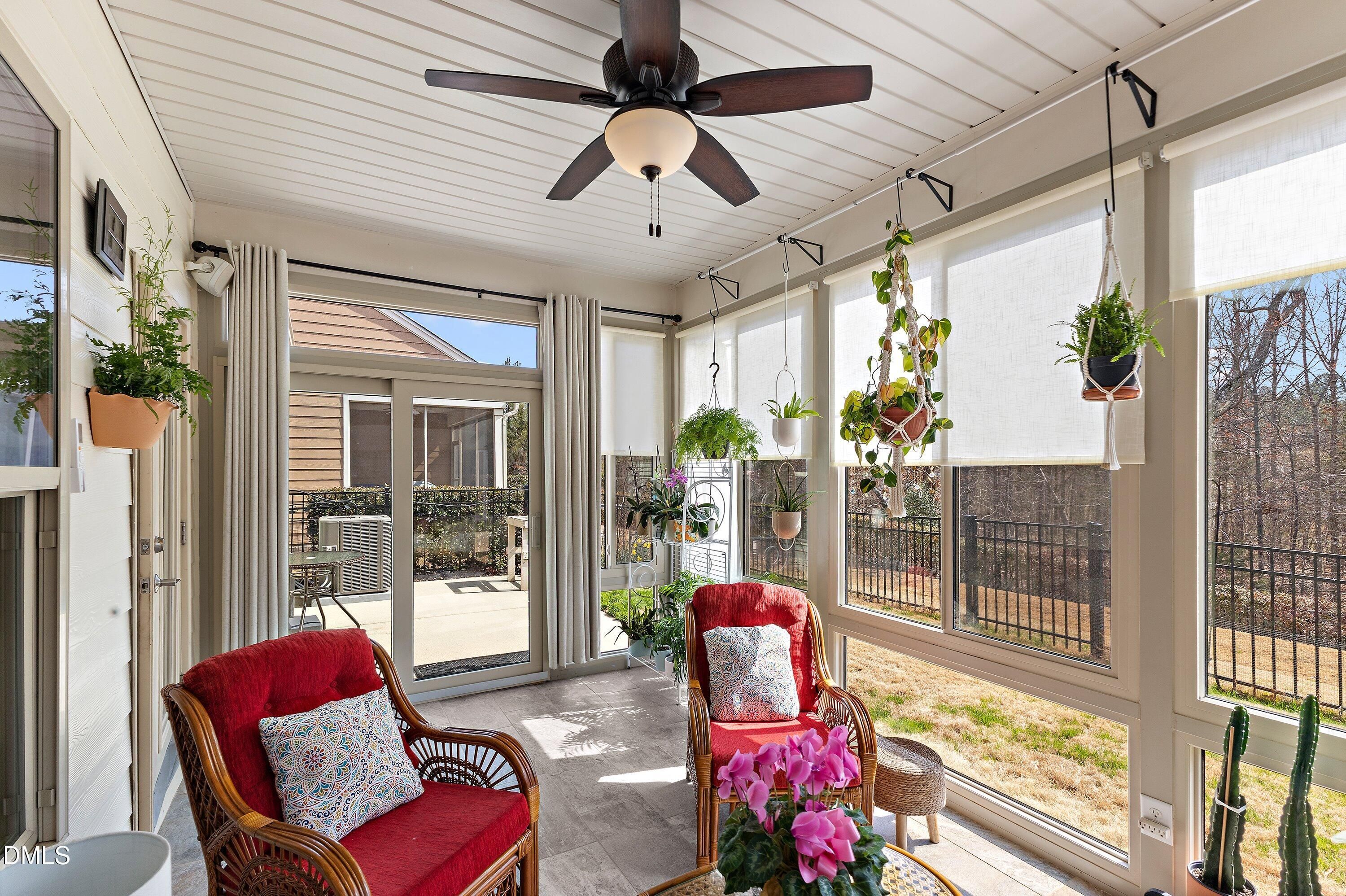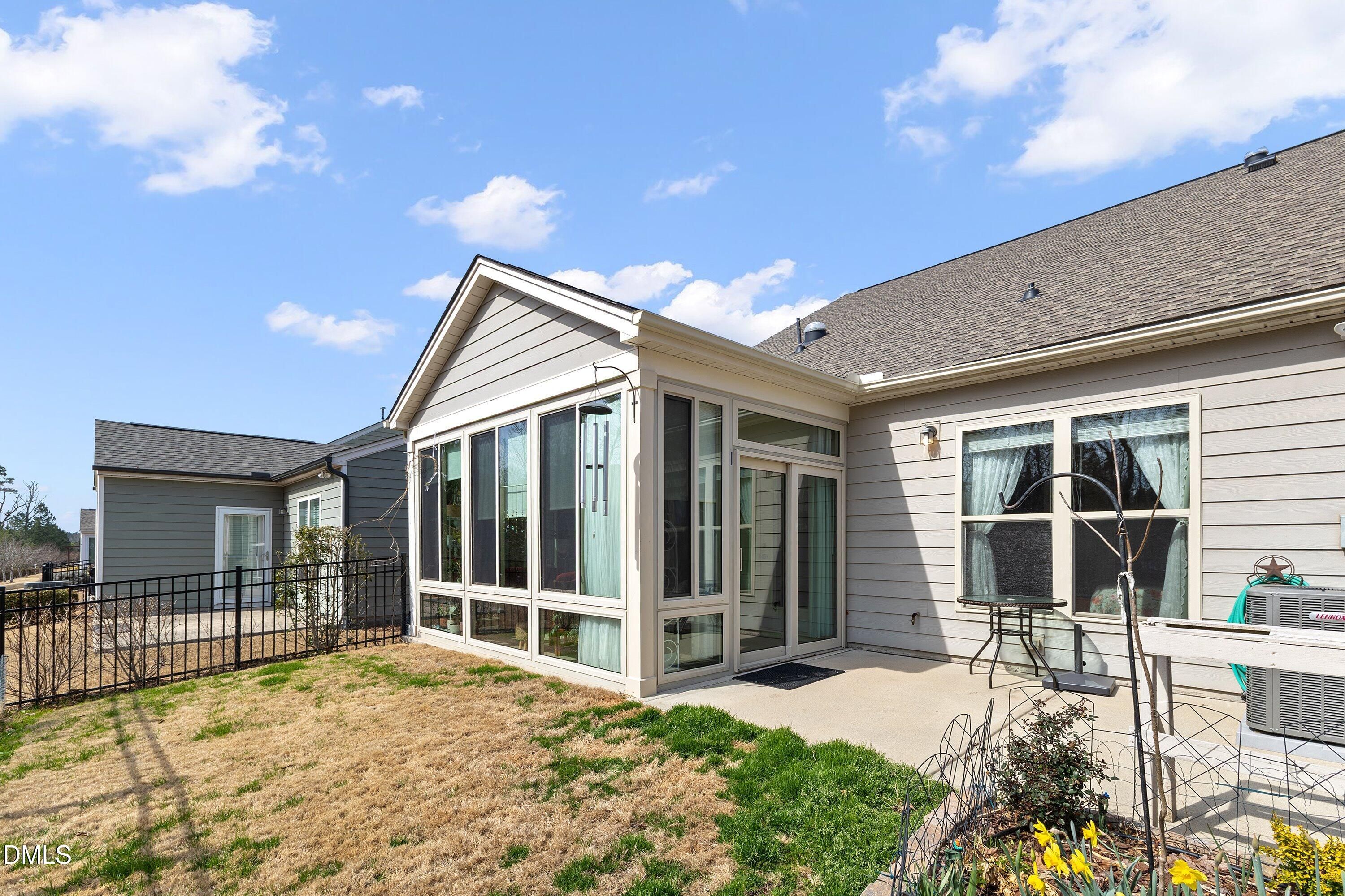 Hillcrest plan in Carolina Arbors on a private premium lot backing to woods, offers bright open living and a number of thoughtful updates and patio/sunroom. The main level features lighter wood flooring, an open kitchen with a large island, granite countertops, painted white cabinetry, upgraded appliances, and a glass-front display cabinet. Toward the front of the home, a dedicated office with French doors provides an ideal workspace, library, or quiet retreat. The main-level primary suite includes a large walk-in closet and granite vanity. At the rear, the original screened porch has been converted into a true four-season room by Southern Exposure with tile flooring and a dedicated mini-split system, creating comfortable year-round living space overlooking the fenced backyard and wooded setting. The grounds are a gardener's haven with many mature plantings bringing year-round delight. Additional upgrades include three sola tubes for maximum natural light, new roof 2022, new HVAC in 2021, whole-house surge protector, and a gas line on the extended patio for grilling. Upstairs offers a bedroom, full bath, and unfinished storage space, along with a flexible bonus room pre-wired with surround sound--perfect for relaxing with music, movies, or visiting guests. Located in the award-winning Carolina Arbors 55+ community with clubhouse, fitness center, pools, tennis, pickleball, walking trails, and an active social calendar, with convenient access to Brier Creek, RTP, and RDU.