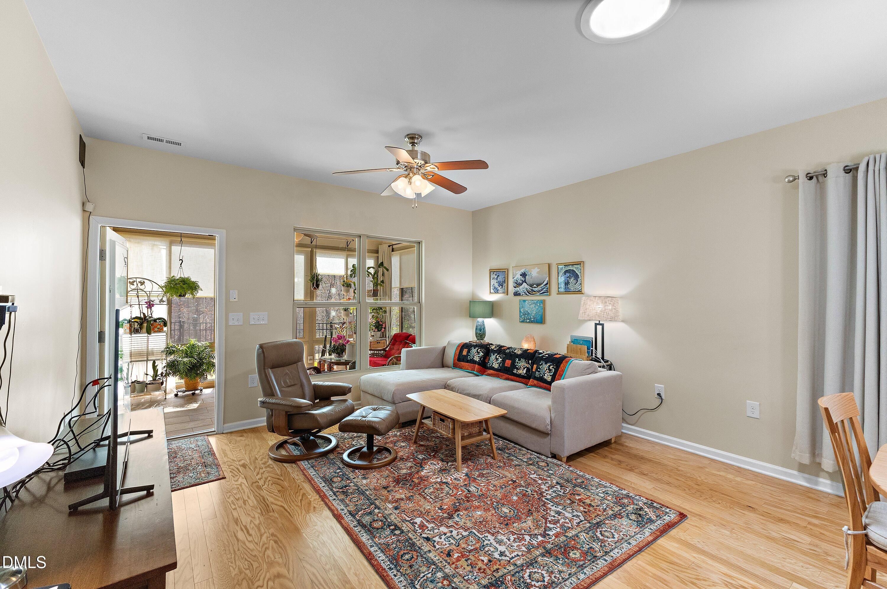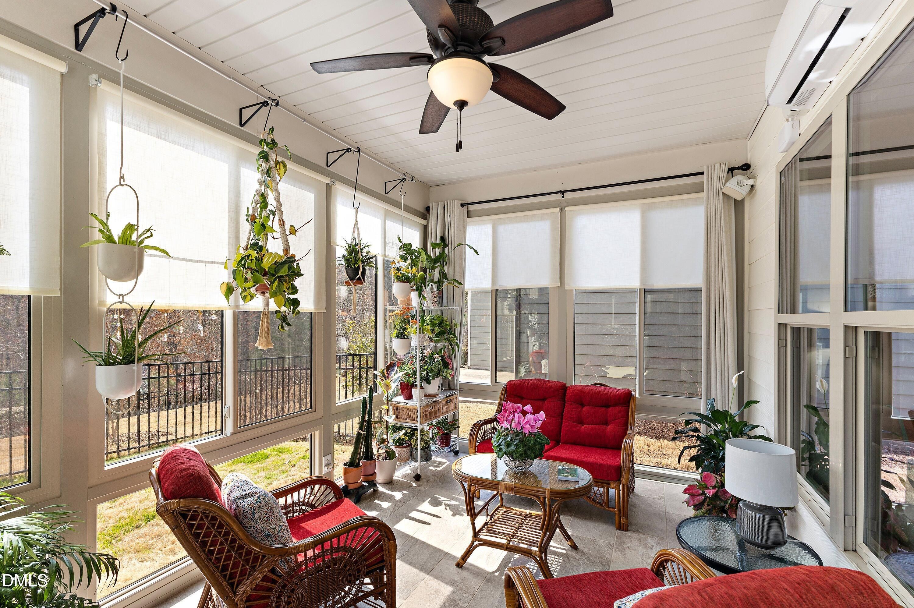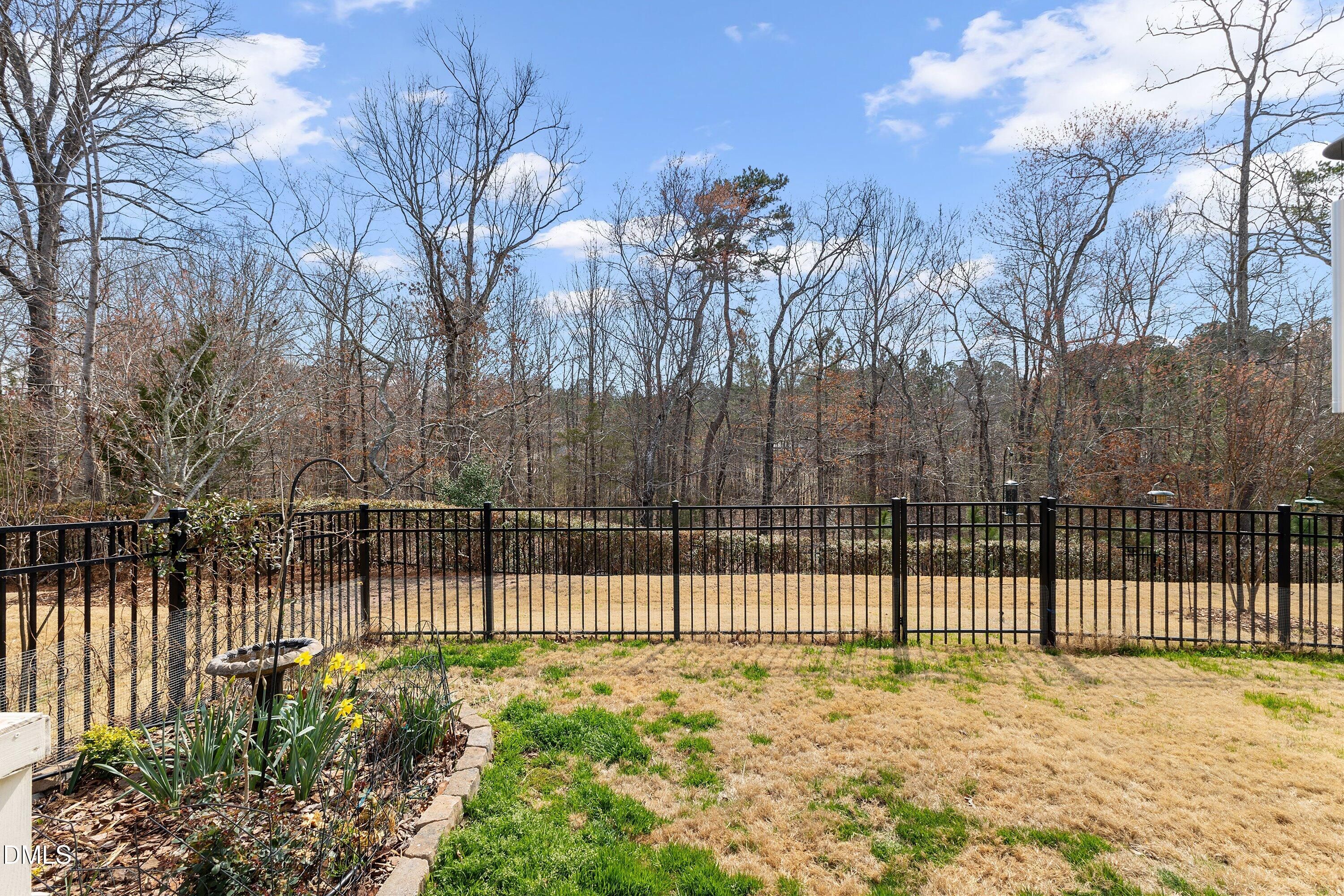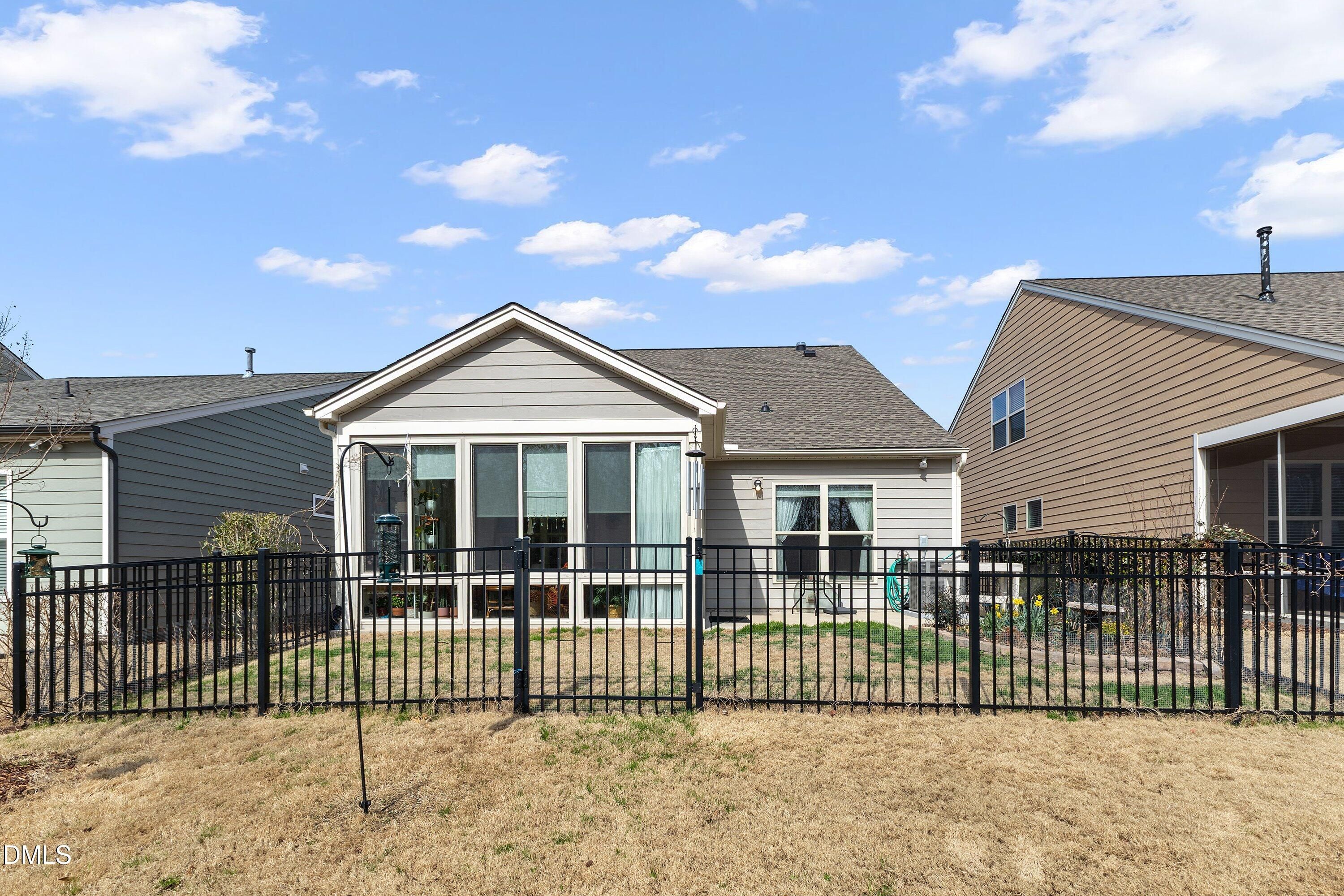 Hillcrest plan in Carolina Arbors on a private premium lot backing to woods, offers bright open living and a number of thoughtful updates and patio/sunroom. The main level features lighter wood flooring, an open kitchen with a large island, granite countertops, painted white cabinetry, upgraded appliances, and a glass-front display cabinet. Toward the front of the home, a dedicated office with French doors provides an ideal workspace, library, or quiet retreat. The main-level primary suite includes a large walk-in closet and granite vanity. At the rear, the original screened porch has been converted into a true four-season room by Southern Exposure with tile flooring and a dedicated mini-split system, creating comfortable year-round living space overlooking the fenced backyard and wooded setting. The grounds are a gardener's haven with many mature plantings bringing year-round delight. Additional upgrades include three sola tubes for maximum natural light, new roof 2022, new HVAC in 2021, whole-house surge protector, and a gas line on the extended patio for grilling. Upstairs offers a bedroom, full bath, and unfinished storage space, along with a flexible bonus room pre-wired with surround sound--perfect for relaxing with music, movies, or visiting guests. Located in the award-winning Carolina Arbors 55+ community with clubhouse, fitness center, pools, tennis, pickleball, walking trails, and an active social calendar, with convenient access to Brier Creek, RTP, and RDU.