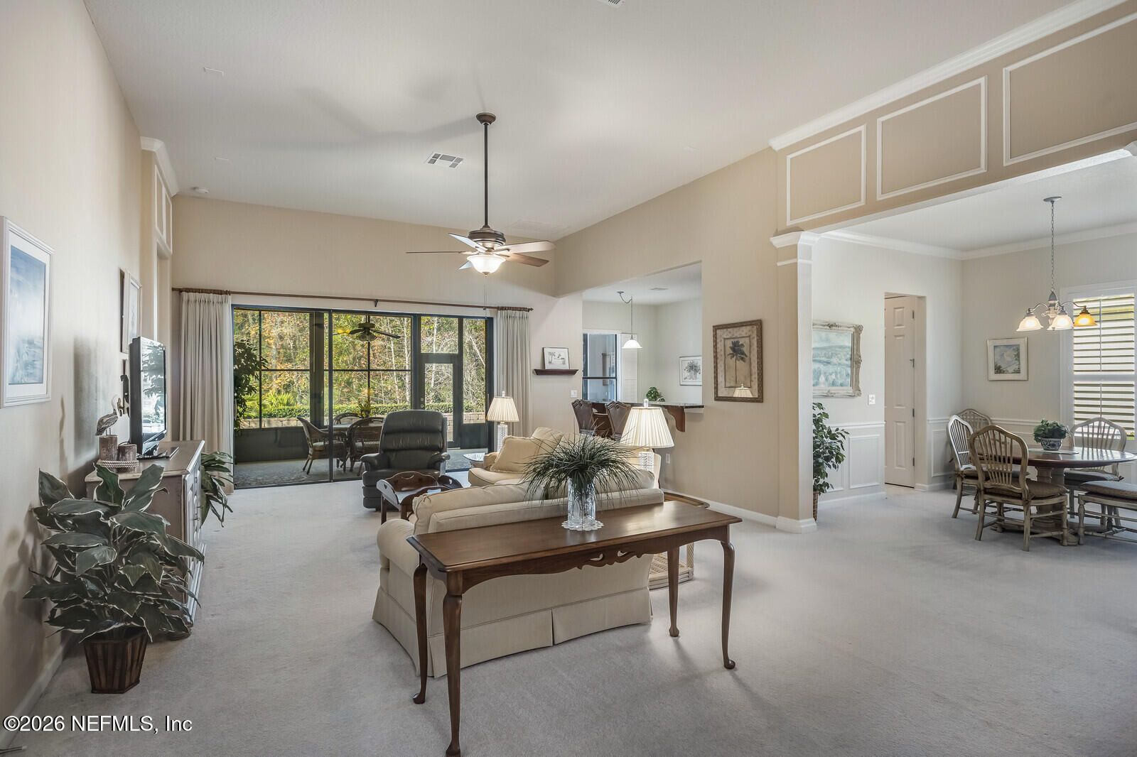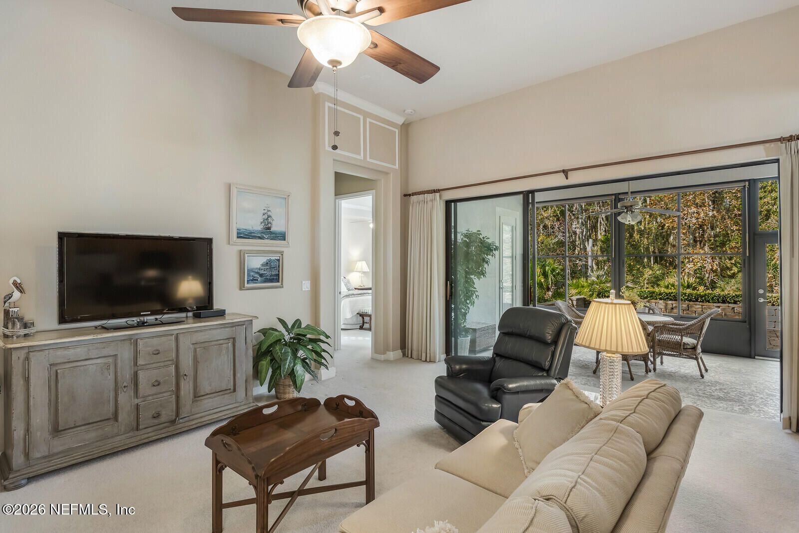 Enjoy easy living in this beautifully designed 2-bedroom, 2-bath home located in Del Webb Ponte Vedra's 55+ active adult, gated golf-cart community—where you can cart to friends' homes, resort-style amenities, or even the Nocatee Town Center. You are welcomed by elegant French front doors that invite you to an open floor plan with soaring ceilings and a large flex room with French doors, ideal for a home office, hobby space, or guest retreat. The kitchen offers abundant cabinet and counter space, and is complemented by both a formal dining room and cozy breakfast nook. Glass sliders extend the living space outdoors to an enclosed lanai featuring a summer kitchen with refrigerator, microwave, and sink, and continue to an oversized open-air lanai with plenty of room for seating and entertaining while overlooking the peaceful preserve. The split-bedroom layout provides privacy, and the spacious second bedroom features a charming bay window. A 2 care garage offer some added space plus a storage closet Residents enjoy premier amenities including the Central Park garden center and the Anastasia Club with indoor and outdoor pools, pickleball, bocce ball, library, billiards, fitness center with classes, clubs, social events, and moreplus full access to Nocatee's incredible amenities including two waterparks, miles of nature trails, and 200+ annual events.