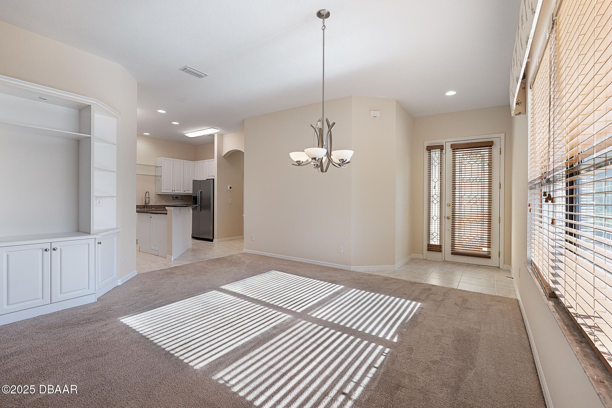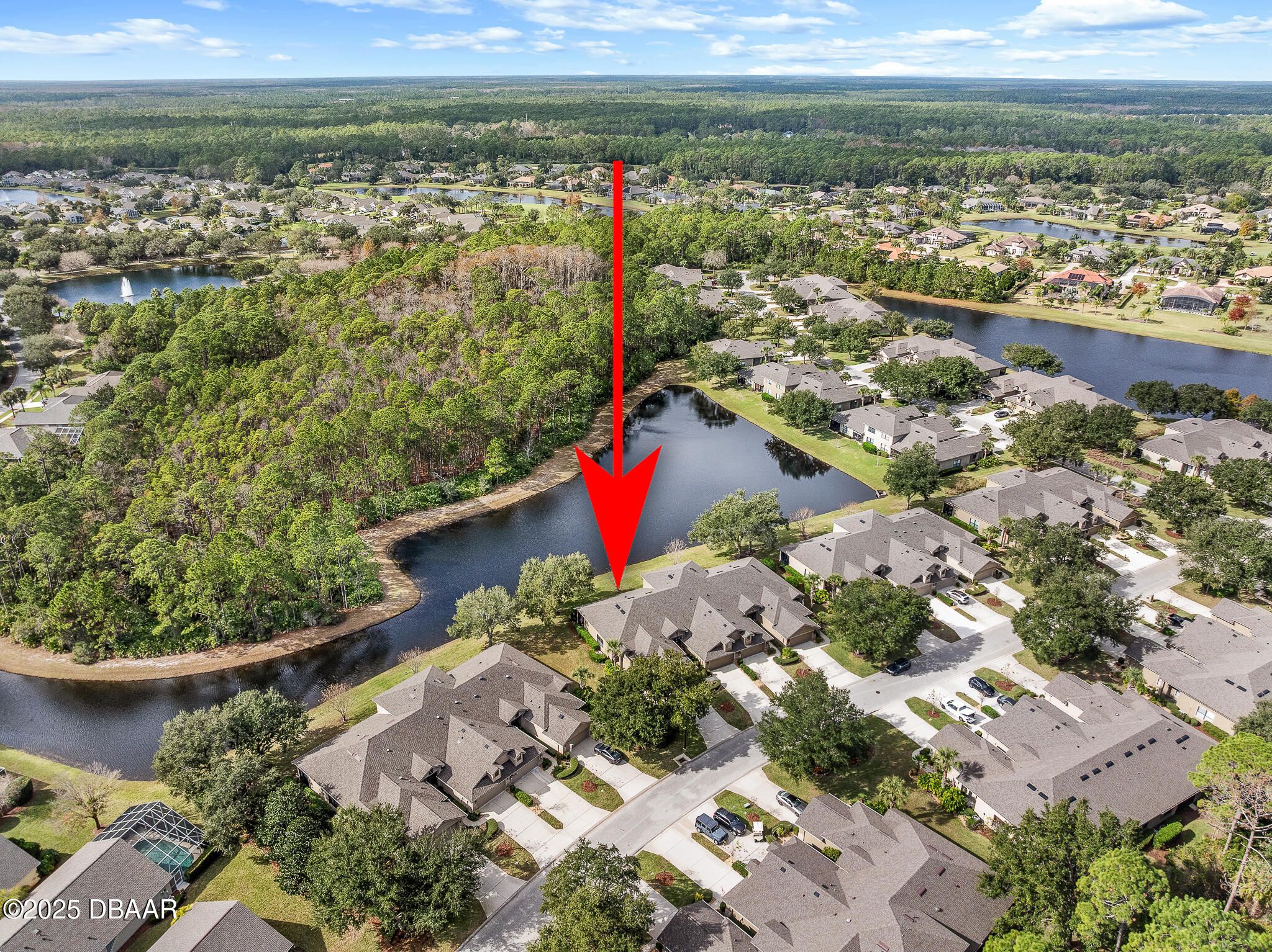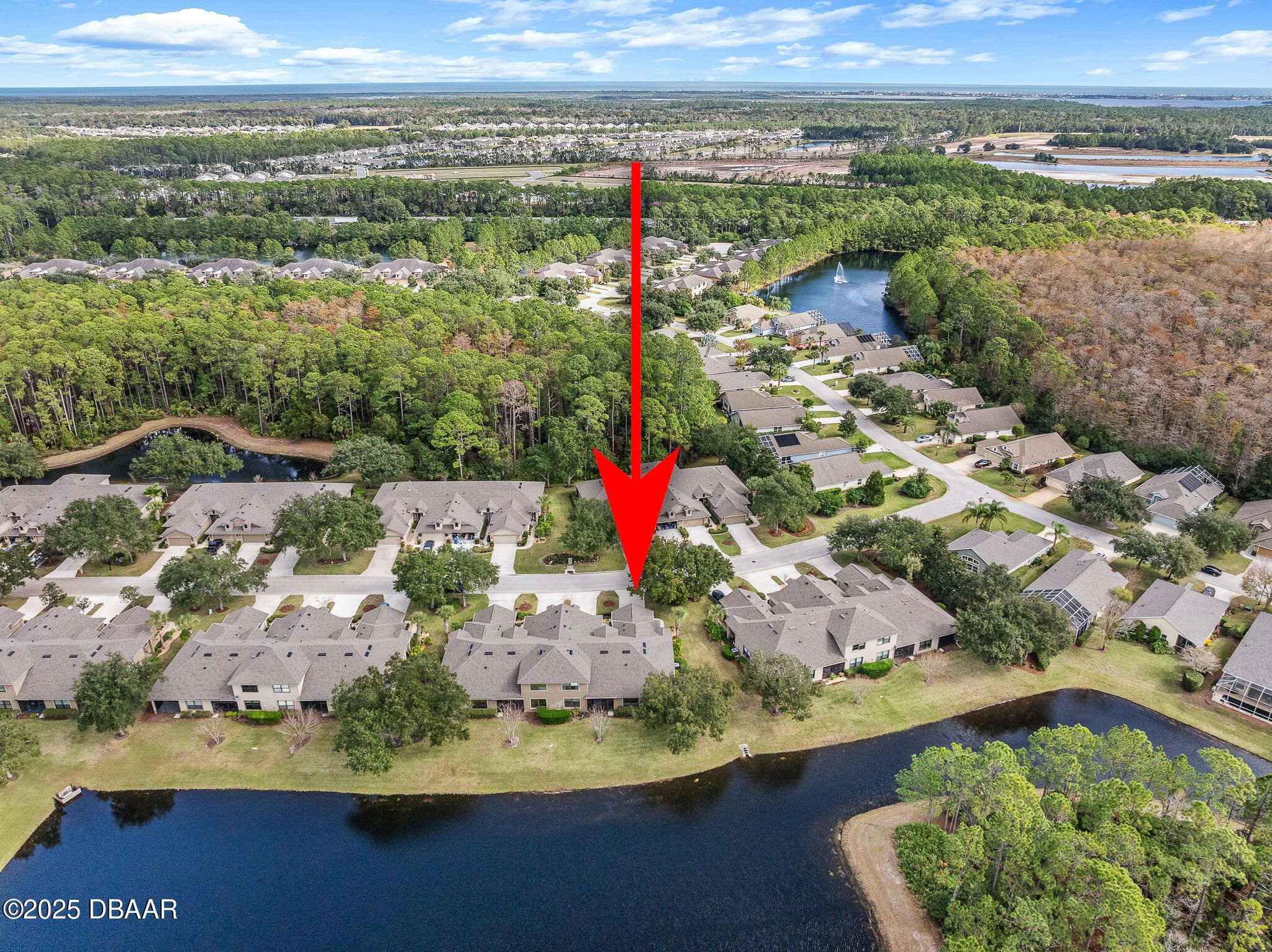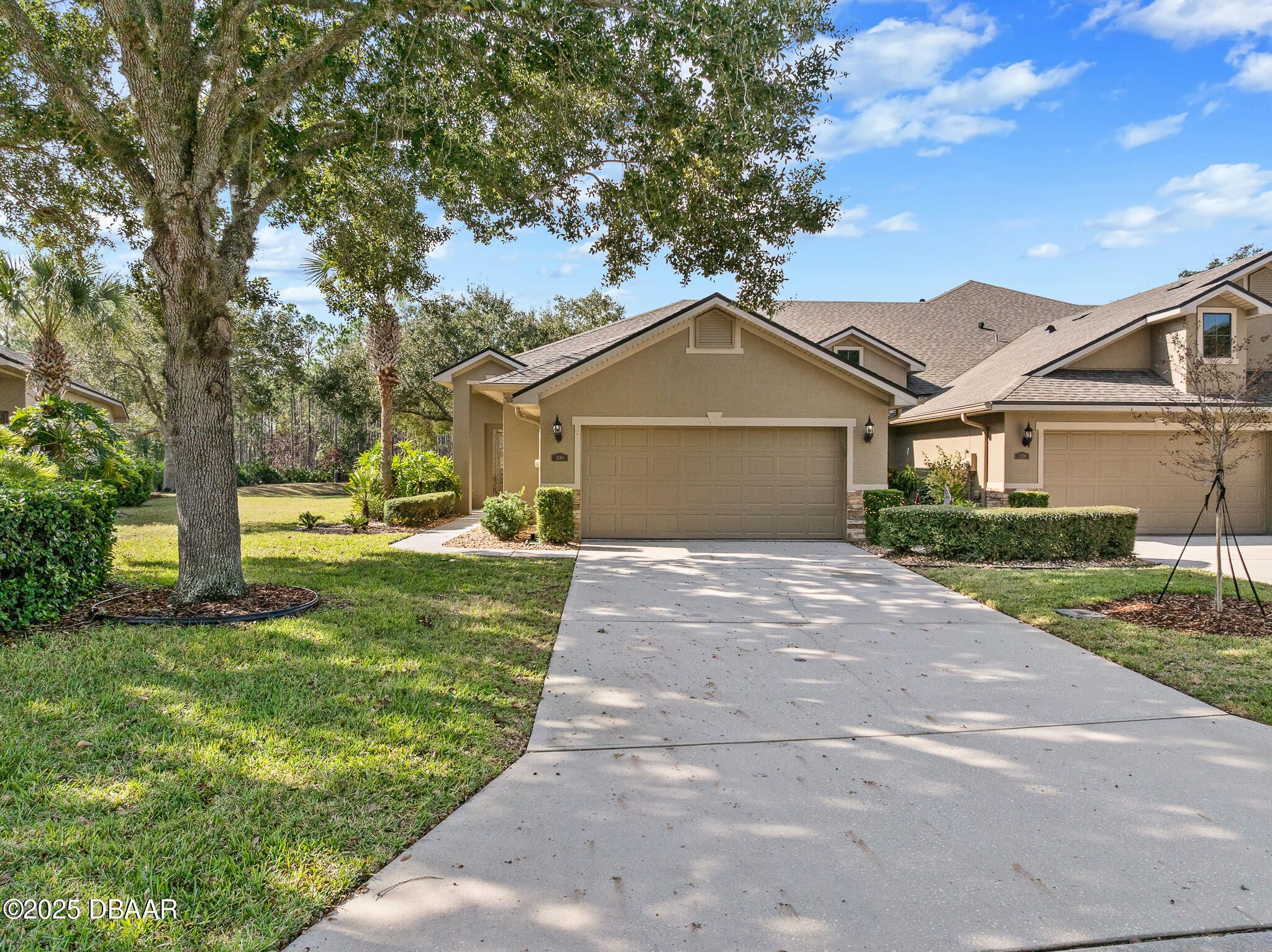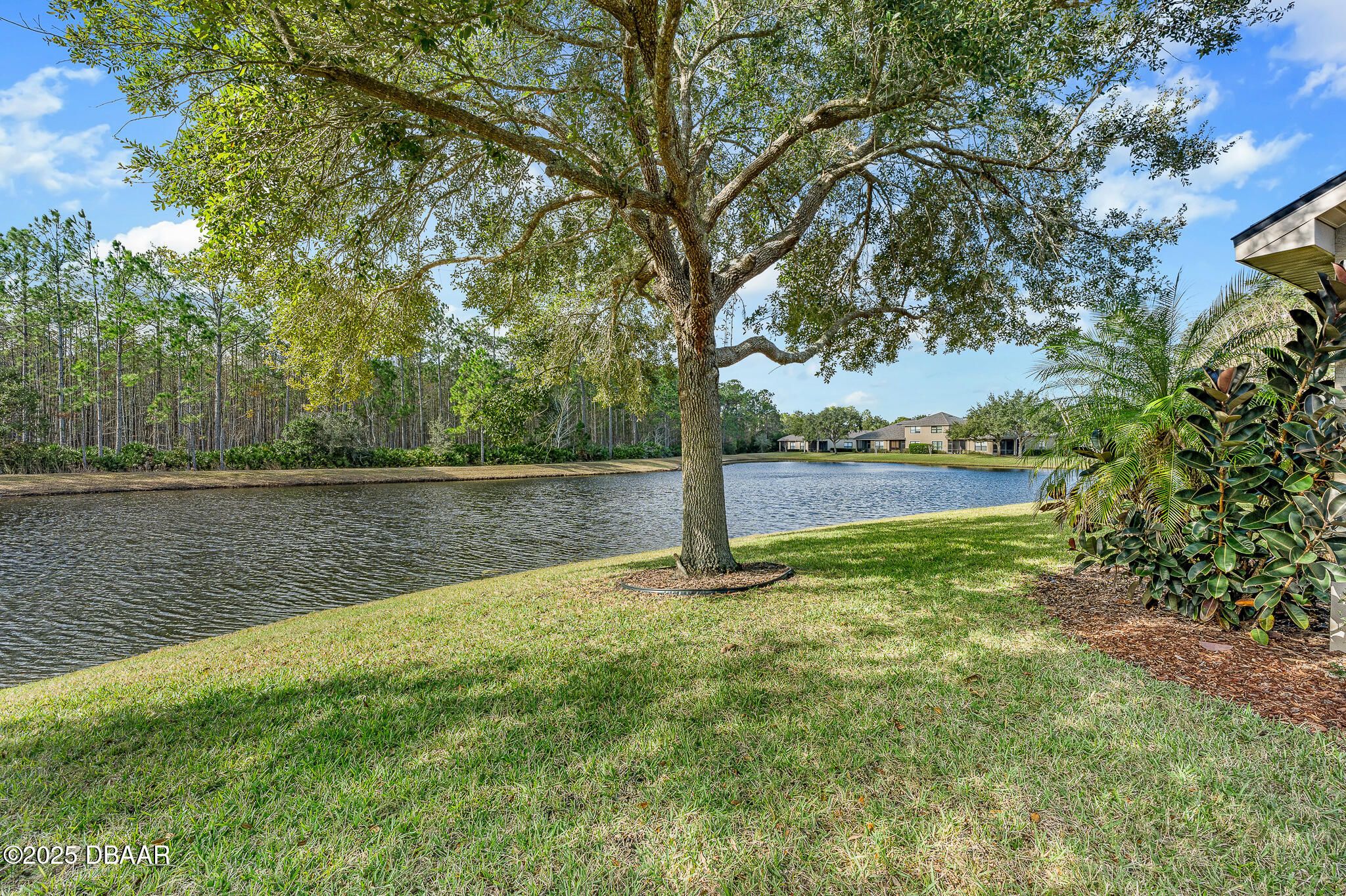 Welcome to 1130 Hansberry Court, a maintenance-free end-unit residence ideally positioned to capture some of the best lake and preserve views in Plantation Bay. A rare 3 bedroom, 1 story unit has a private entry with a glass front door opens to a tiled interior foyer, setting the tone for this light-filled and thoughtfully designed home. The dining room features plush carpeting, a statement chandelier, and a large window that brings in abundant natural light. The kitchen is both stylish and functional with tile flooring, granite countertops, a center island, For Micah countertops, 42-inch white cabinetry, and a full appliance package including a white kitchen accented by a stainless-steel refrigerator—perfect for everyday living and entertaining. The family room offers carpeted comfort, a ceiling fan, custom built-in cabinetry, and three sliding glass doors that lead to the lanai, where you can relax and take in serene lake and preserve views—one of the most desirable settings CONTD.. in the community. The spacious primary suite is accessed through double doors and includes plush carpeting, a large window overlooking the water, and walk-in closets. The primary bath features dual sinks, tile flooring, a walk-in shower, and a private water closet. Two additional bedrooms each offer carpet and ceiling fans, while the secondary bath has been updated with a new vanity and a tile tub/shower combination. Additional highlights include a laundry room with sink and cabinetry, a security system, and a two-car garage equipped with a Pelican whole-house water filtration system. Located within the gated, golf-course community of Plantation Bay, residents enjoy optional membership to world-class amenities including championship golf, clubhouse dining, resort-style pools, fitness and spa facilities, tennis, pickleball, and miles of walking and biking trails. With exterior maintenance/roof/pest/irrigation included, this home delivers a truly lock-and-leave lifestyle in one of the area's most sought-after communities.