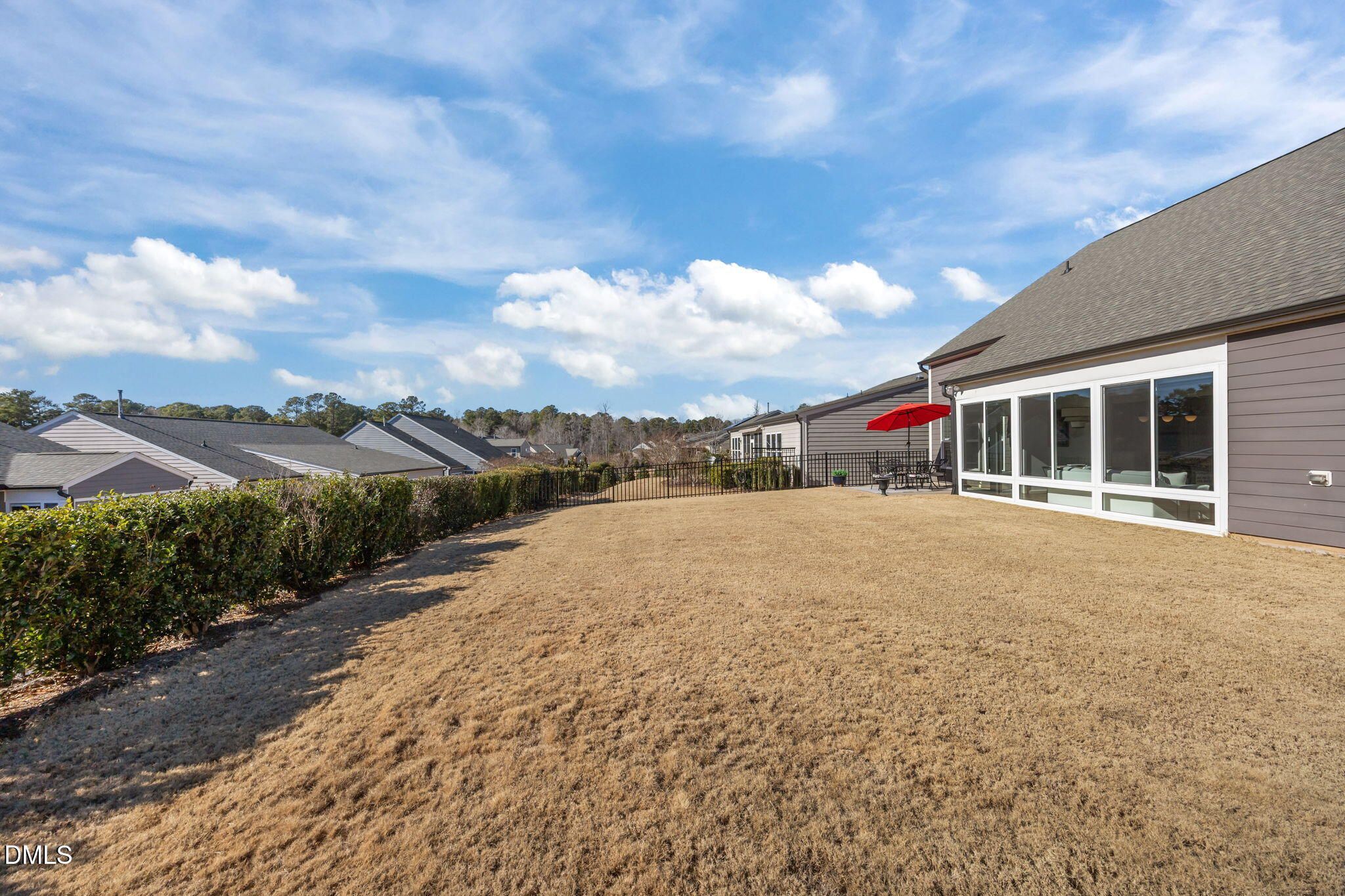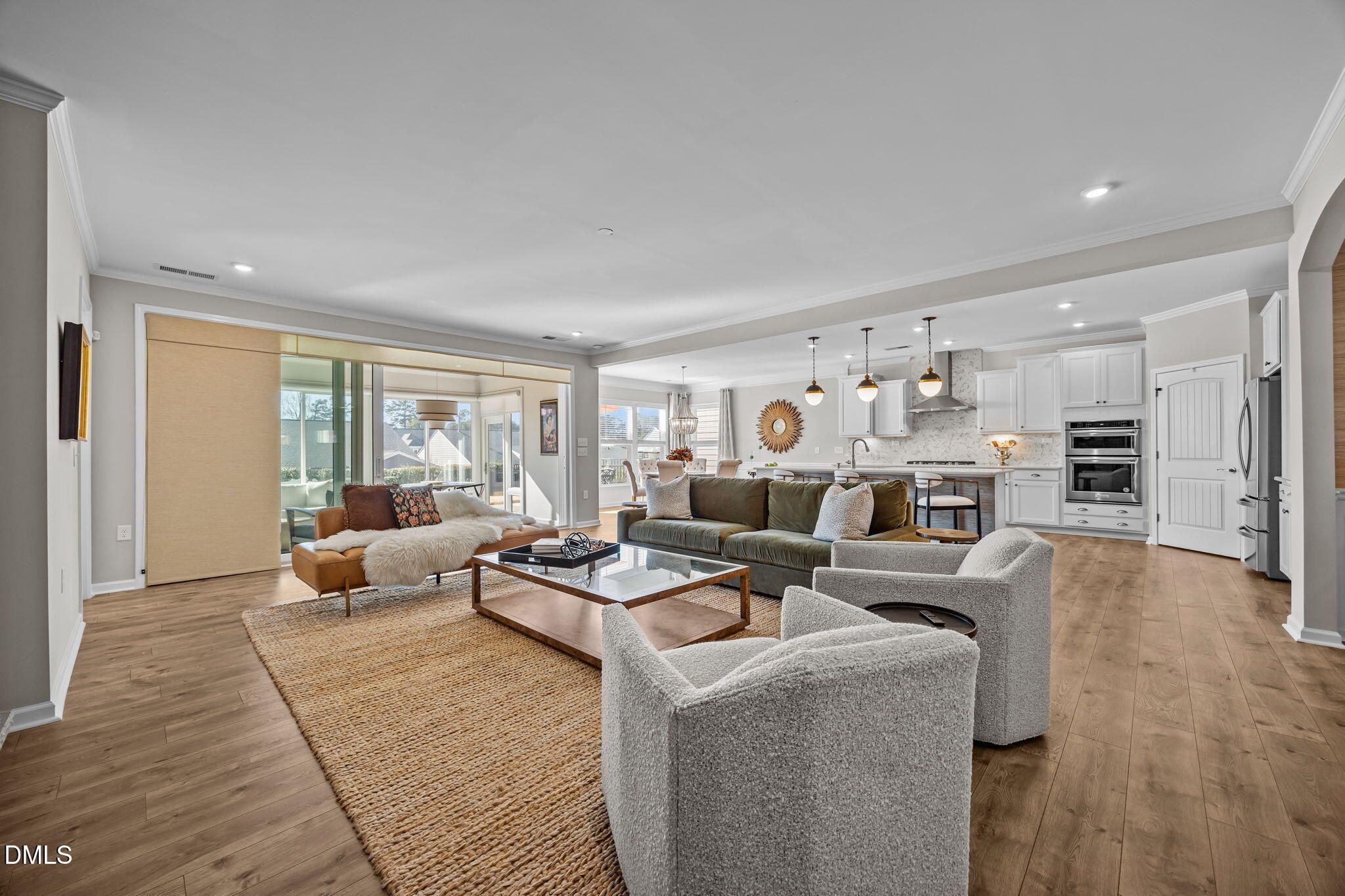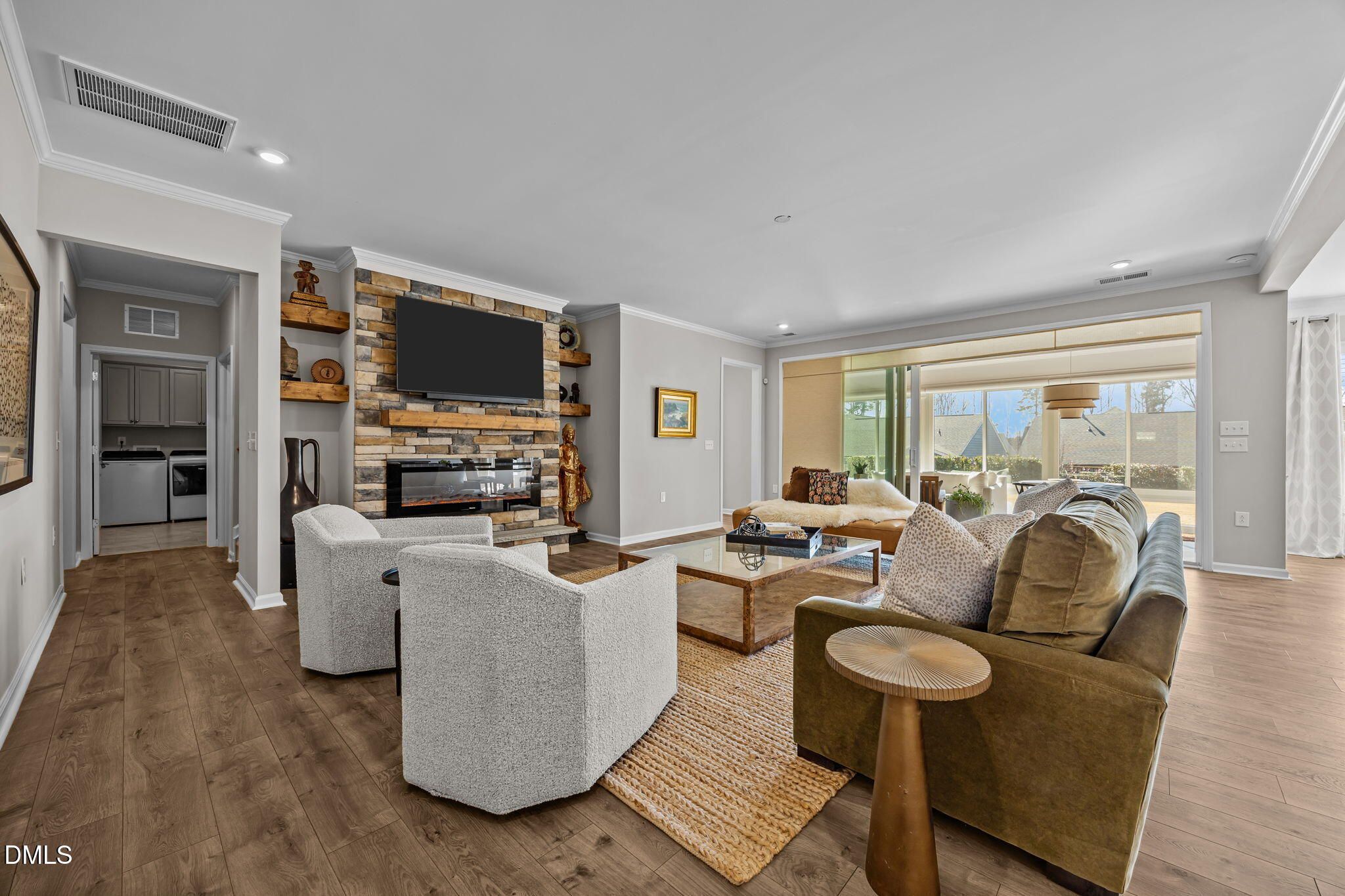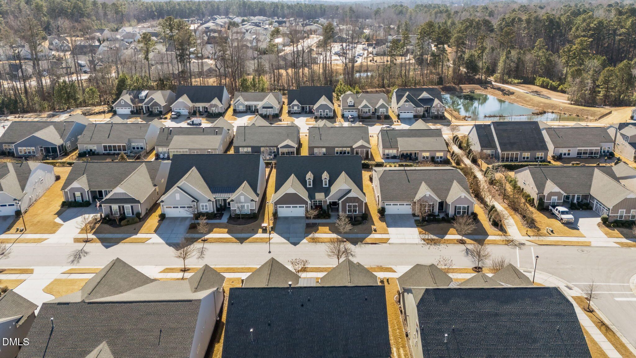 Located in the highly desirable Del Webb at Traditions community in Wake Forest, this immaculate 3,494 sq ft home offers exceptional active adult living with resort-style amenities including an impressive clubhouse, fitness center, indoor pool, pickleball and tennis courts, walking trails, and a full calendar of social activities. This move-in-ready Dunwoody floor plan features a spacious open-concept layout ideal for both everyday living and entertaining. The great room showcases a striking linear fireplace surrounded by stone flanked by symmetrical niches, creating a beautiful focal point. The kitchen is a true centerpiece with quartz countertops, tile backsplash, a large island, gas range, walk-in pantry, and designer lighting, complemented by luxury vinyl plank flooring and a tankless water heater. A major enhancement to the home is the conversion of the porch into a true sunroom with tile flooring, solar blinds, and sliding doors, seamlessly extending the living space and overlooking a beautifully landscaped, fully fenced backyard. The first floor also includes a generous primary suite with dual vanities, oversized tile shower, built-in makeup vanity, and custom California Closet system with built-in dresser, along with a guest bedroom featuring an ensuite bath, a spacious laundry room, and an updated powder room with new fixtures, lighting, mirror, and custom wall design. Upstairs, the home offers outstanding flexibility with a large bonus room perfect for media, games, or hobbies, a third bedroom with a large closet, a full bath, and conditioned walk-in storage. This exceptional home combines thoughtful upgrades, flexible living spaces, and a vibrant community lifestyle just minutes from downtown Wake Forest shopping, dining, and entertainment.