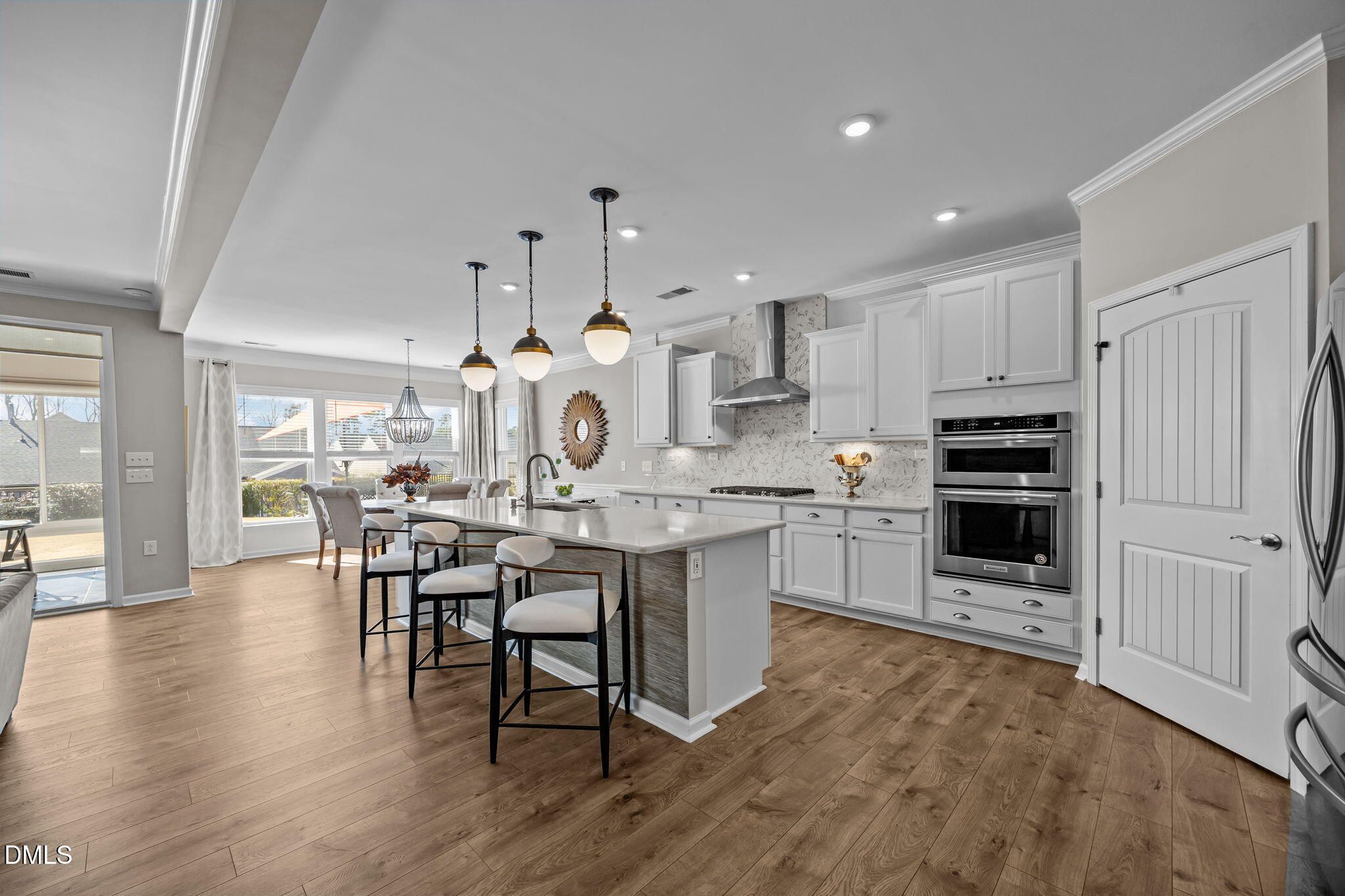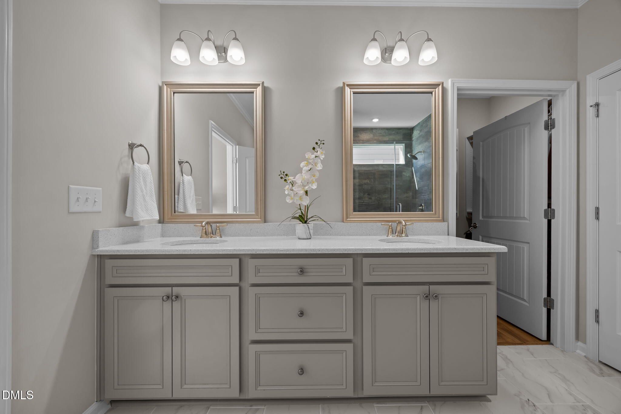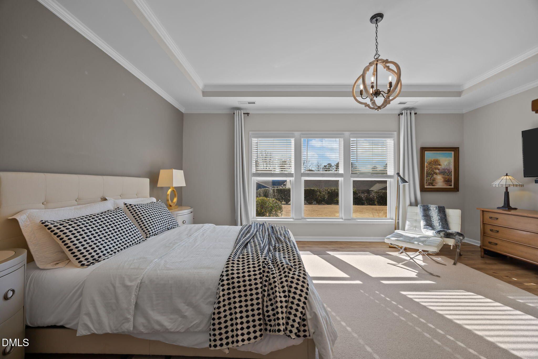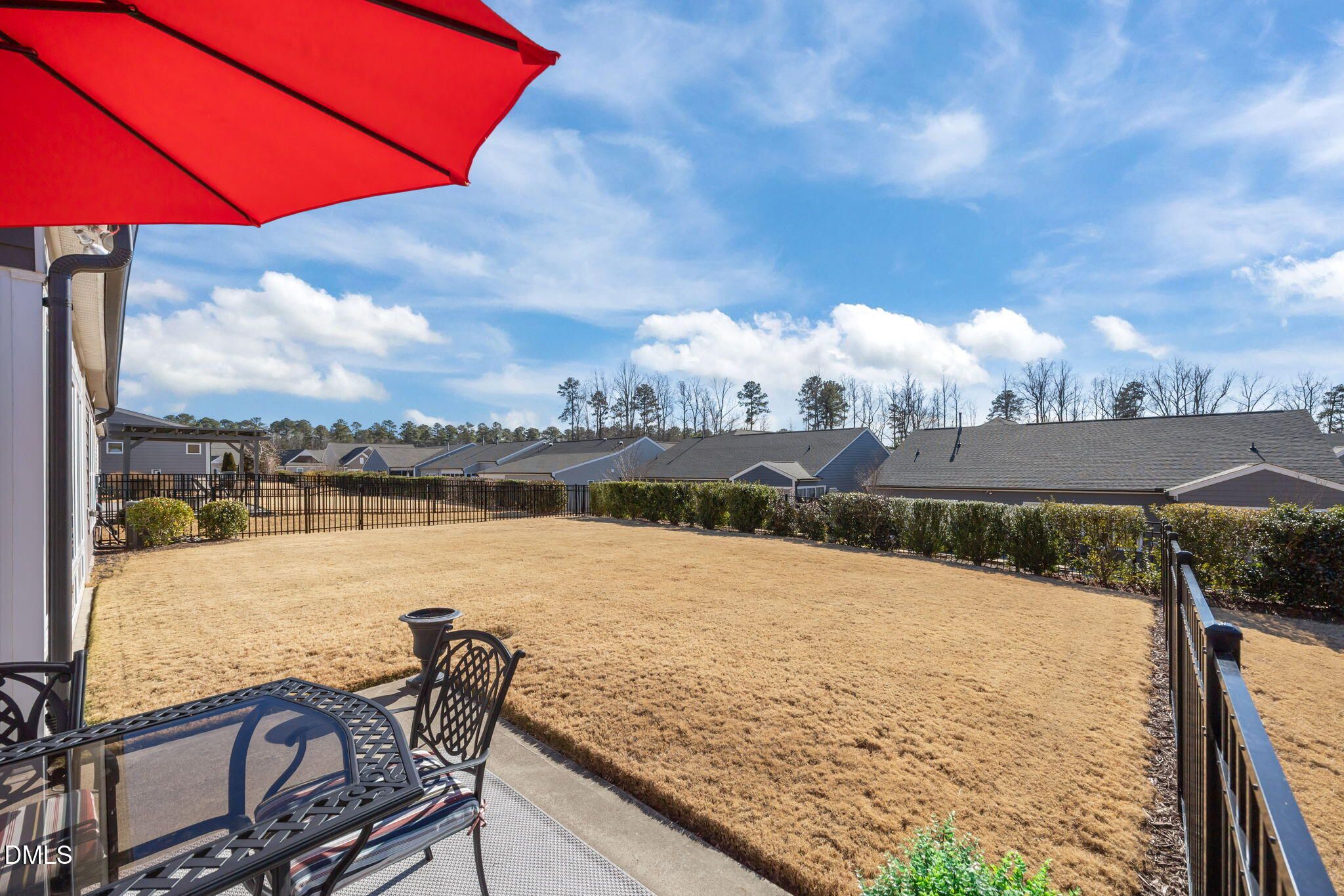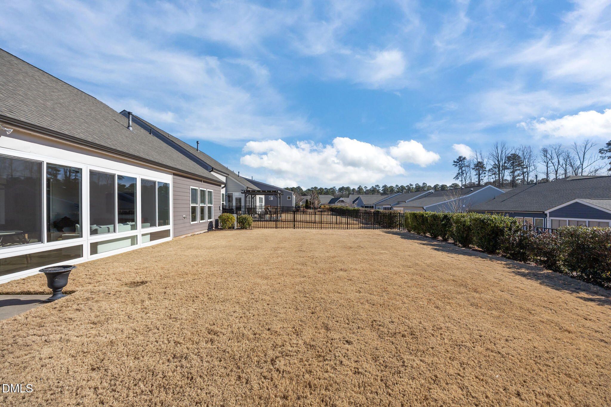Located in the highly desirable Del Webb at Traditions community in Wake Forest, this immaculate 3,494 sq ft home offers exceptional active adult living with resort-style amenities including an impressive clubhouse, fitness center, indoor pool, pickleball and tennis courts, walking trails, and a full calendar of social activities. This move-in-ready Dunwoody floor plan features a spacious open-concept layout ideal for both everyday living and entertaining. The great room showcases a striking linear fireplace surrounded by stone flanked by symmetrical niches, creating a beautiful focal point. The kitchen is a true centerpiece with quartz countertops, tile backsplash, a large island, gas range, walk-in pantry, and designer lighting, complemented by luxury vinyl plank flooring and a tankless water heater. A major enhancement to the home is the conversion of the porch into a true sunroom with tile flooring, solar blinds, and sliding doors, seamlessly extending the living space and overlooking a beautifully landscaped, fully fenced backyard. The first floor also includes a generous primary suite with dual vanities, oversized tile shower, built-in makeup vanity, and custom California Closet system with built-in dresser, along with a guest bedroom featuring an ensuite bath, a spacious laundry room, and an updated powder room with new fixtures, lighting, mirror, and custom wall design. Upstairs, the home offers outstanding flexibility with a large bonus room perfect for media, games, or hobbies, a third bedroom with a large closet, a full bath, and conditioned walk-in storage. This exceptional home combines thoughtful upgrades, flexible living spaces, and a vibrant community lifestyle just minutes from downtown Wake Forest shopping, dining, and entertainment.