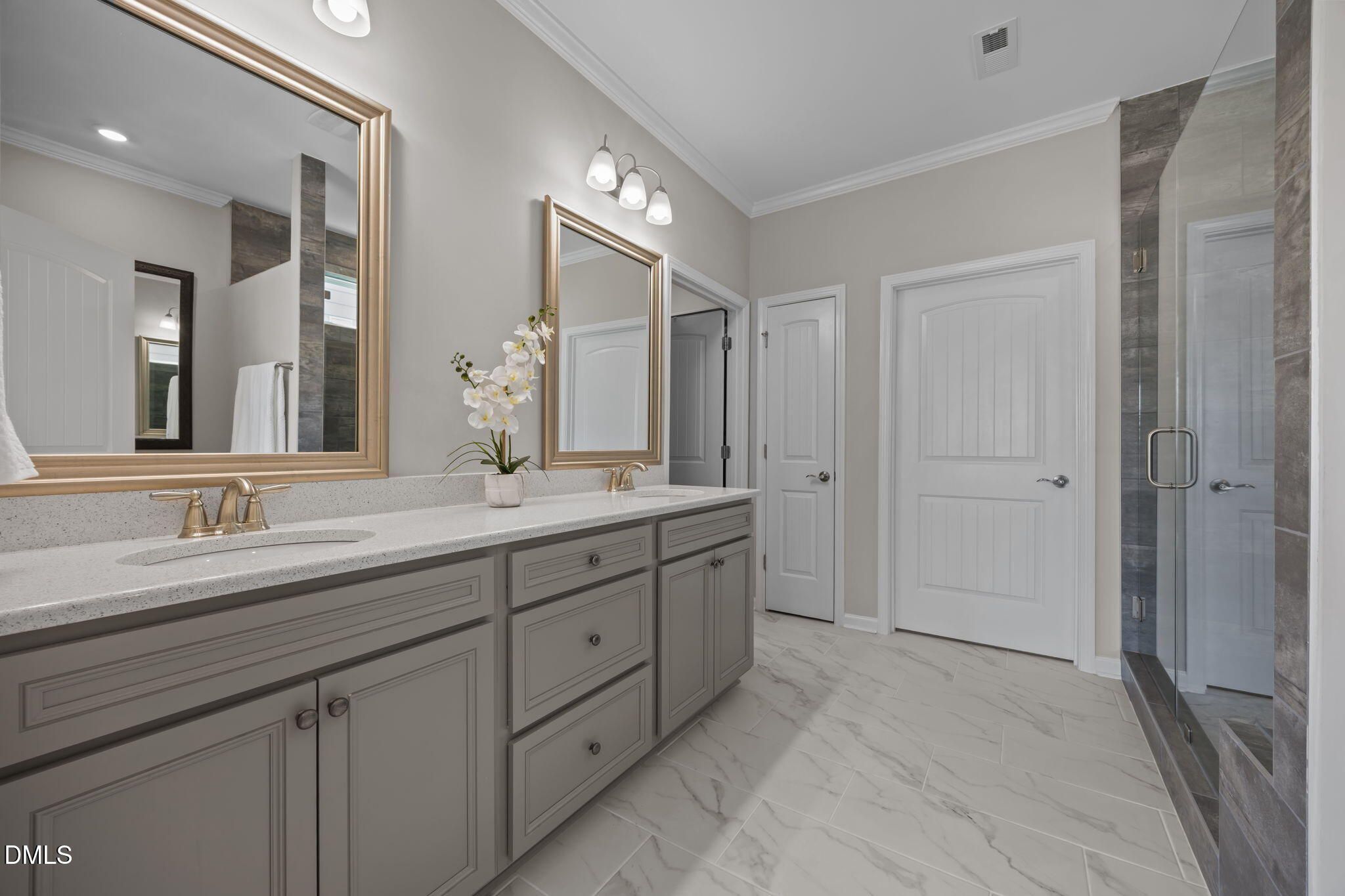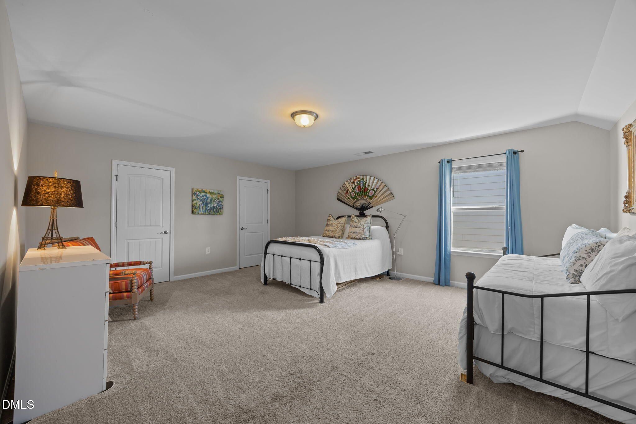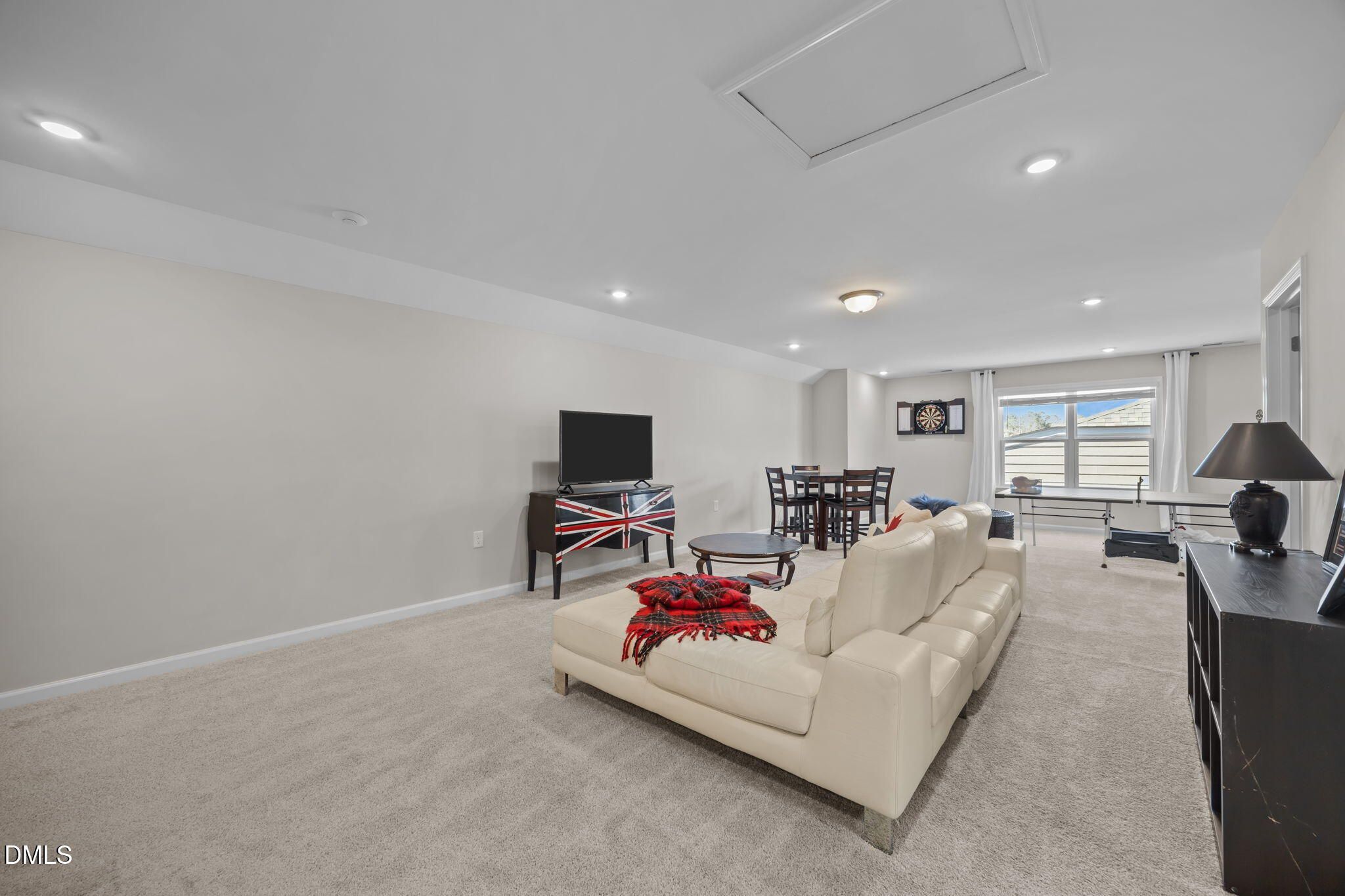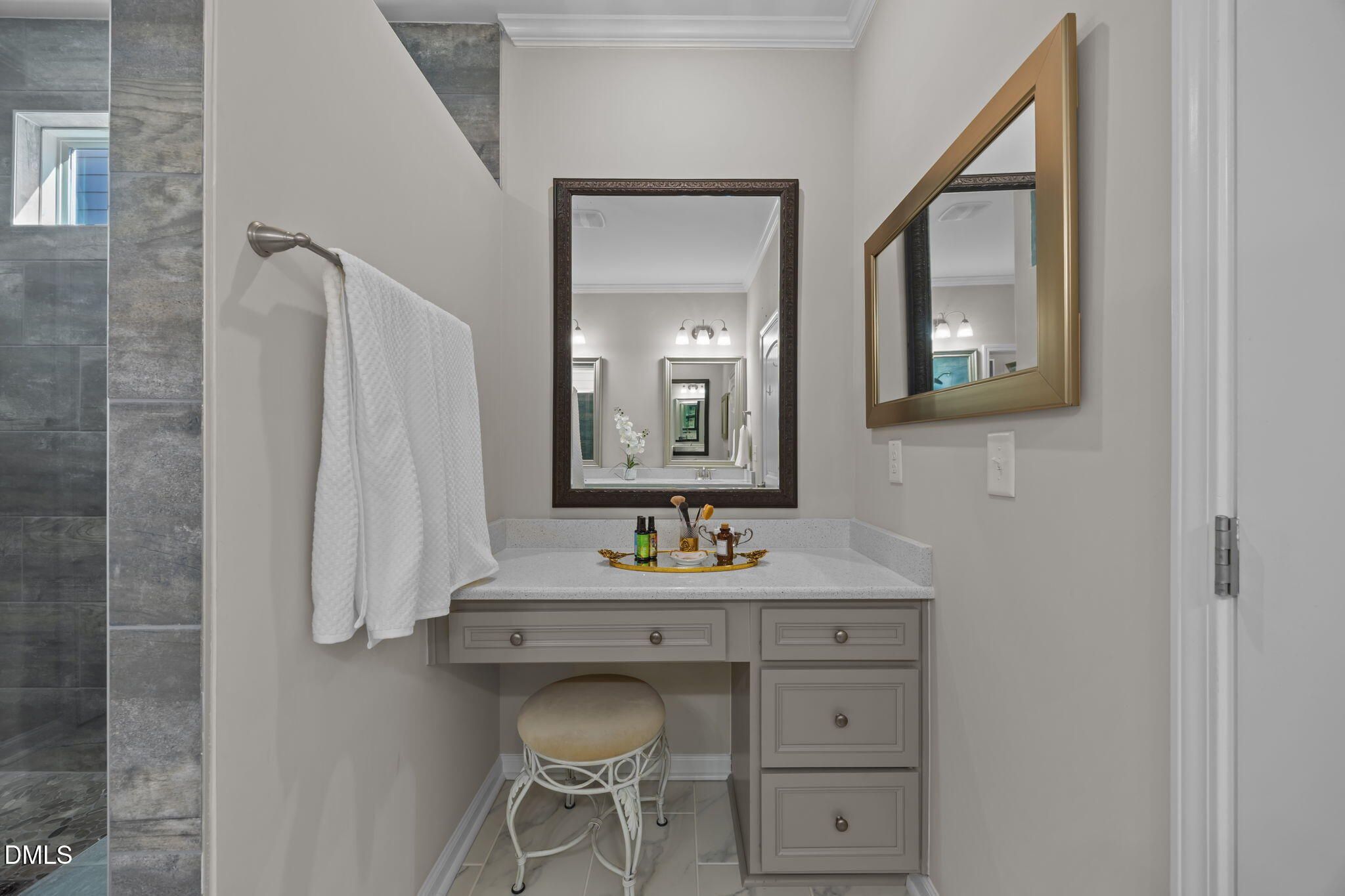Located in the highly desirable Del Webb at Traditions community in Wake Forest, this immaculate 3,494 sq ft home offers exceptional active adult living with resort-style amenities including an impressive clubhouse, fitness center, indoor pool, pickleball and tennis courts, walking trails, and a full calendar of social activities. This move-in-ready Dunwoody floor plan features a spacious open-concept layout ideal for both everyday living and entertaining. The great room showcases a striking linear fireplace surrounded by stone flanked by symmetrical niches, creating a beautiful focal point. The kitchen is a true centerpiece with quartz countertops, tile backsplash, a large island, gas range, walk-in pantry, and designer lighting, complemented by luxury vinyl plank flooring and a tankless water heater. A major enhancement to the home is the conversion of the porch into a true sunroom with tile flooring, solar blinds, and sliding doors, seamlessly extending the living space and overlooking a beautifully landscaped, fully fenced backyard. The first floor also includes a generous primary suite with dual vanities, oversized tile shower, built-in makeup vanity, and custom California Closet system with built-in dresser, along with a guest bedroom featuring an ensuite bath, a spacious laundry room, and an updated powder room with new fixtures, lighting, mirror, and custom wall design. Upstairs, the home offers outstanding flexibility with a large bonus room perfect for media, games, or hobbies, a third bedroom with a large closet, a full bath, and conditioned walk-in storage. This exceptional home combines thoughtful upgrades, flexible living spaces, and a vibrant community lifestyle just minutes from downtown Wake Forest shopping, dining, and entertainment.