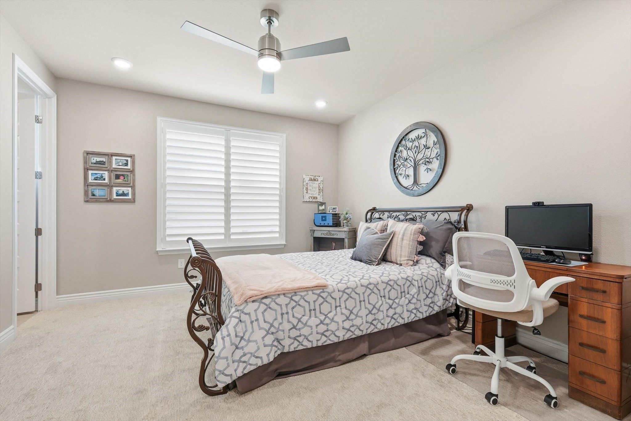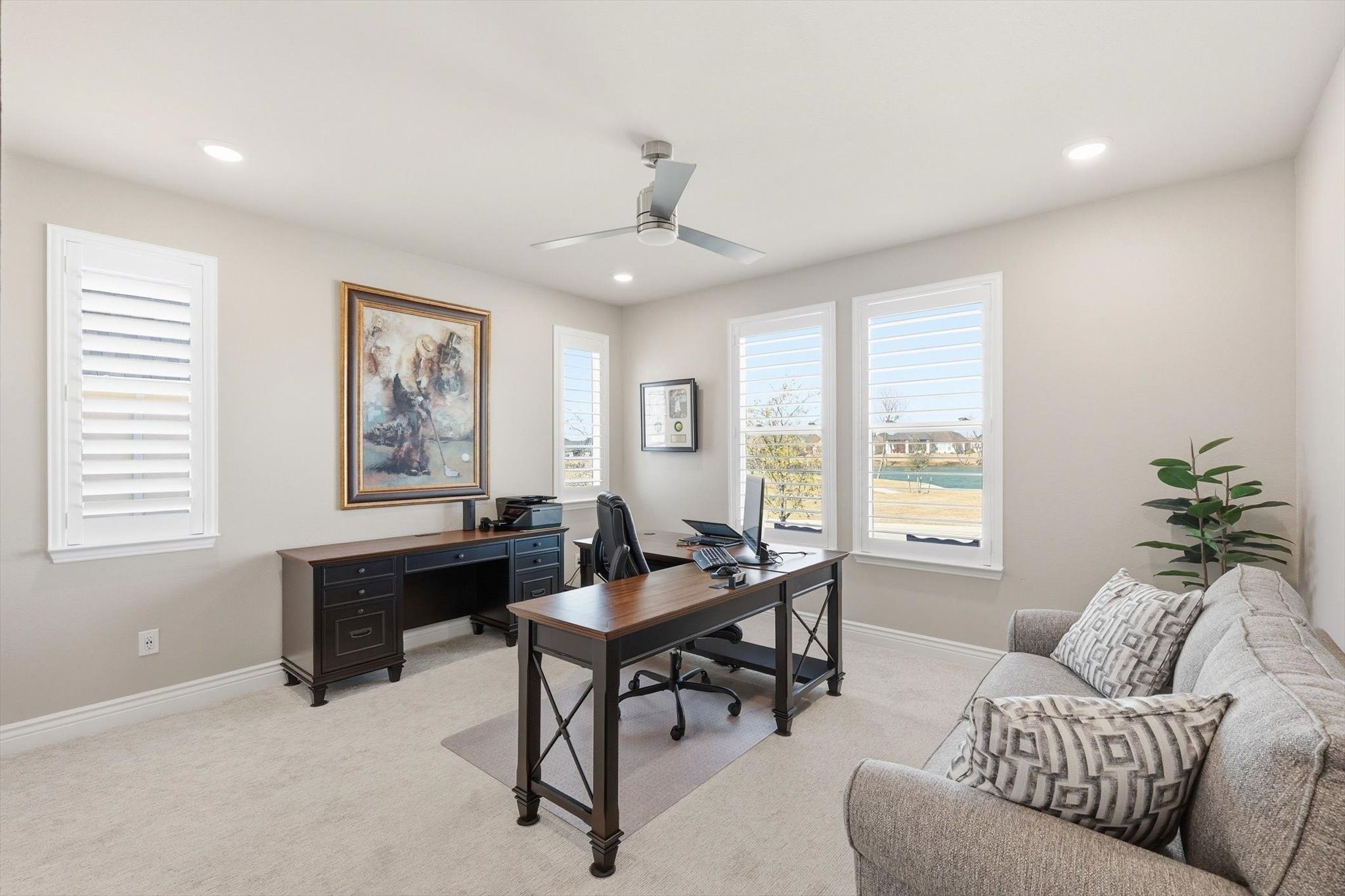 Enjoy Luxurious Senior Living in Robson Ranch without compromise in this wonderful Ashland plan. With an abundance of space for Guests and Grands, an enormous shelved Walk-in Attic for your seasonals and keepsakes, and a fabulous Golf Course Lot overlooking the 6th Green affording gorgeous views without the stray golf balls, this home has it all. There is also a tranquil pond across the street so you can enjoy the view from the Front Patio as well as relaxing walks around the pond. Amazing Island Kitchen with Quartz Counters and Pendant Lighting, Upgraded White Cabinetry, and Stainless Steel Appliances! The rich Wood Floors, Custom Built-ins and automated Motorized Shades in the Main Living Areas add warmth and elegance. Downstairs there are 3 Bedrooms with Ensuites plus an Office or Den and there is a Huge Gameroom with Half-Bath up, making hosting your Family and Friends a breeze! Tons of upgrades including Built-Ins, Custom Closet System, Stunning Steel Entry Door, Relaxing Whirlpool Tub, Recirculating Tankless Water Heater, extensive Landscaping including Gorgeous Hardscape and Pavers in the front and back, as well as Epoxy Flooring and Custom Cabinetry in the Extended 3-car Garage. You will enjoy getting to know your Wonderful Neighbors in this brand new neighborhood that is nearing completion. Don't miss your chance to own this beautiful 1 year-old home on one of the most desirable lots in the community! Be sure and check out the virtual tour to 'walk through' the home!