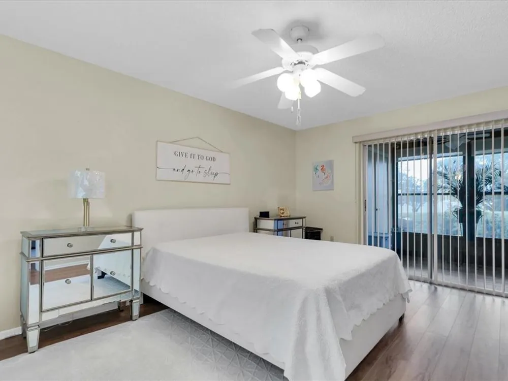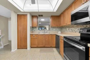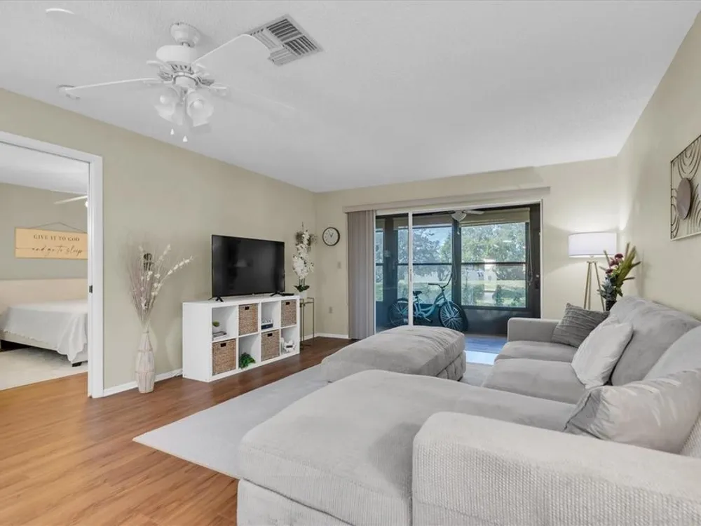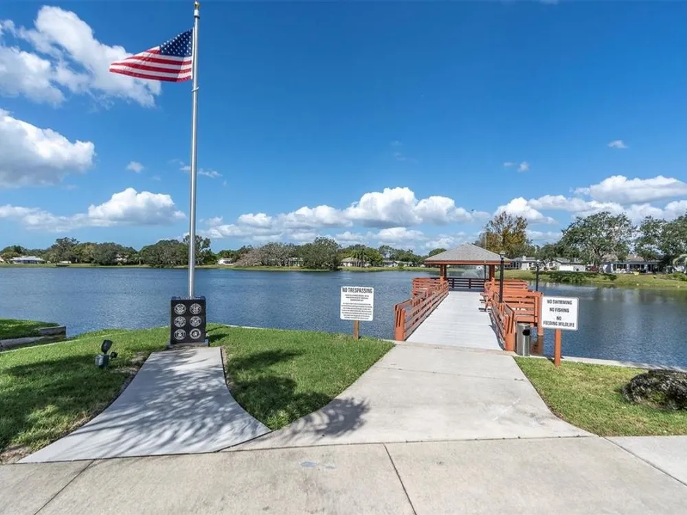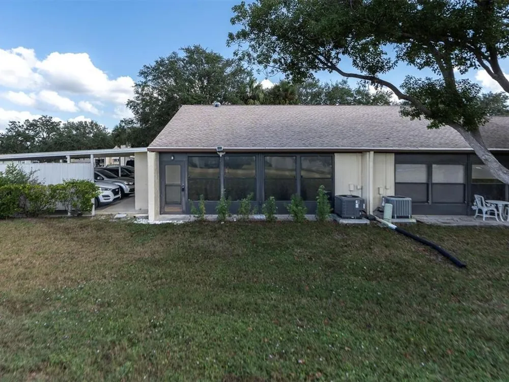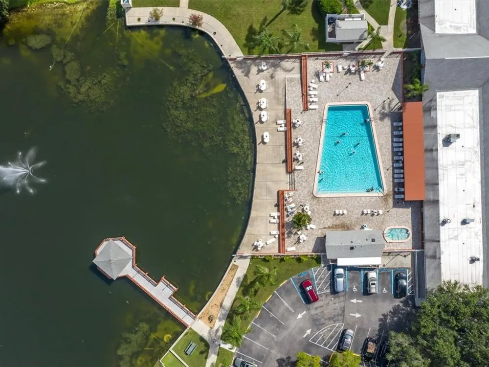 Welcome to this beautifully updated 2-bedroom, 2-bath end-unit condo in the picturesque Dollar Lake Village, part of the highly sought-after Timber Oaks 55+ community. This move-in-ready home blends comfort, style, and thoughtful upgrades. A charming glass storm door invites you inside, where you’ll find an updated kitchen with stainless steel appliances, a closet pantry, and extra cabinetry for abundant storage. A solar tube fills the home with soft, natural light, complemented by updated LED fixtures for a bright, airy feel. The open dining and living area includes a flexible niche—perfect for a dry bar, coffee station, or extra storage. Gorgeous laminate flooring runs throughout—no carpet here—creating a clean, modern look. Triple sliding glass doors lead to a spacious, tiled Florida Room with a large storage closet, an ideal spot to relax or enjoy your morning coffee. Step outside to your private back area with a peaceful pond view, or take a short stroll to the community pool .The split floor plan ensures privacy, making it easy to host guests or set up a home office in the front bedroom. The generously sized primary suite opens to the Florida Room and features an ensuite bath with a make-up area, walk-in closet, and shower. An inside laundry room adds convenience, and the covered carport with an additional storage closet provides extra functionality. The A/C was replaced in 2021, giving you peace of mind for years to come. Monthly condo fees include reserves, cable, internet, water, sewer, trash, roof care, and exterior maintenance. Residents of Dollar Lake Village enjoy their own private pool, plus access to the Timber Oaks clubhouse, which offers a fitness room, heated pool, pickleball and tennis courts, card room, billiards, and a full calendar of social events and clubs.Come see for yourself—this condo isn’t just a home, it’s a lifestyle you’ll love living every day!