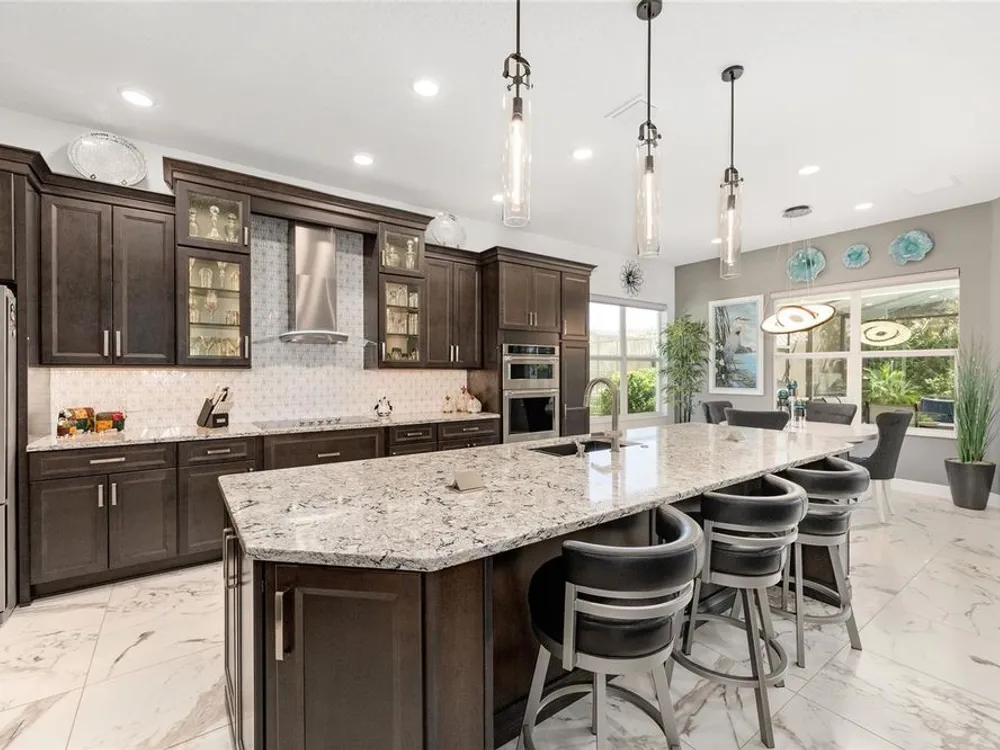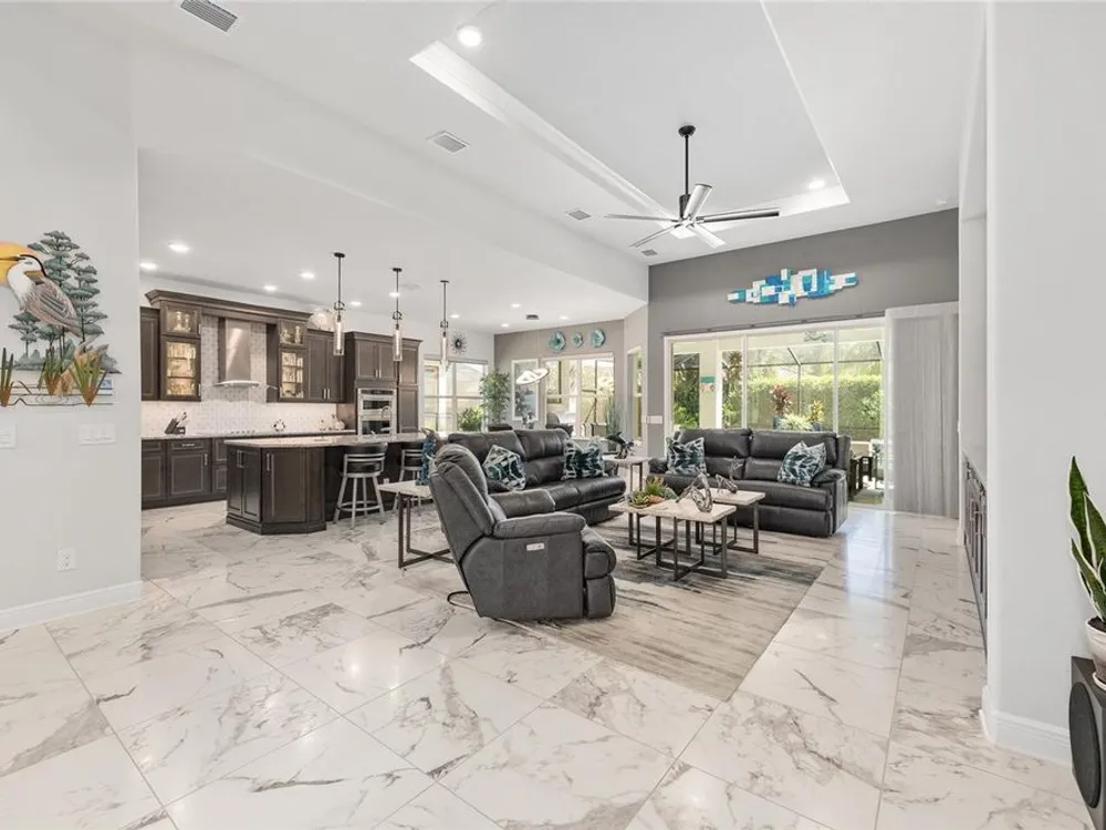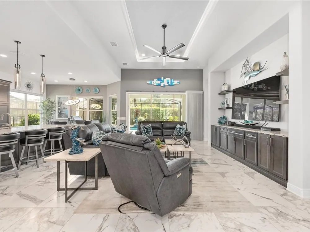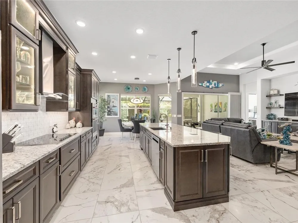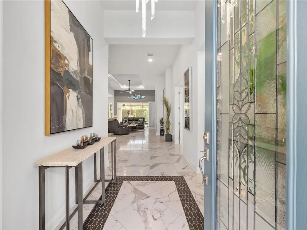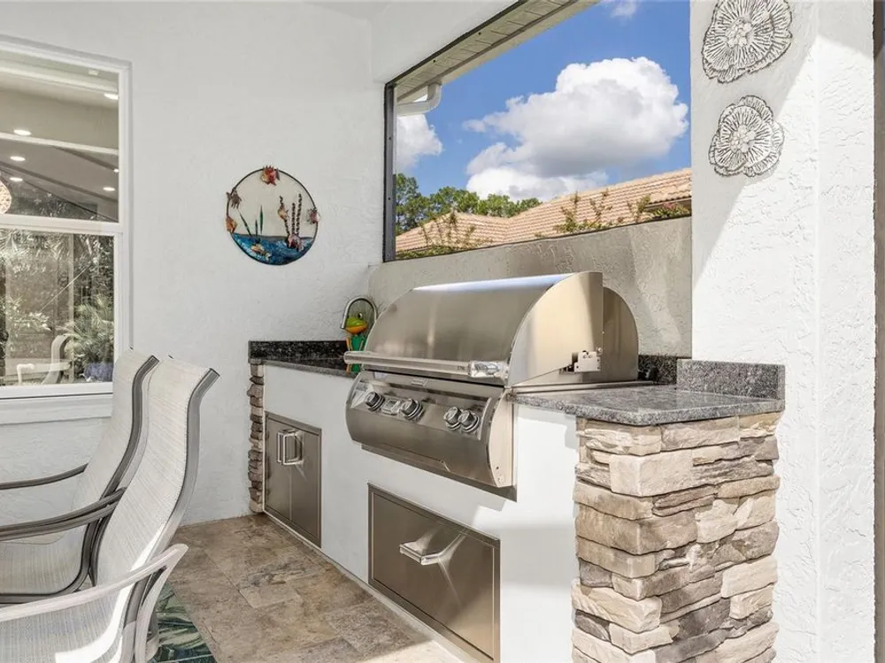 Located in the gated community of Terra Vista, this stunning Hunt Club residence offers custom design and numerous upgrades. With 2,492 square feet, the home includes two bedrooms, a dedicated office or optional third bedroom and immaculate finishes throughout. Why wait on new construction when this home is ready now with top-tier features at every turn. Only the best of the best for this beautiful home. Interior highlights include soaring ceilings, marble flooring throughout, eight-foot doors, lighted tray ceilings and a custom entertainment center in the great room. Premium details include upgraded top-of-the-line flooring, countertops, lighting and custom window coverings, Hunter Douglas Power Sheer Shades and plantation shutters. The kitchen showcases a large 11-foot island with cabinetry on both ends, quartz countertops, a marble backsplash, KitchenAid appliances, custom glass cabinets with interior lighting, LED under-lighting and a dual cabinet pantry with pull-out drawers. The built-out laundry room offers additional storage and workspace. The primary suite provides two walk-in closets, dual vanities and a spacious walk-in shower. An expanded guest suite features a full walk-in shower, while the additional flex room could be used as an office, playroom or a third bedroom. Unmatched elegance in outdoor living where the beautiful Travertine-tiled lanai overlooks the sparkling saltwater pool with a water feature. For your entertaining needs, an outdoor kitchen featuring Fire Magic 36-inch Echelon Diamond Grill with digital controls and rotisserie, providing unlimited entertainment for your friends and family. Built with energy efficiency in mind, the residence includes core foam insulation in the concrete block, a radiant barrier on the roof decking and an upgraded HVAC system with integrated climate and humidity control. The 24-by-24-foot garage with an 18-foot door provides ample storage for vehicles and recreational equipment. Terra Vista offers three 18-hole golf courses, a spa and fitness center, dining venues, tennis courts, a dog park, trails and more. A full list of amenities is available on the Citrus Hills website.