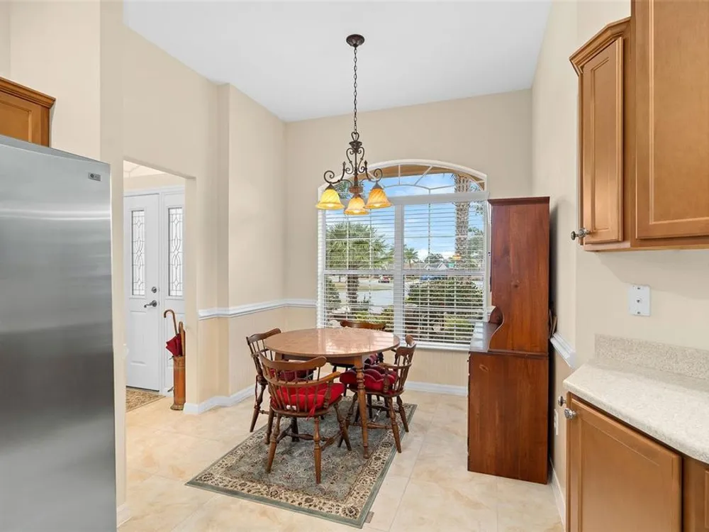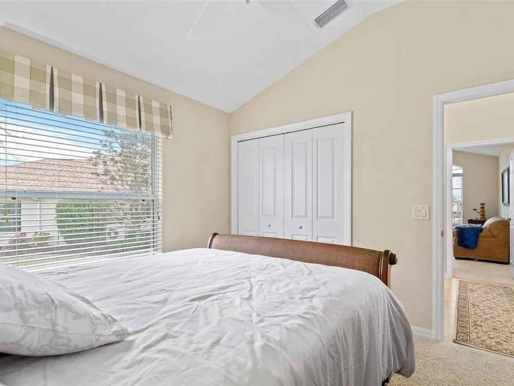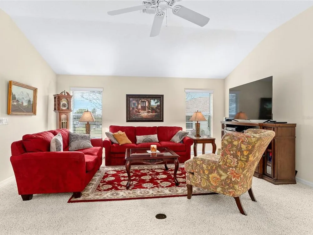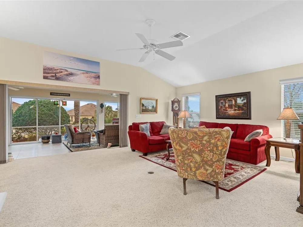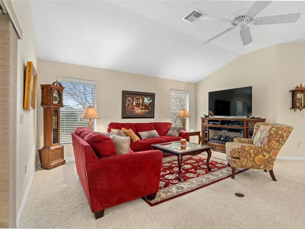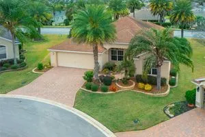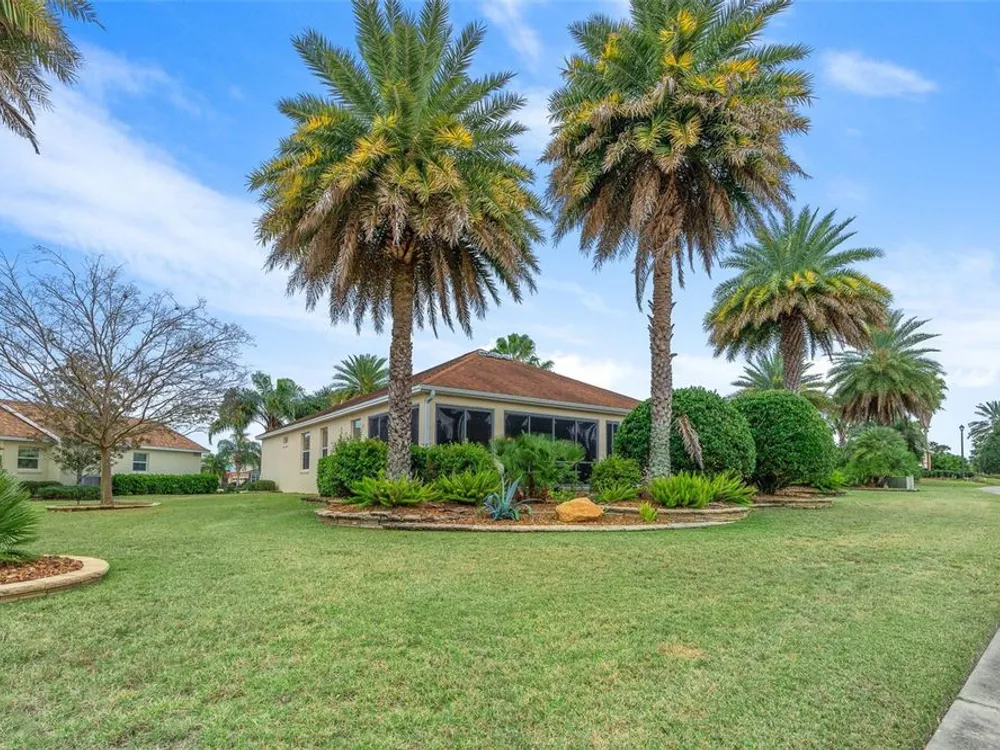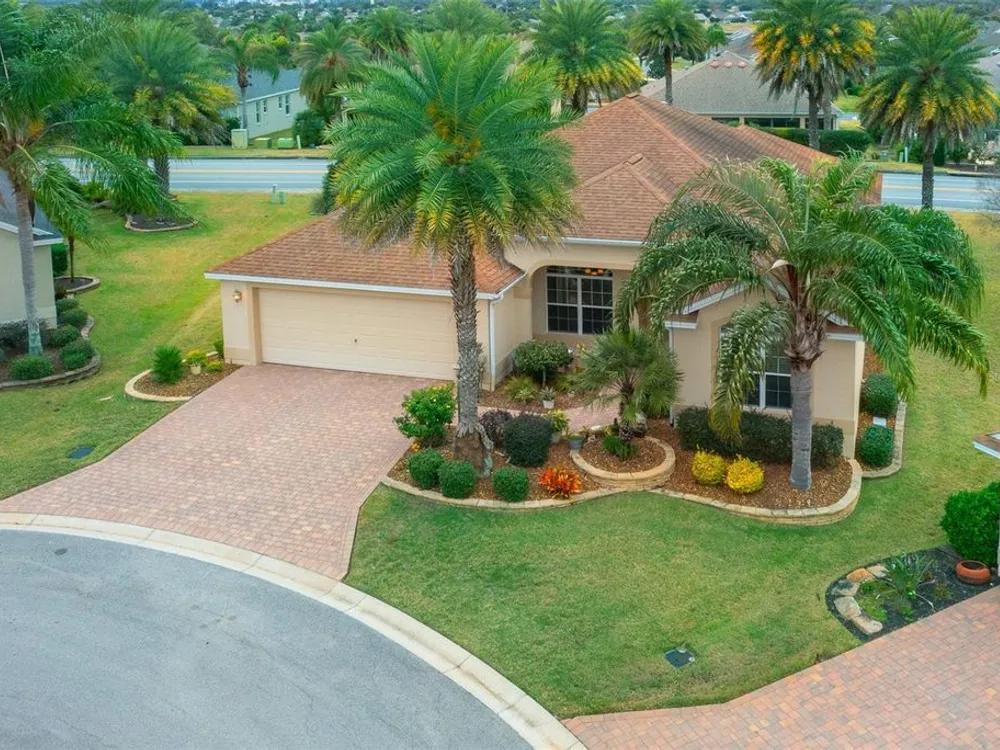 Welcome to the VILLAGE OF HEMINGWAY! This charming GARDENIA MODEL is perfectly situated on a peaceful CUL-DE-SAC and just a short GOLF CART RIDE from LAKE SUMTER LANDING’S SHOPPING AND DINING. Step into a bright interior featuring THREE SPACIOUS BEDROOMS, each with its own closet. The OVERSIZED GARAGE has room for your cars and golf cart, plus you'll love the expansive ACRYLIC ENCLOSED LANAI—ideal for relaxing or entertaining. The kitchen is equipped with STAINLESS STEEL APPLIANCES and CORIAN COUNTERTOPS, seamlessly flowing into the open LIVING AREA with VAULTED CEILINGS. The PRIMARY SUITE is a true getaway, complete with sliders to the lanai and an EN-SUITE BATH. Enjoy a SPLIT FLOOR PLAN for privacy, beautiful MATURE LANDSCAPING, and a PAVED DRIVEWAY that enhances the curb appeal. Additional perks include a brand new ROOF (2024), a 2020 HVAC SYSTEM, and a convenient LAUNDRY ROOM with a washer and dryer. OPTIONAL FURNITURE makes moving in a breeze! With the nearby TRUMAN RECREATION CENTER, COMMUNITY POOLS, multiple GOLF COURSES, scenic walking trails, and vibrant social clubs, this home offers the perfect blend of comfort and convenience.
