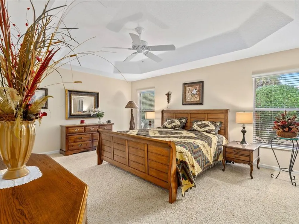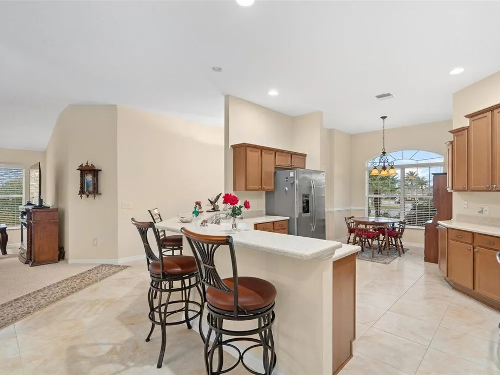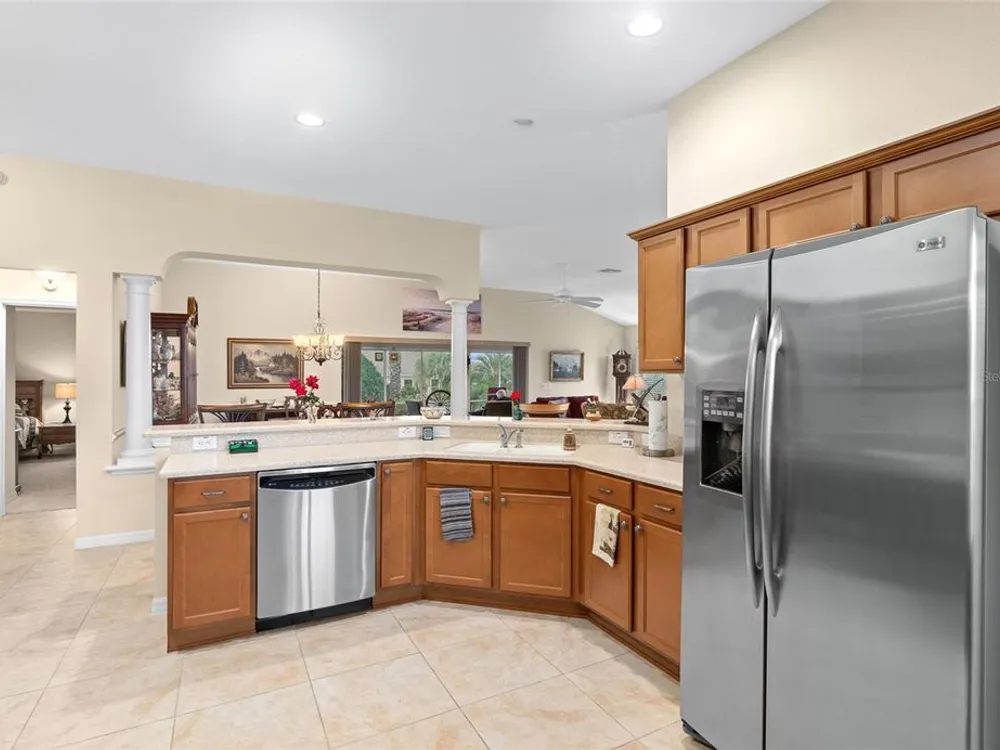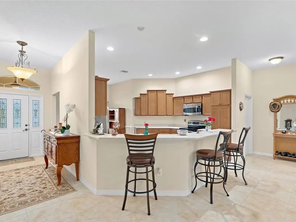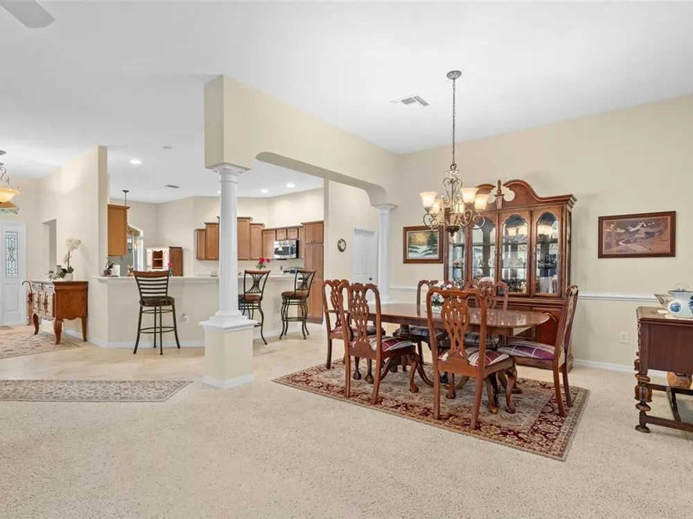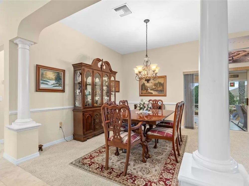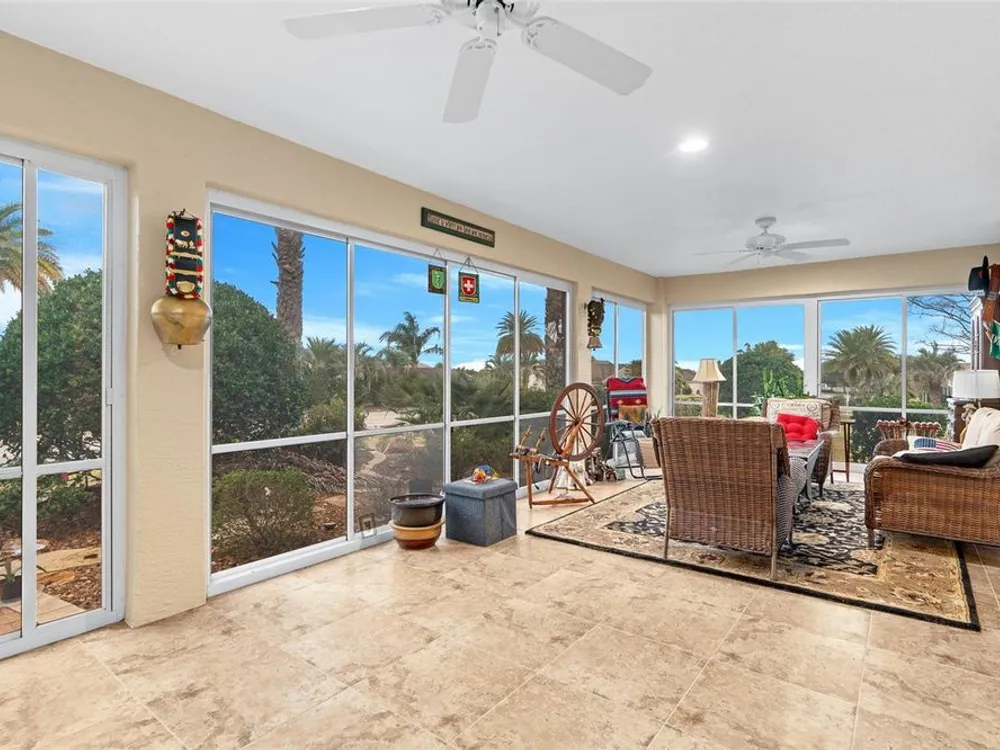 Welcome to the VILLAGE OF HEMINGWAY! This charming GARDENIA MODEL is perfectly situated on a peaceful CUL-DE-SAC and just a short GOLF CART RIDE from LAKE SUMTER LANDING’S SHOPPING AND DINING. Step into a bright interior featuring THREE SPACIOUS BEDROOMS, each with its own closet. The OVERSIZED GARAGE has room for your cars and golf cart, plus you'll love the expansive ACRYLIC ENCLOSED LANAI—ideal for relaxing or entertaining. The kitchen is equipped with STAINLESS STEEL APPLIANCES and CORIAN COUNTERTOPS, seamlessly flowing into the open LIVING AREA with VAULTED CEILINGS. The PRIMARY SUITE is a true getaway, complete with sliders to the lanai and an EN-SUITE BATH. Enjoy a SPLIT FLOOR PLAN for privacy, beautiful MATURE LANDSCAPING, and a PAVED DRIVEWAY that enhances the curb appeal. Additional perks include a brand new ROOF (2024), a 2020 HVAC SYSTEM, and a convenient LAUNDRY ROOM with a washer and dryer. OPTIONAL FURNITURE makes moving in a breeze! With the nearby TRUMAN RECREATION CENTER, COMMUNITY POOLS, multiple GOLF COURSES, scenic walking trails, and vibrant social clubs, this home offers the perfect blend of comfort and convenience.